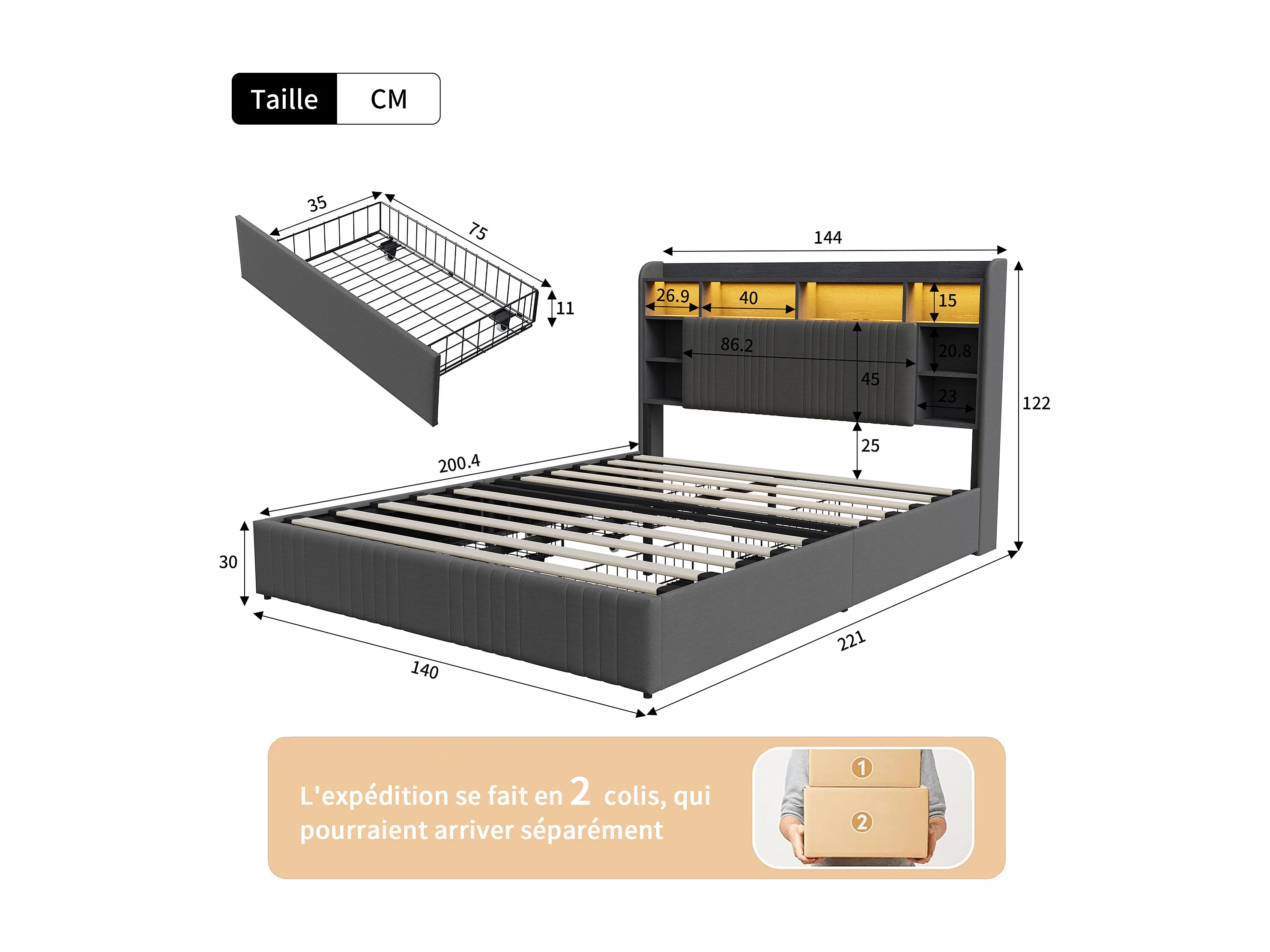 140 x 200 cm großes Bett mit 4 Schubladen, LED-Beleuchtung, USB-C-Anschluss, Nachttischen mit Stauraum, offenen Fächern und Lattenrost – Grau