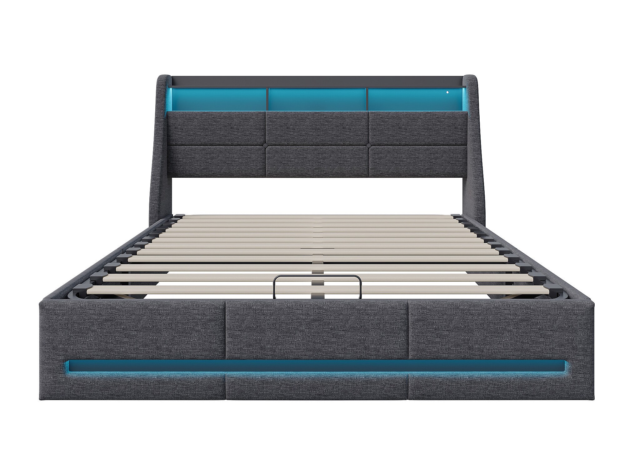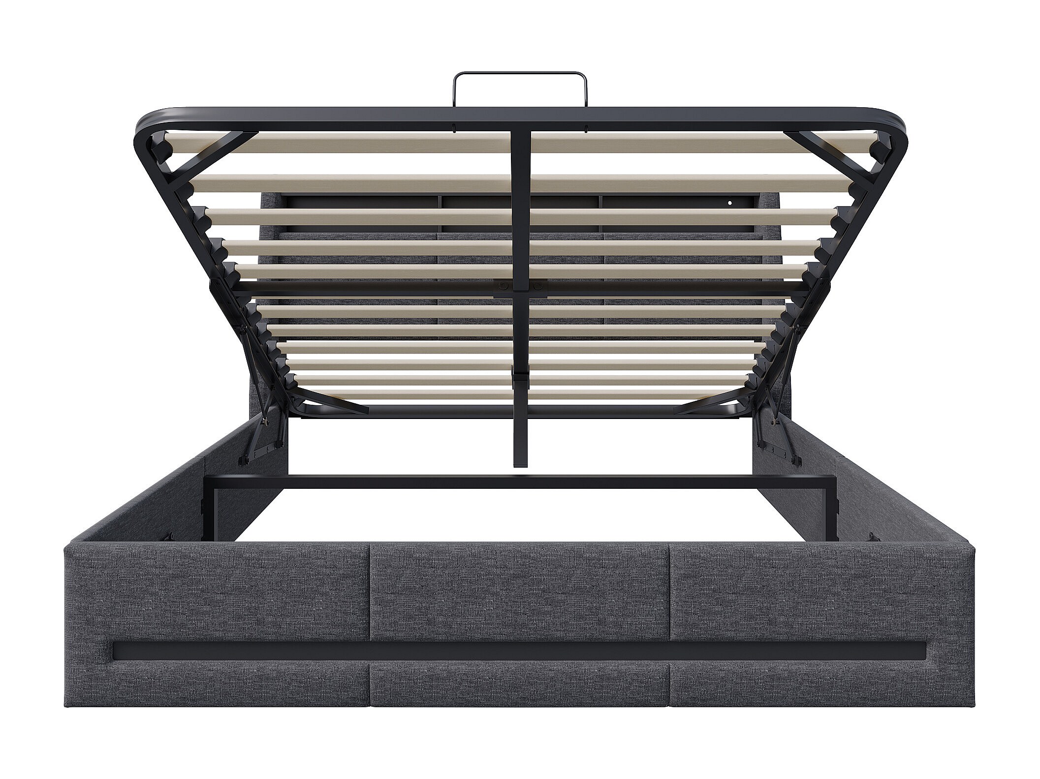 140x190 Bett mit LED und USB-Basis, Stauraumbett mit Kopfteil, Grau