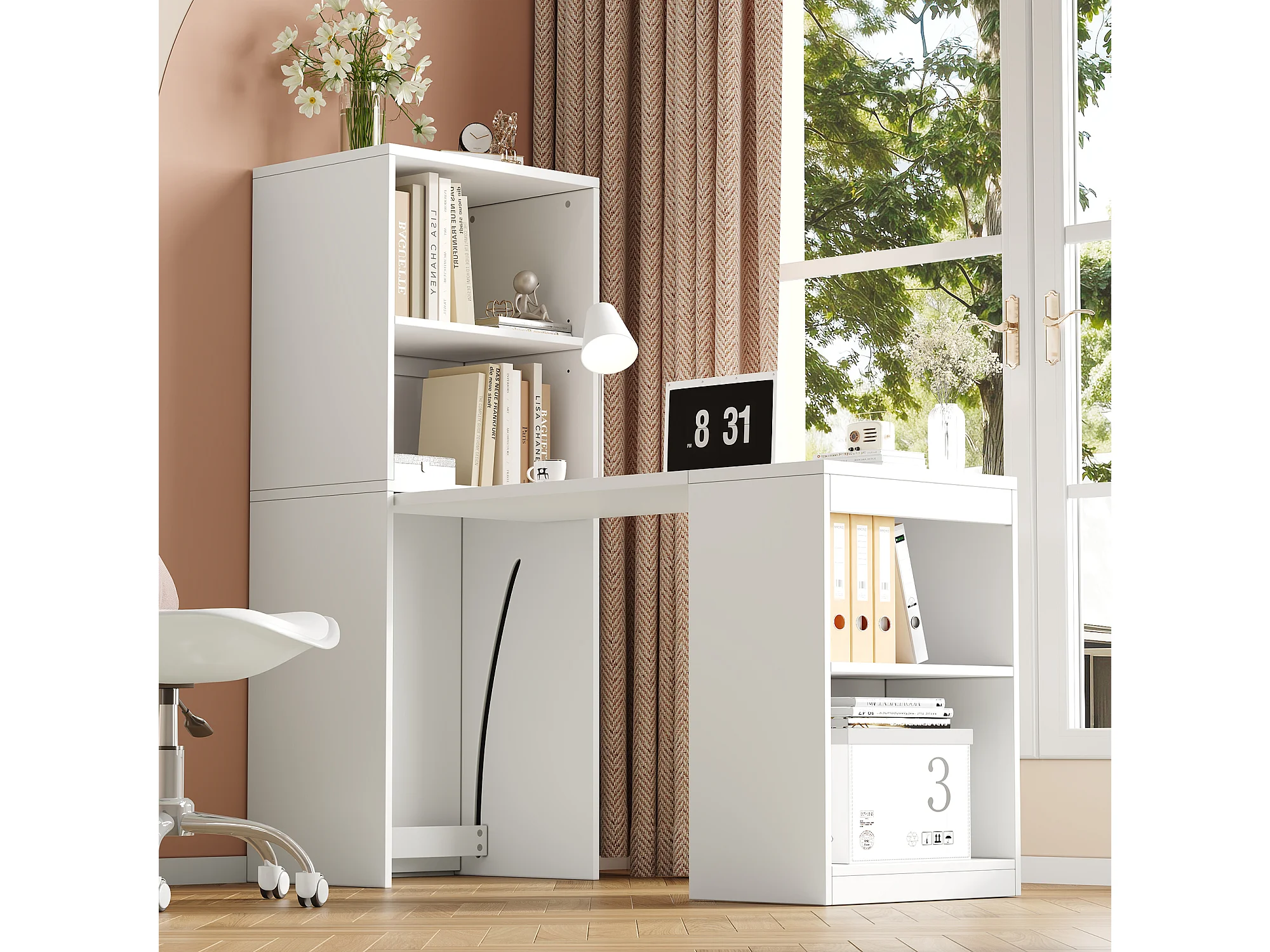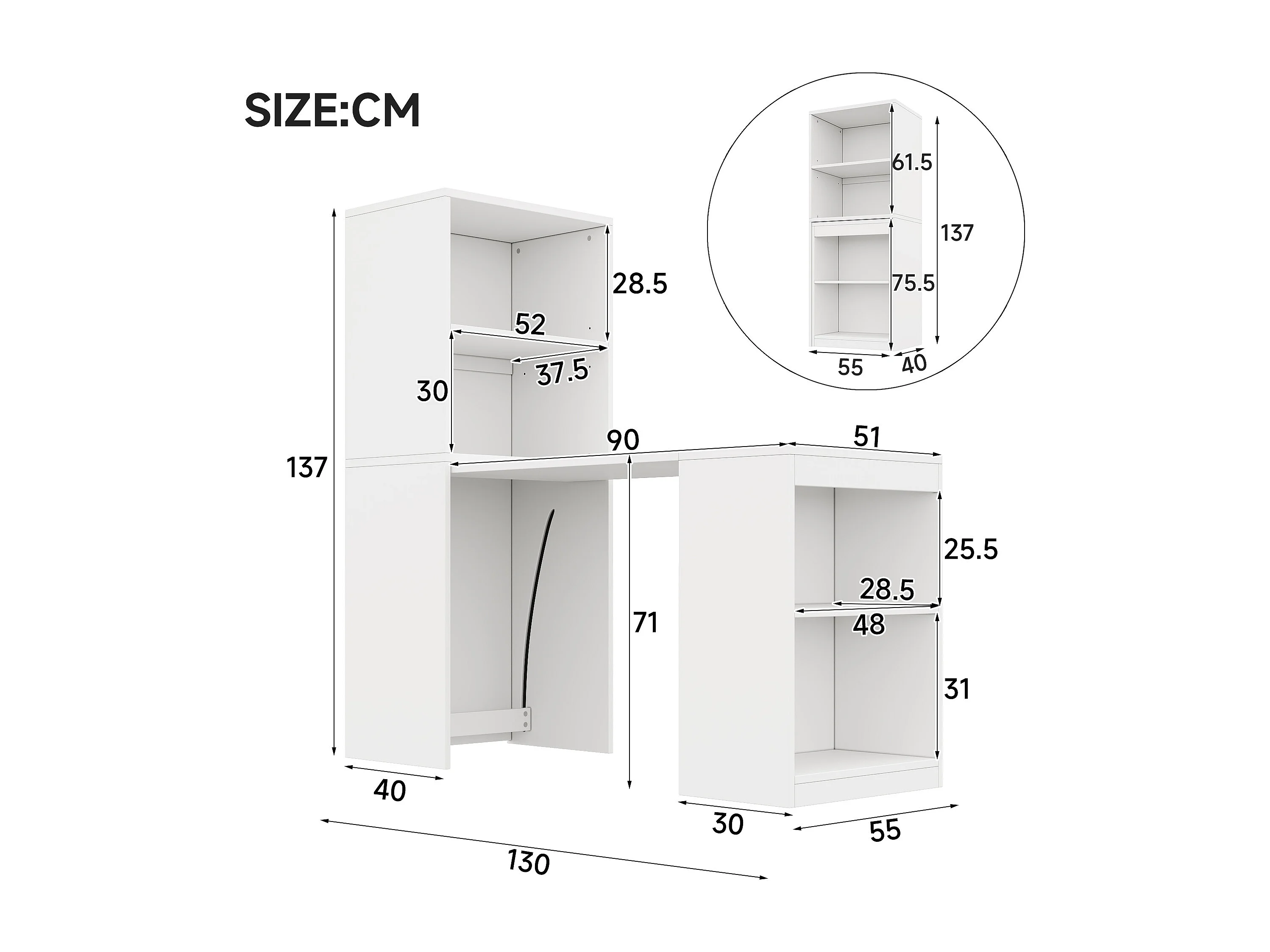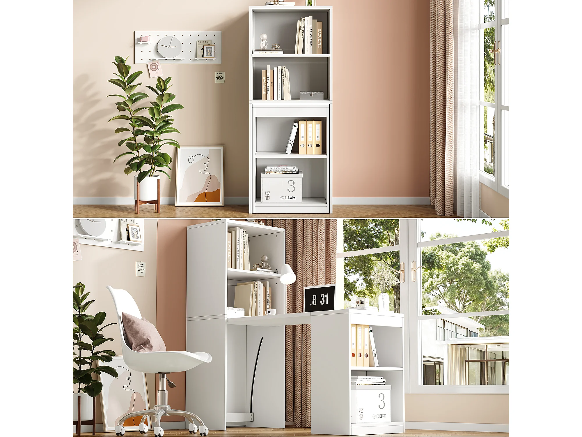 2-in-1 Klappschreibtisch und Schrank – 130 x 51 x 137 cm – mit 4 Ablagefächern – Spanplatte – Weiß