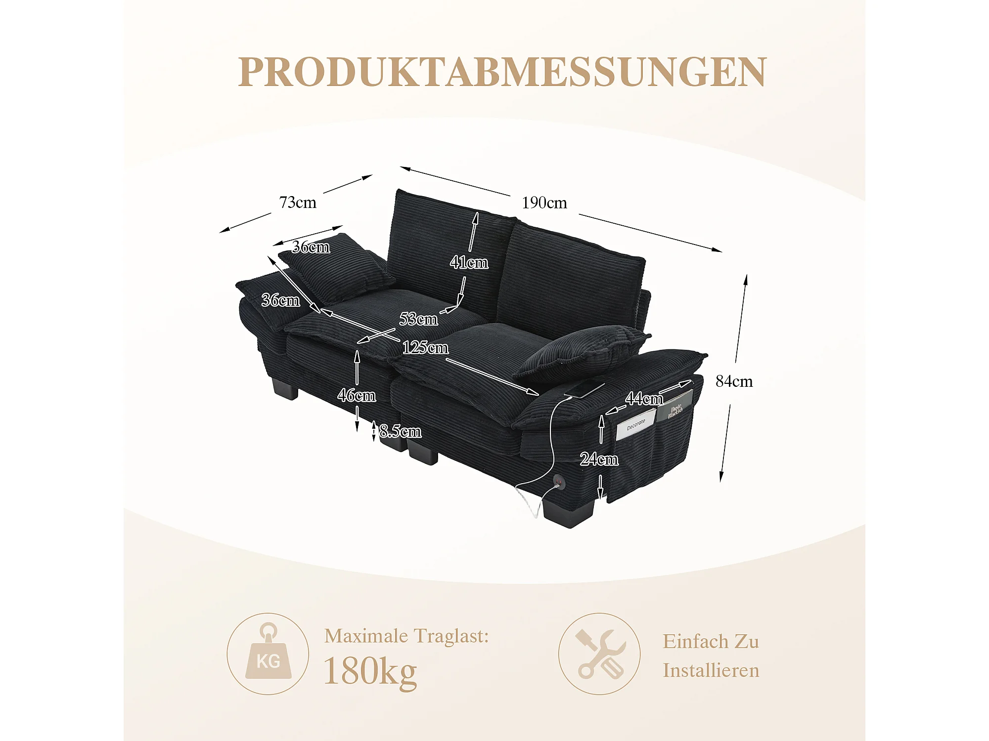2-Sitzer-Cordsofa – 190 x 73 x 84 cm – mit USB-Anschluss und Taschen – Schaumstoffpolsterung – schwarz