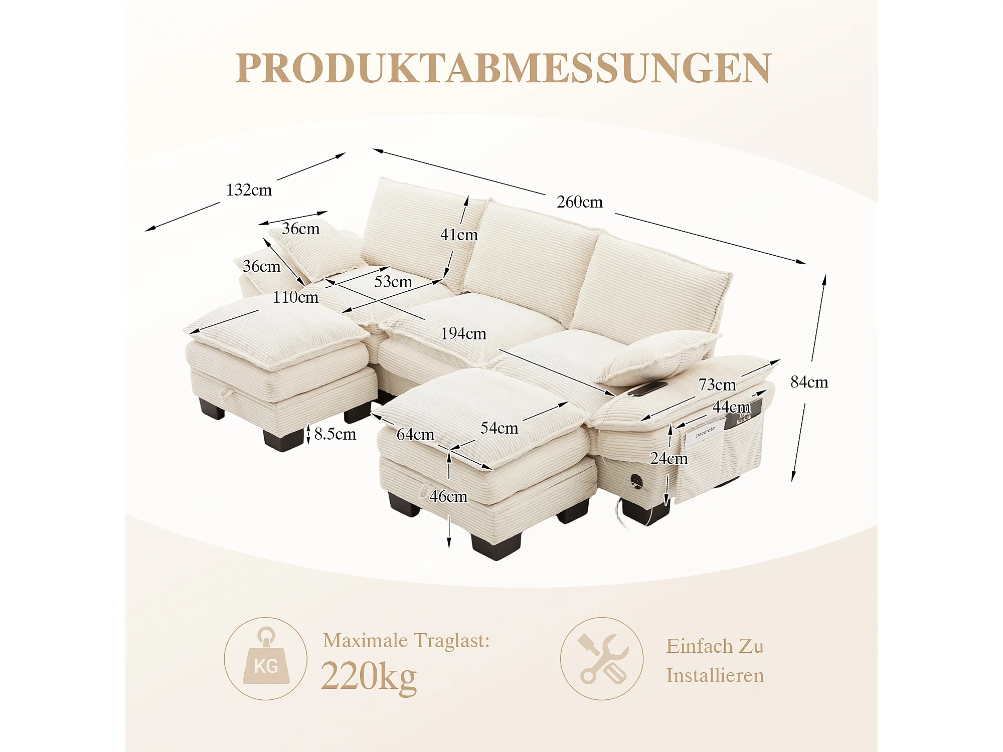 3-Sitzer-Cordsofa-Set – 260 x 132 x 84 cm – mit 2 Aufbewahrungshockern, USB-Anschluss und Taschen – beige