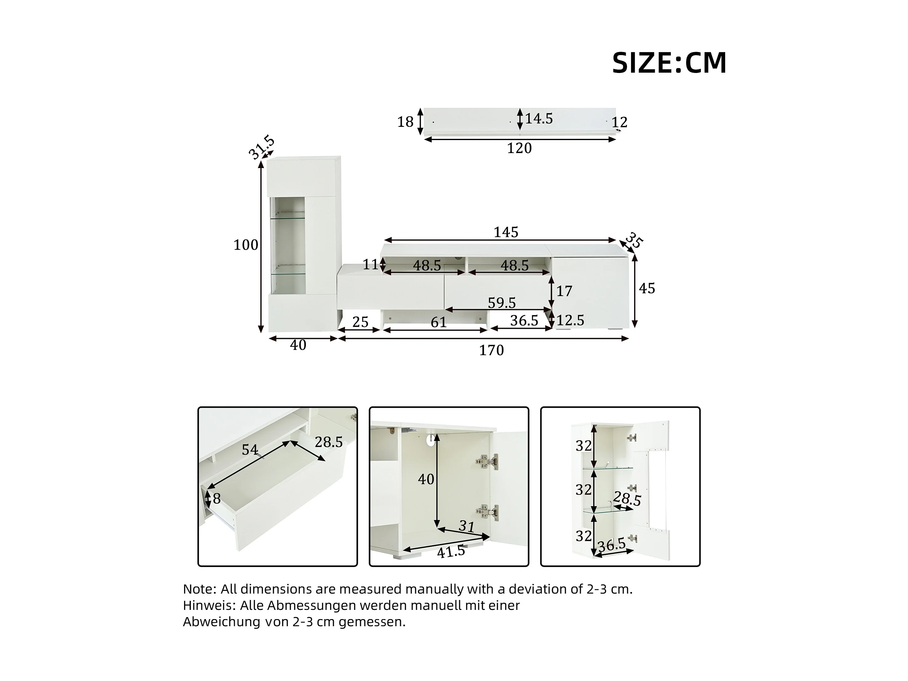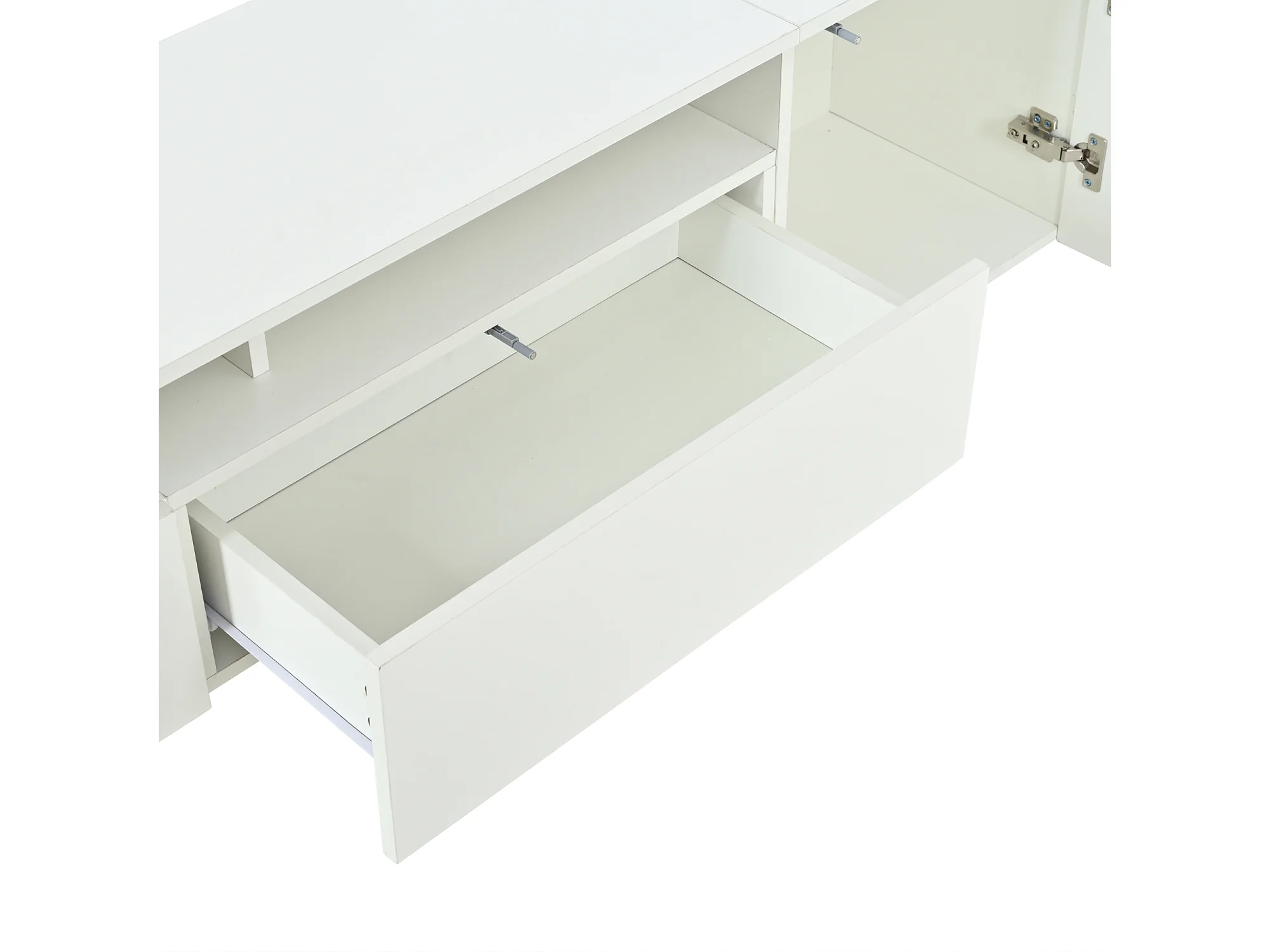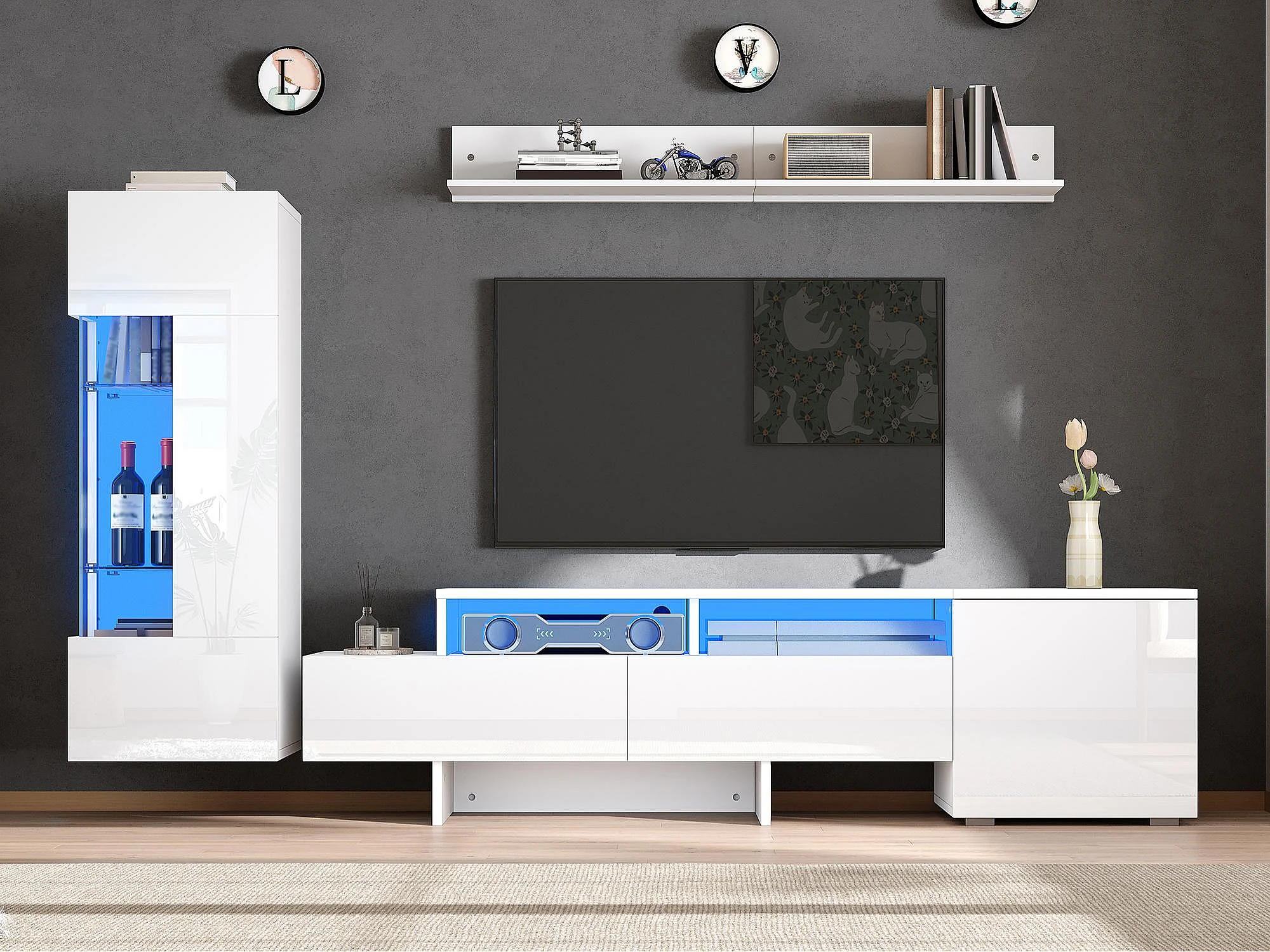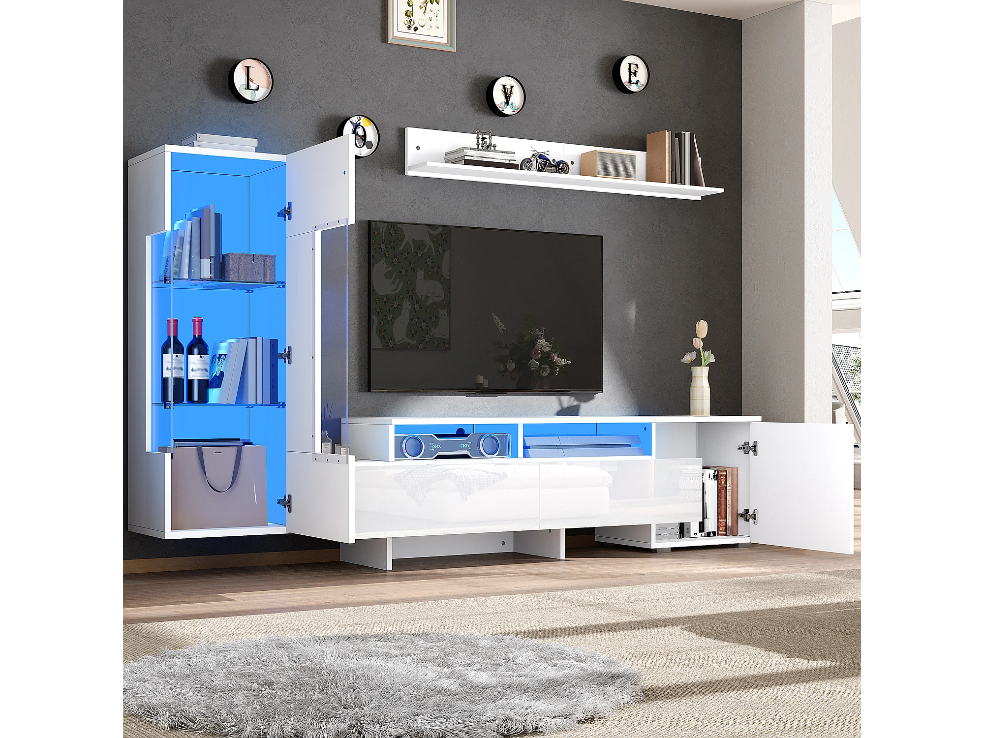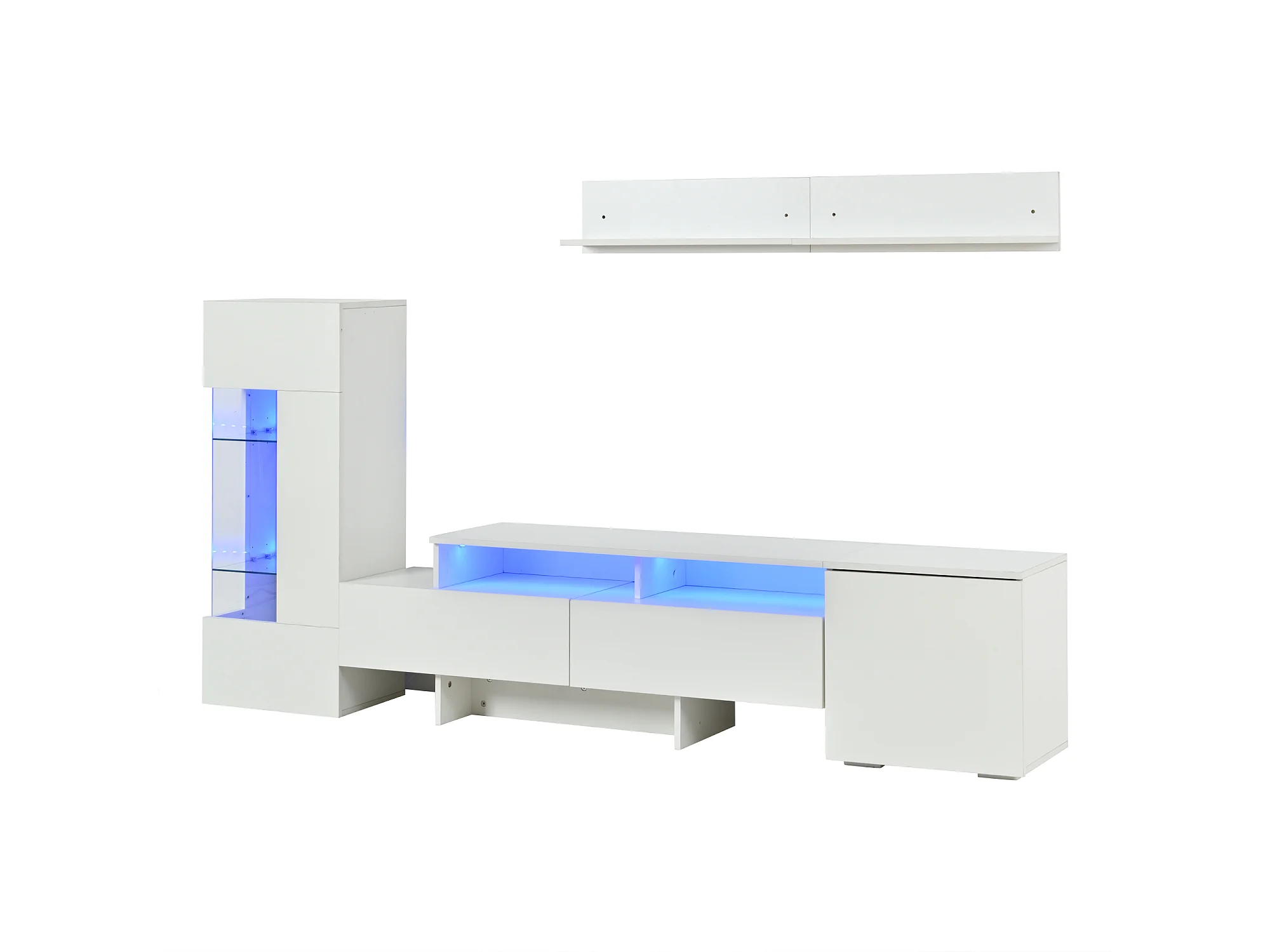 3-teiliger TV-Möbelsatz - TV-Schrank + Vitrine + Wandregal - LED-Beleuchtung - 2 Türen + 2 Schubladen - Hochglanz-Oberfläche - Weiß