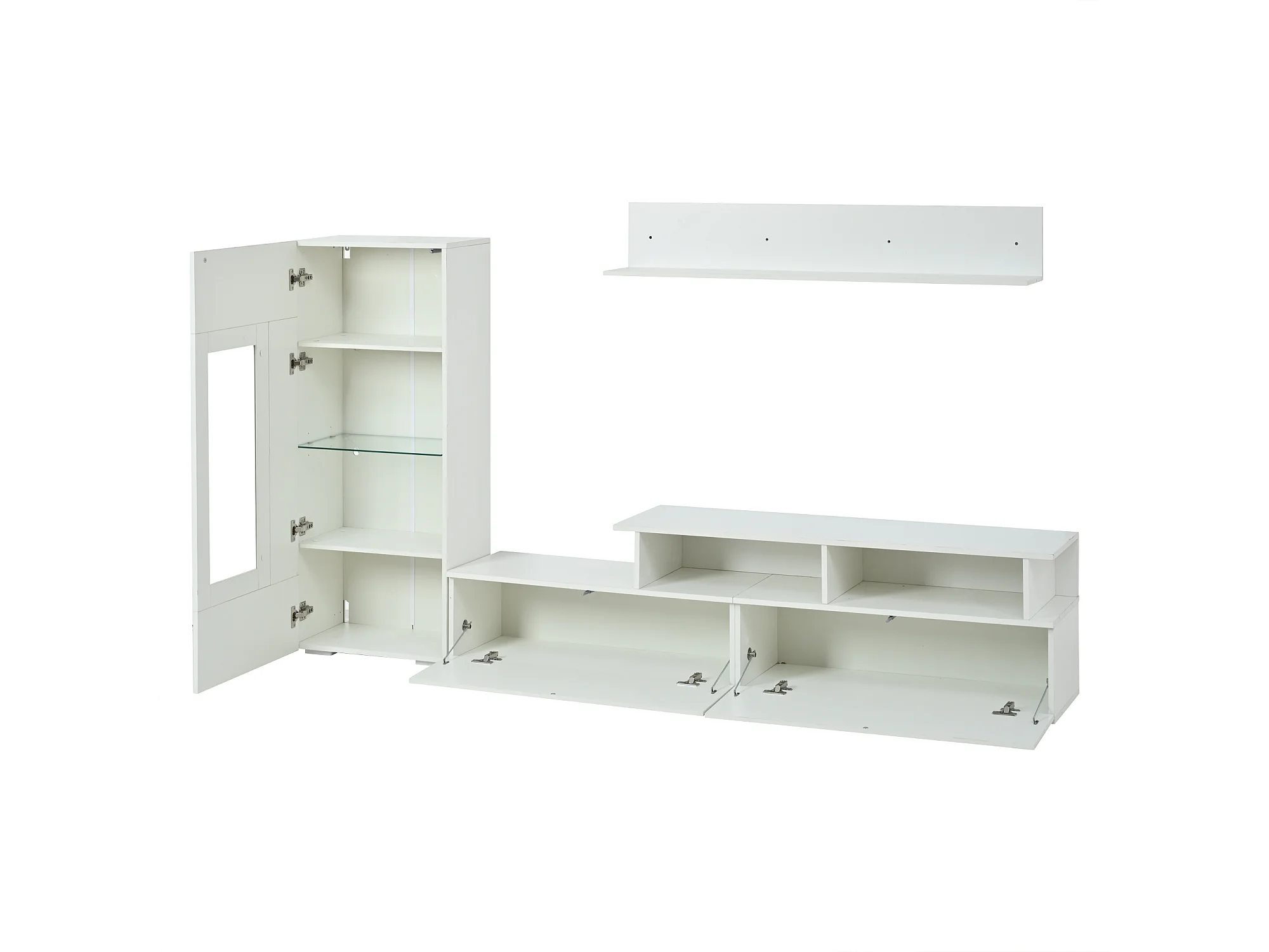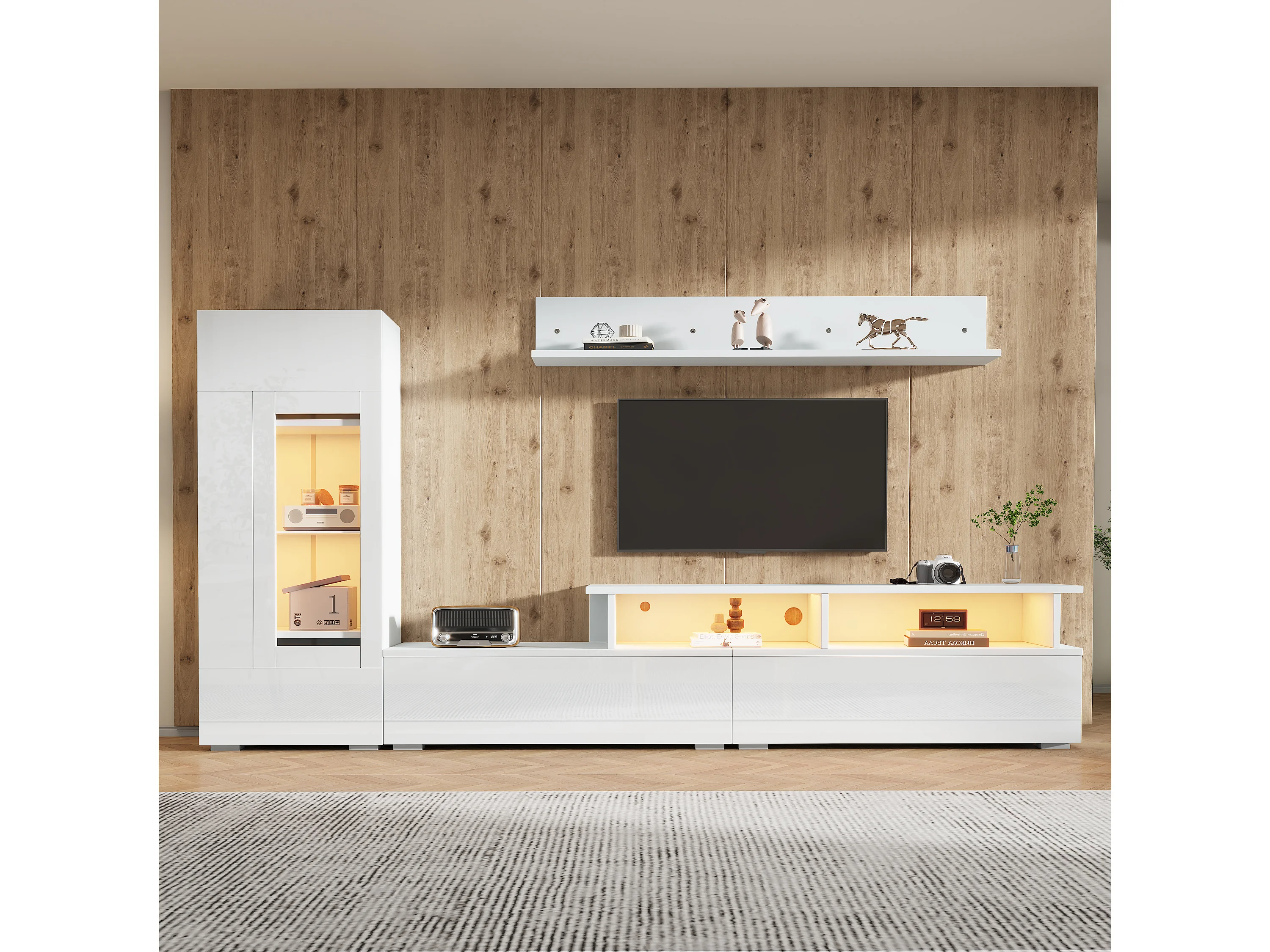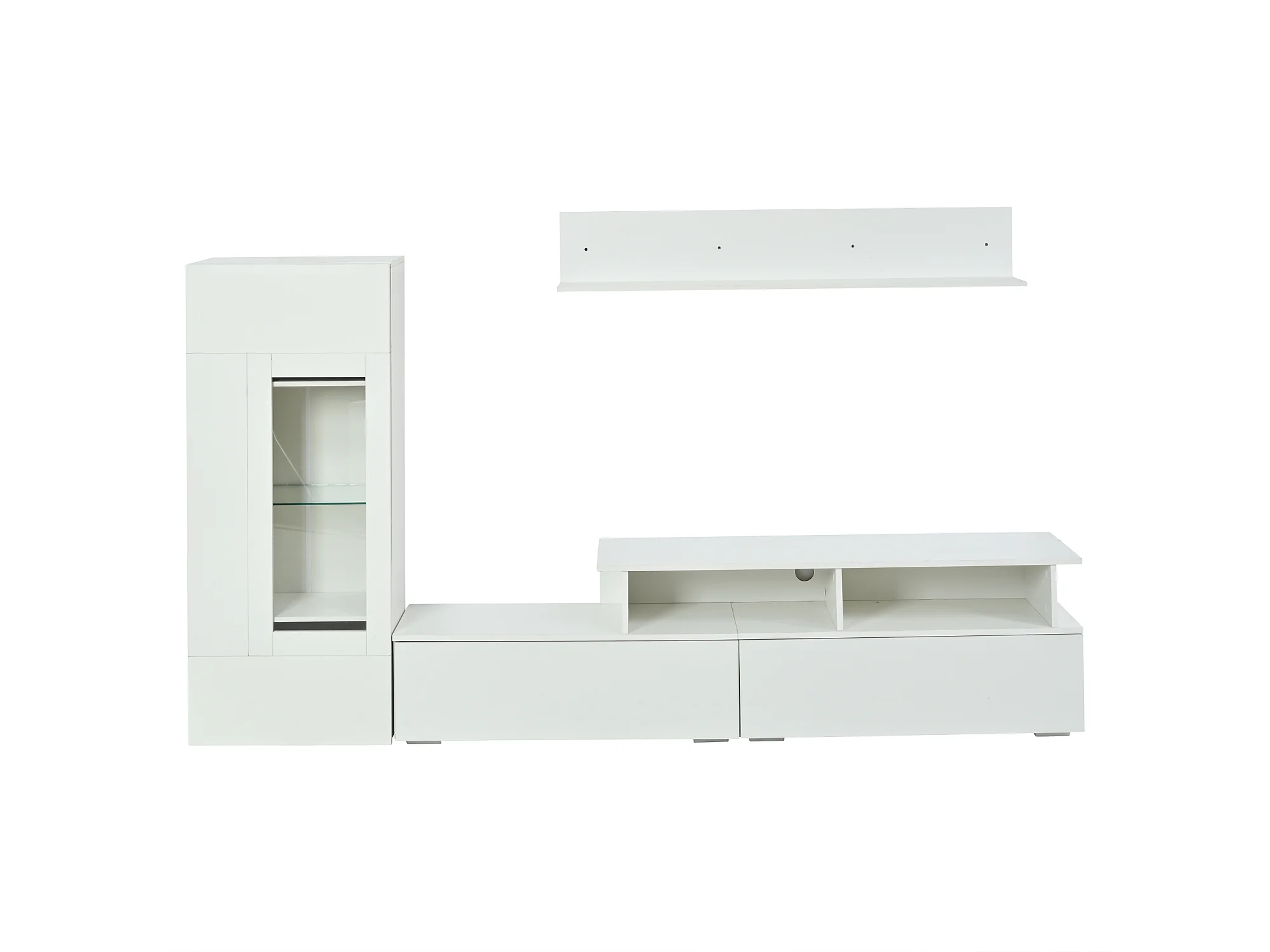 3-teiliger TV-Möbelsatz - TV-Schrank + Vitrine + Wandregal - mit LED-Beleuchtung - Hochglanzlack-Oberfläche - weiß