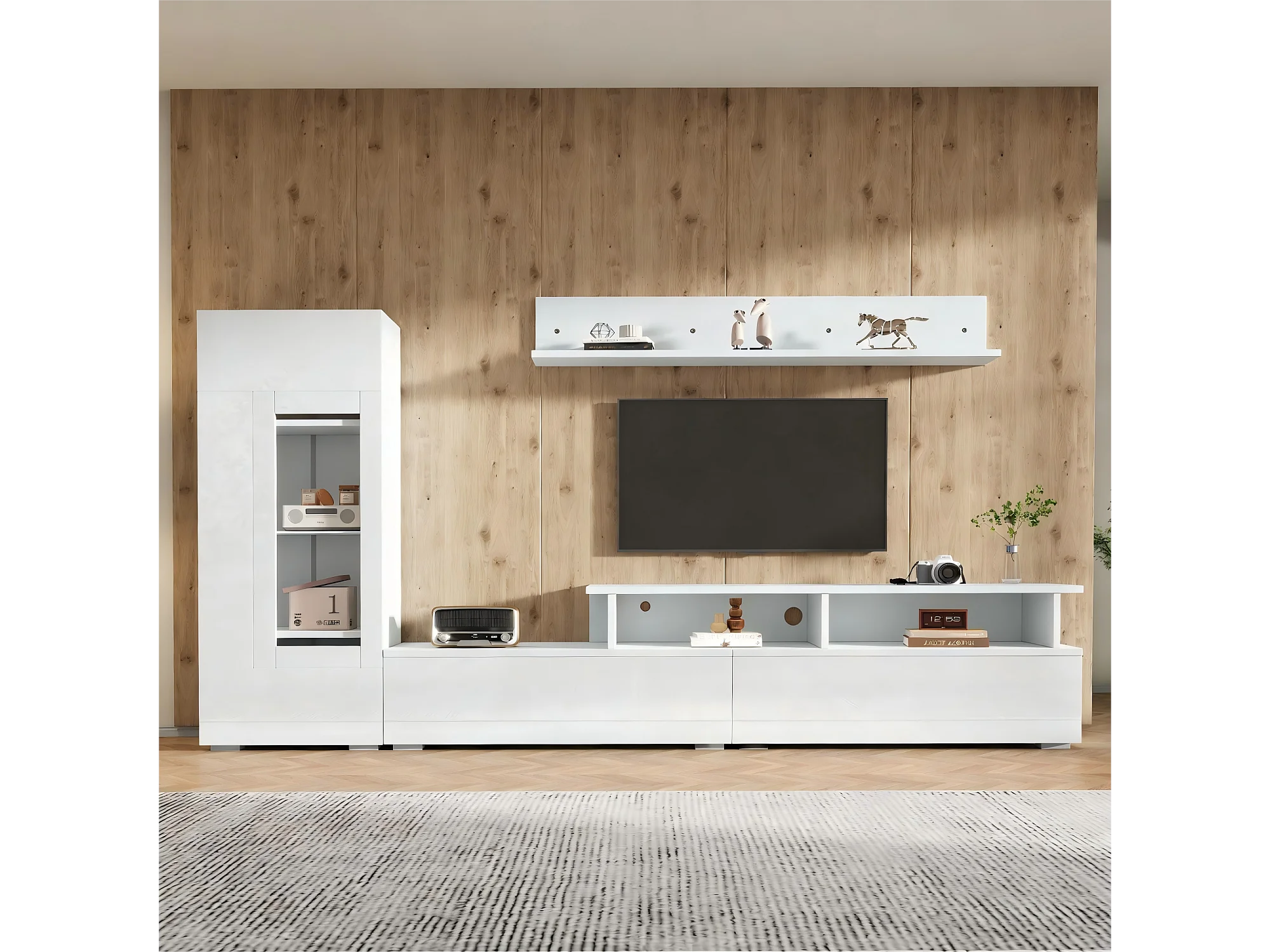 3-teiliges Wandmöbelset – Hochglanzlack – mit TV-Möbel, Vitrine, Wandregal und LED-Beleuchtung – Spanplatte – weiß