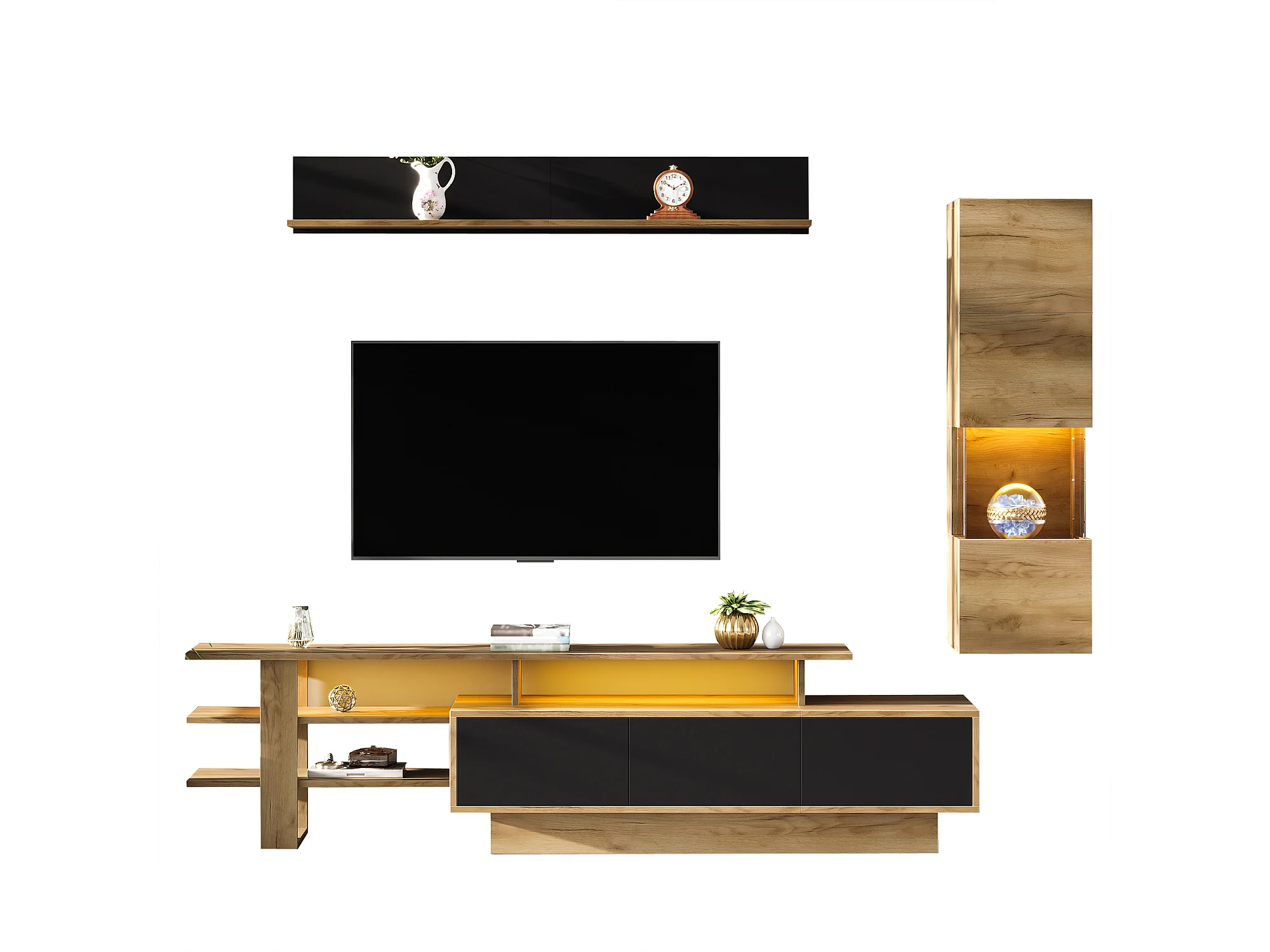 3-teiliges Wohnzimmer-Möbelset – mit TV-Ständer, Vitrine, Wandregal, 3 Schubladen und LED-Beleuchtung – Acryl + MDF – Natur + Schwarz