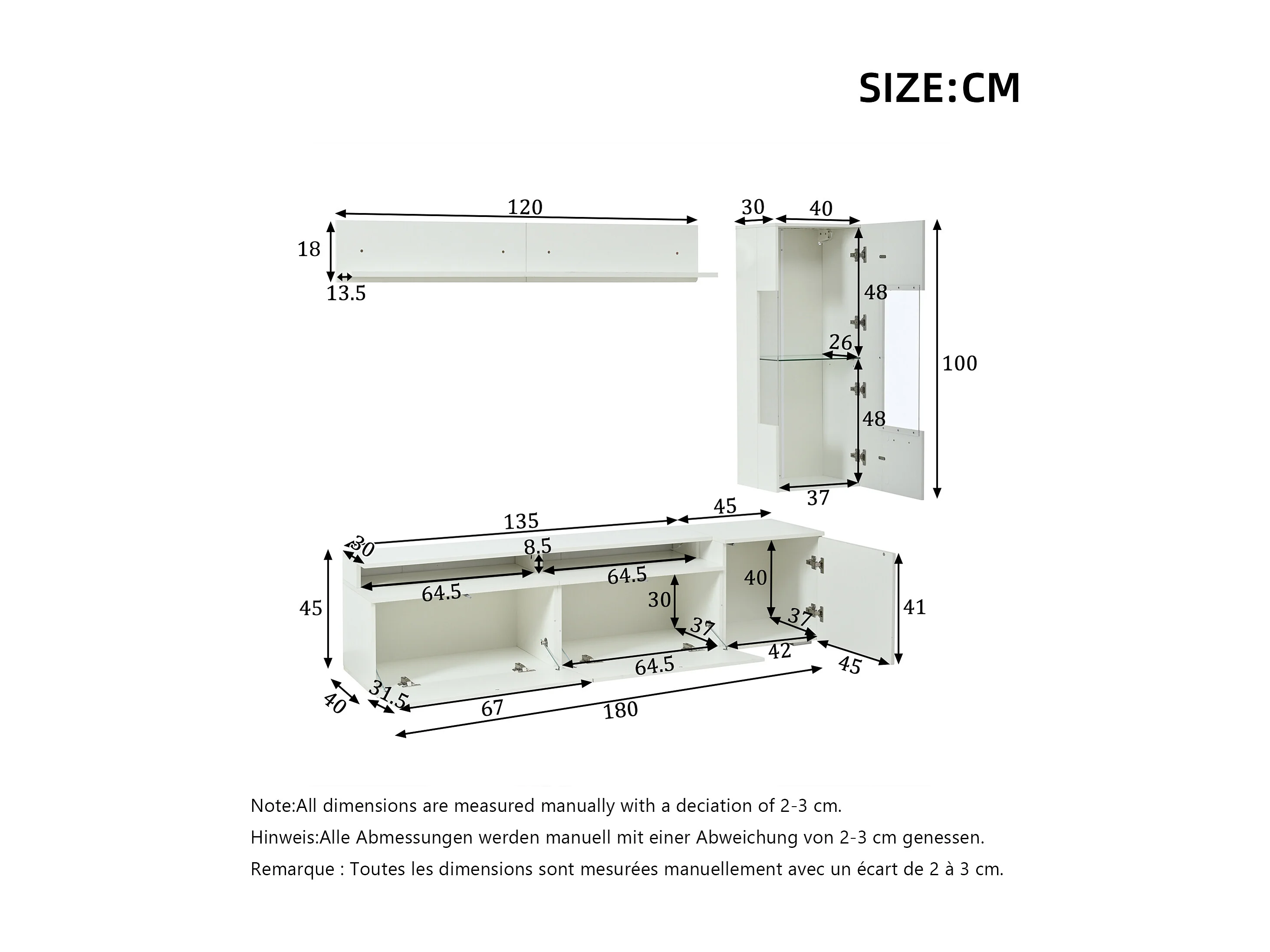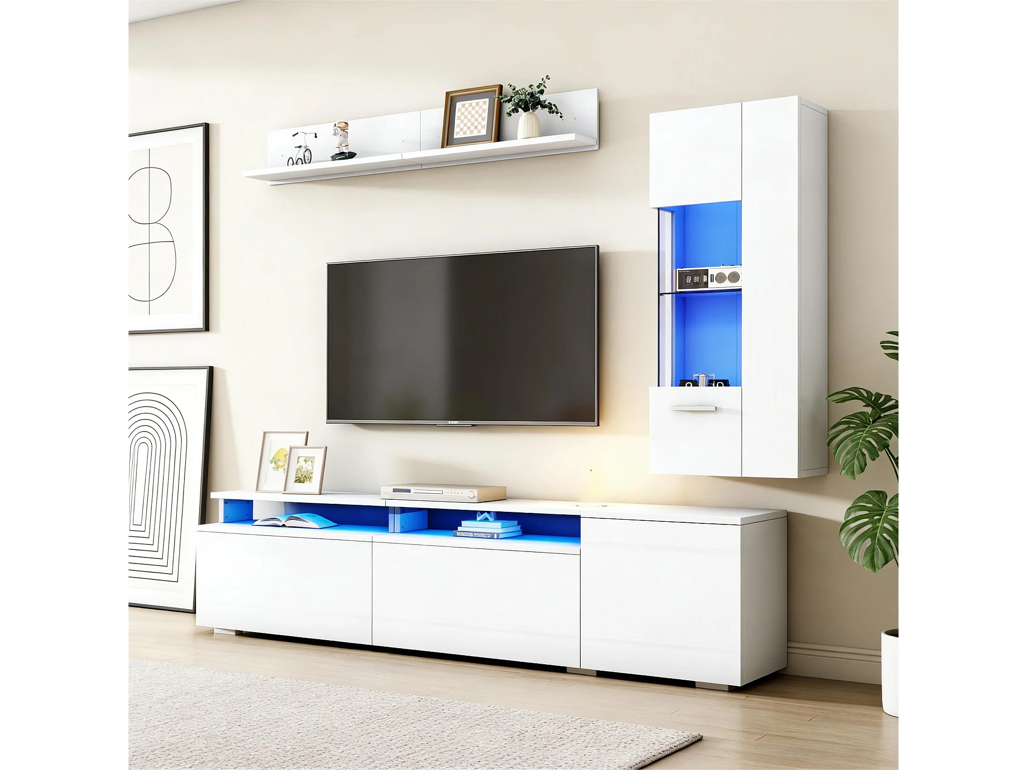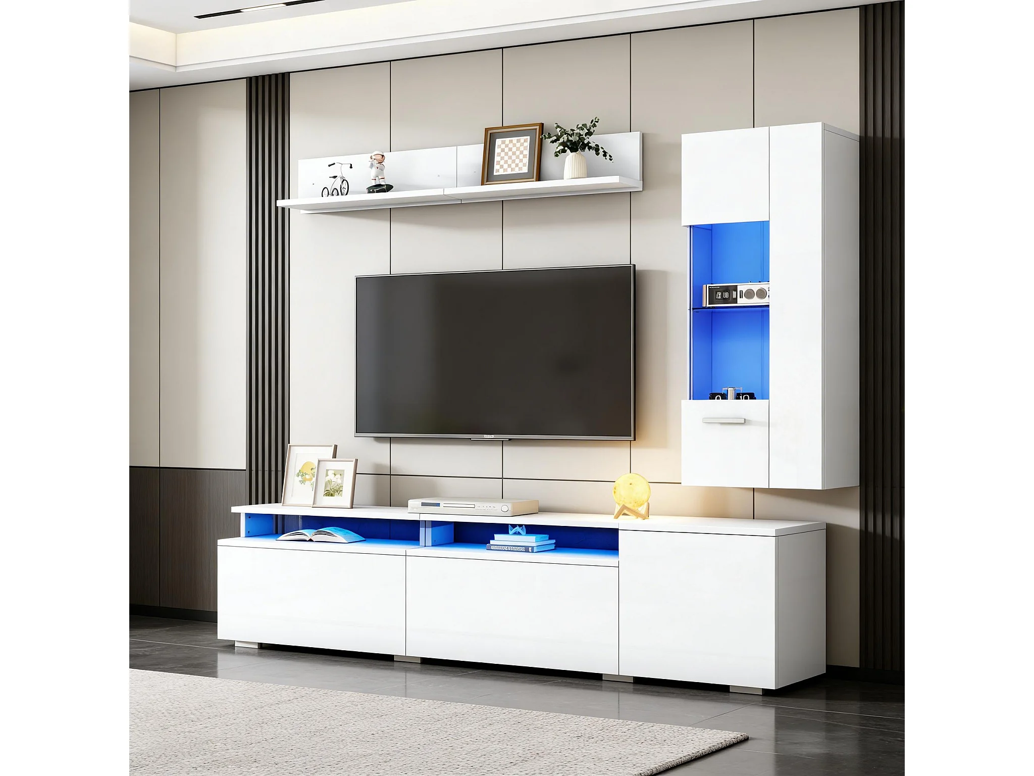 3-teiliges Wohnzimmer-Möbelset – mit TV-Ständer, Vitrine, Wandregal und LED-Beleuchtung – Acryl + MDF – weiß