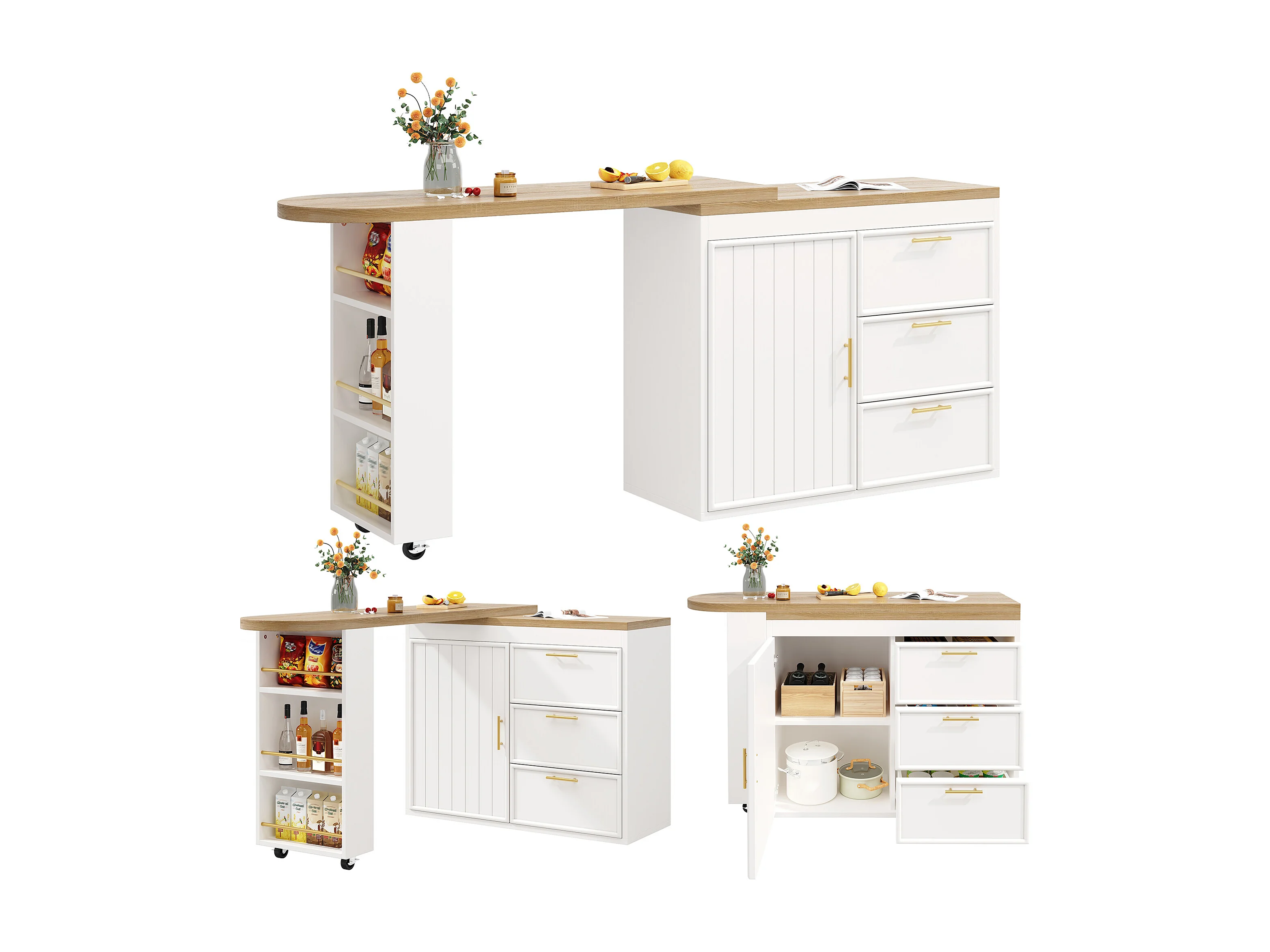 360° drehbarer Bartisch – 128/203 x 39 x 90 cm – mit Ablagen, 3 Schubladen und Tür – MDF und Metall – weiß