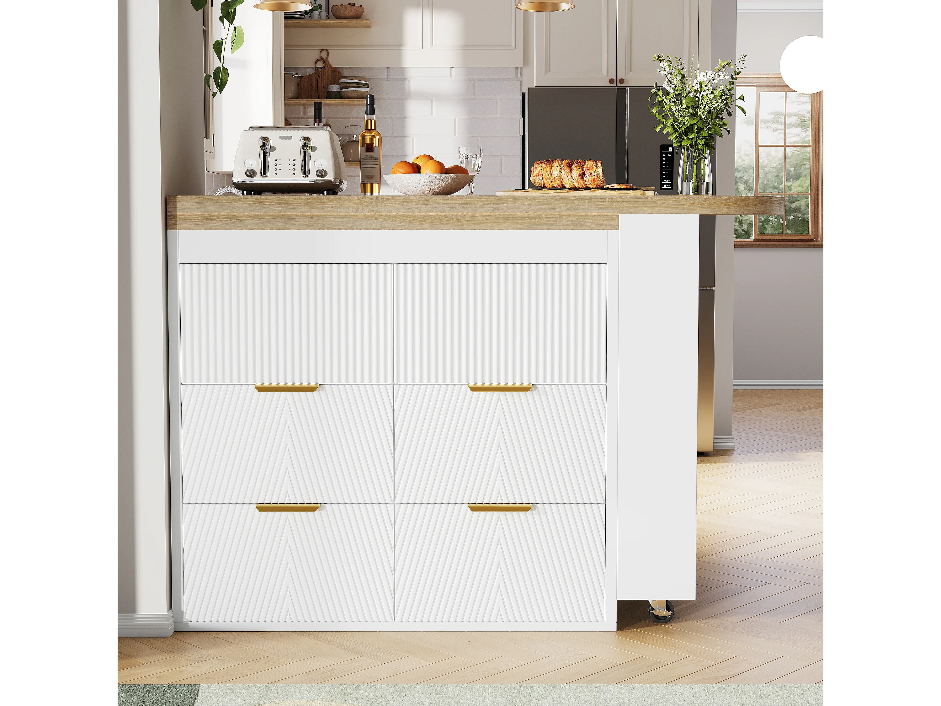 360° drehbarer Bartisch – 128/203 x 39 x 90 cm – mit Ablagen und 6 Schubladen – MDF und Metall – weiß