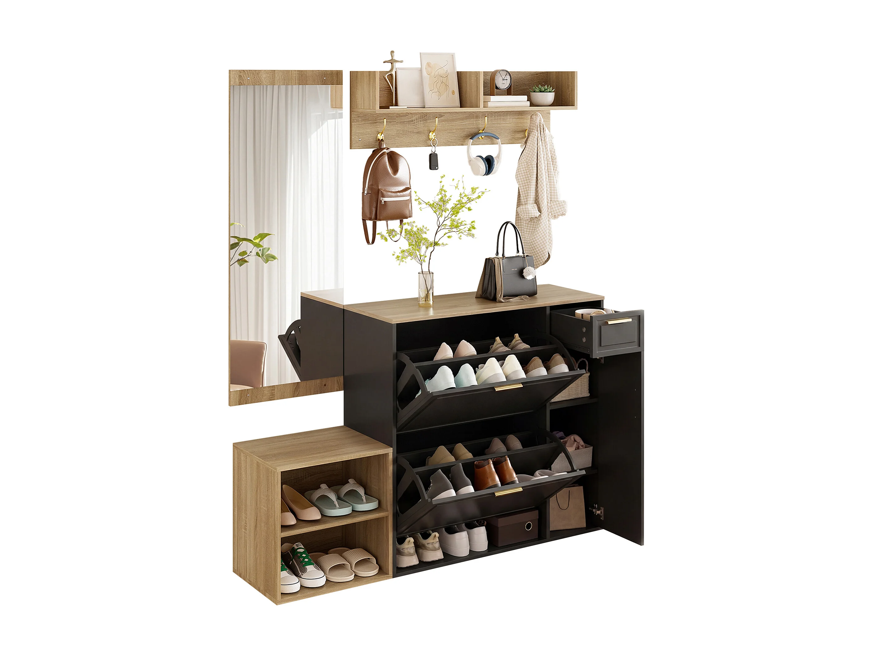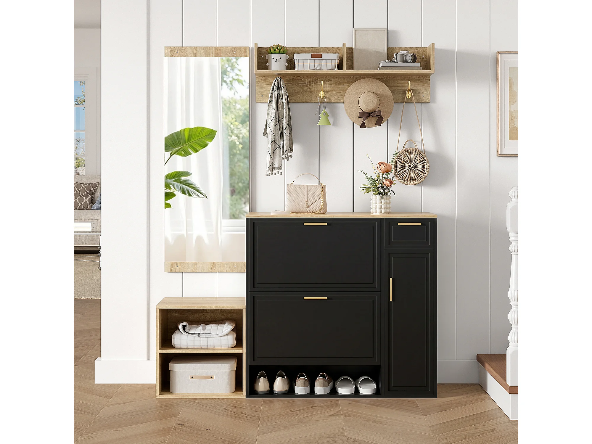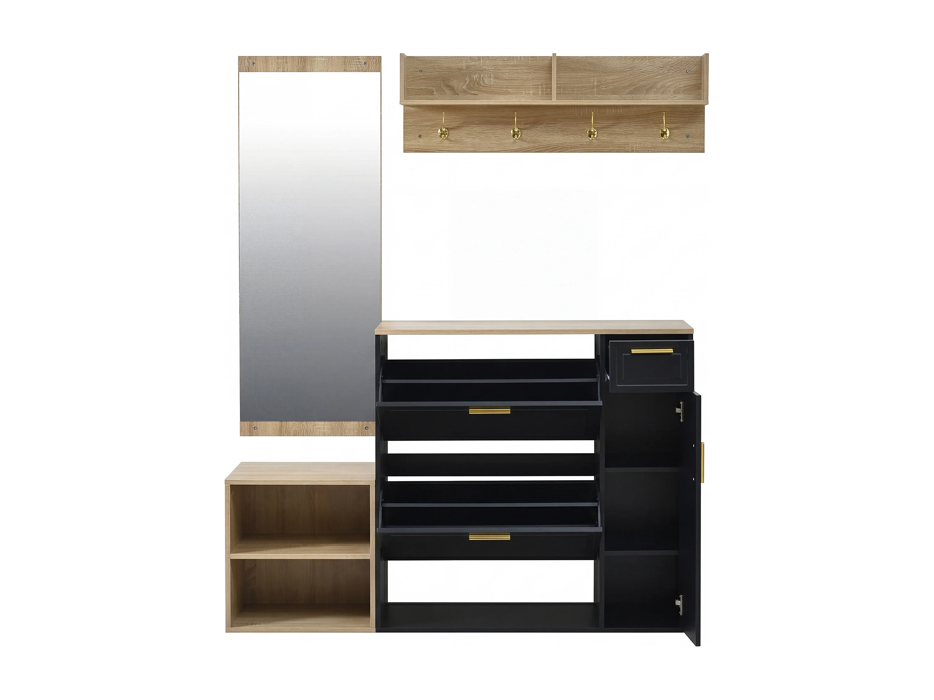 4-teilige Garderobengarnitur für den Eingangsbereich – mit Schuhschrank, Sitzbank, Wandgarderobe und Spiegel – Spanplatte – schwarz + natur