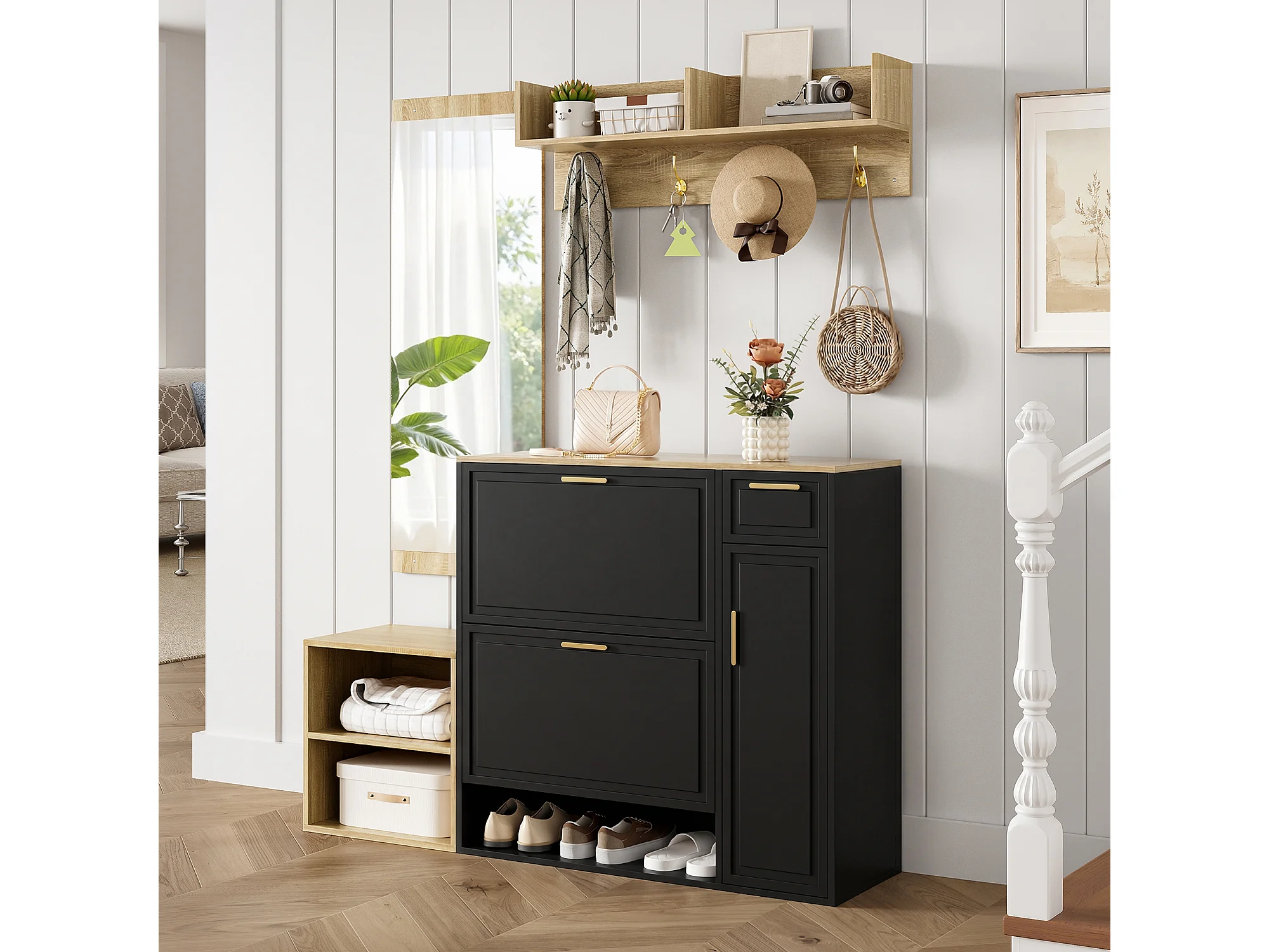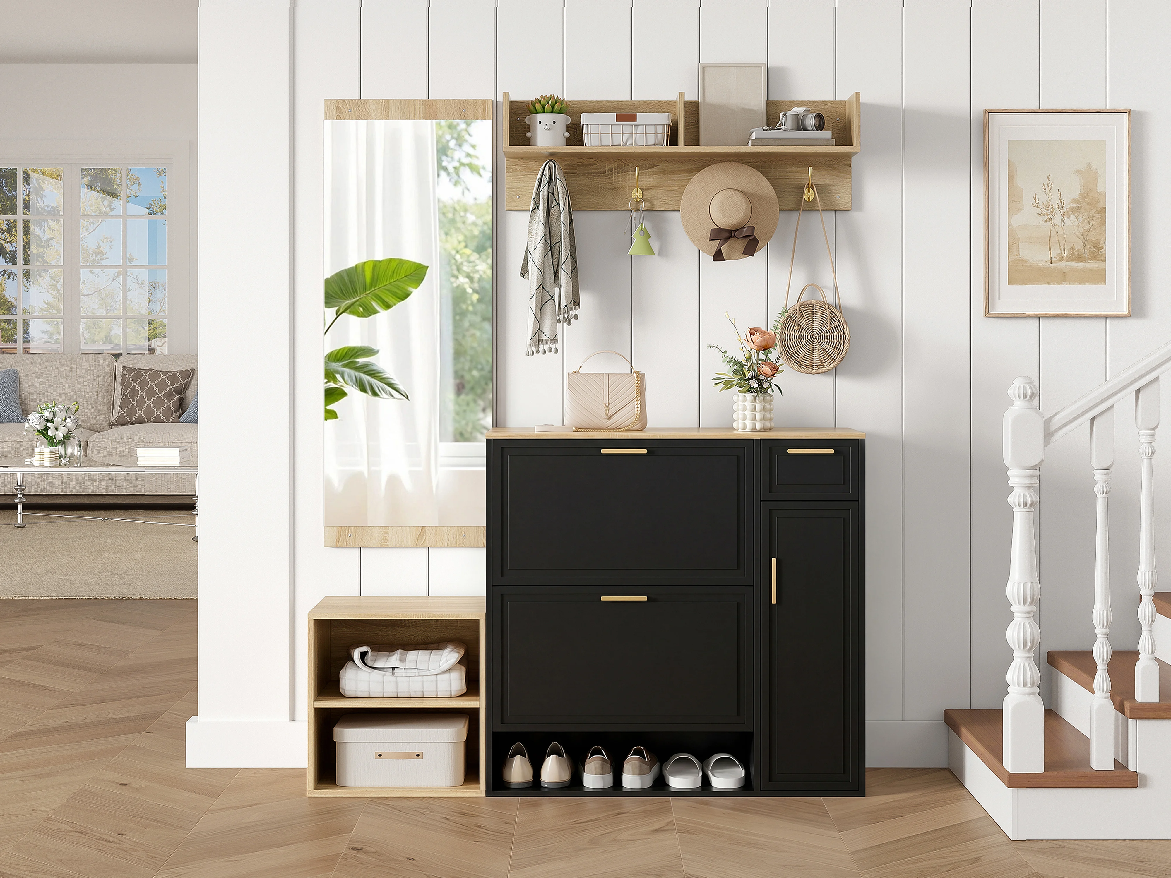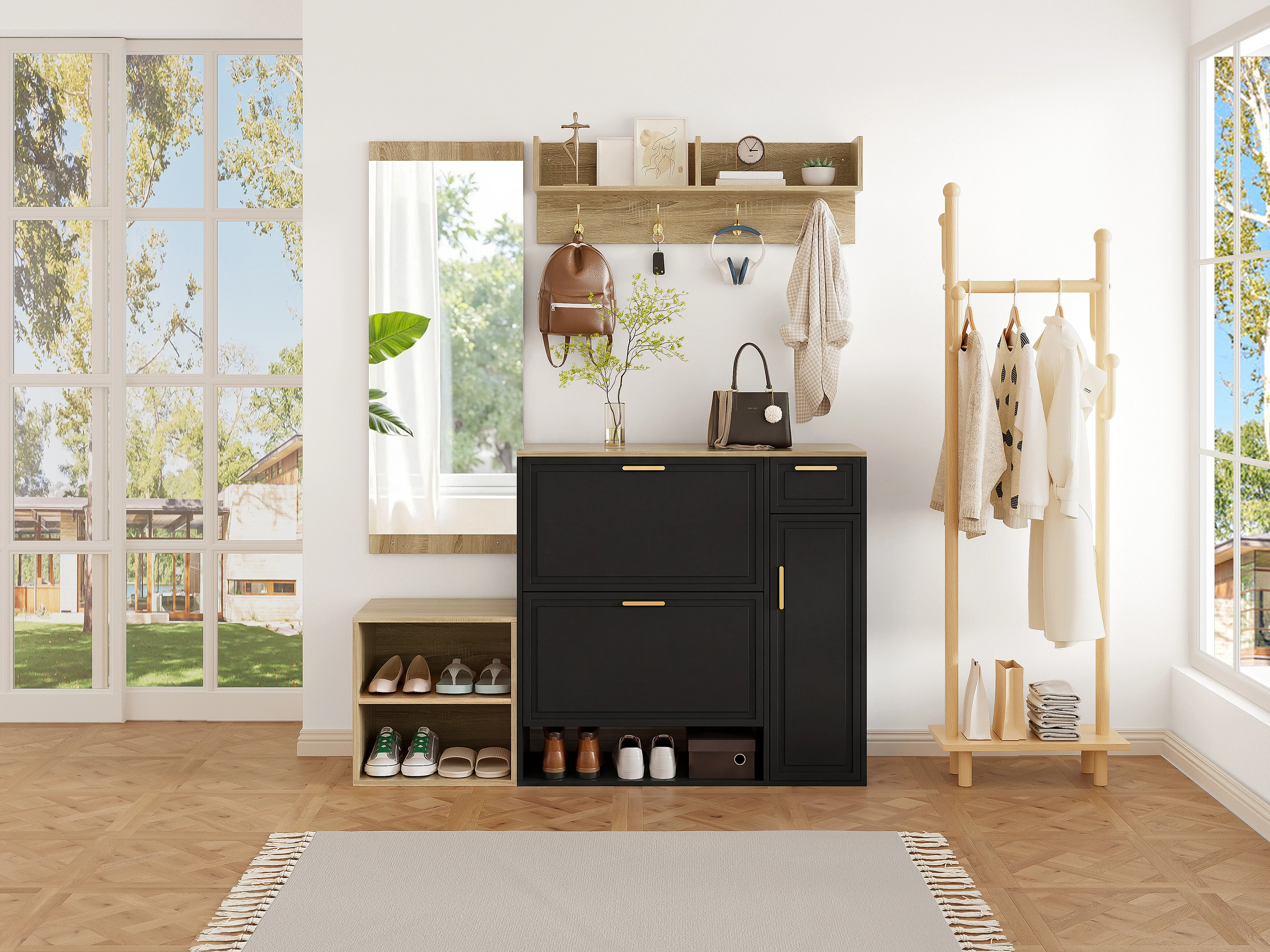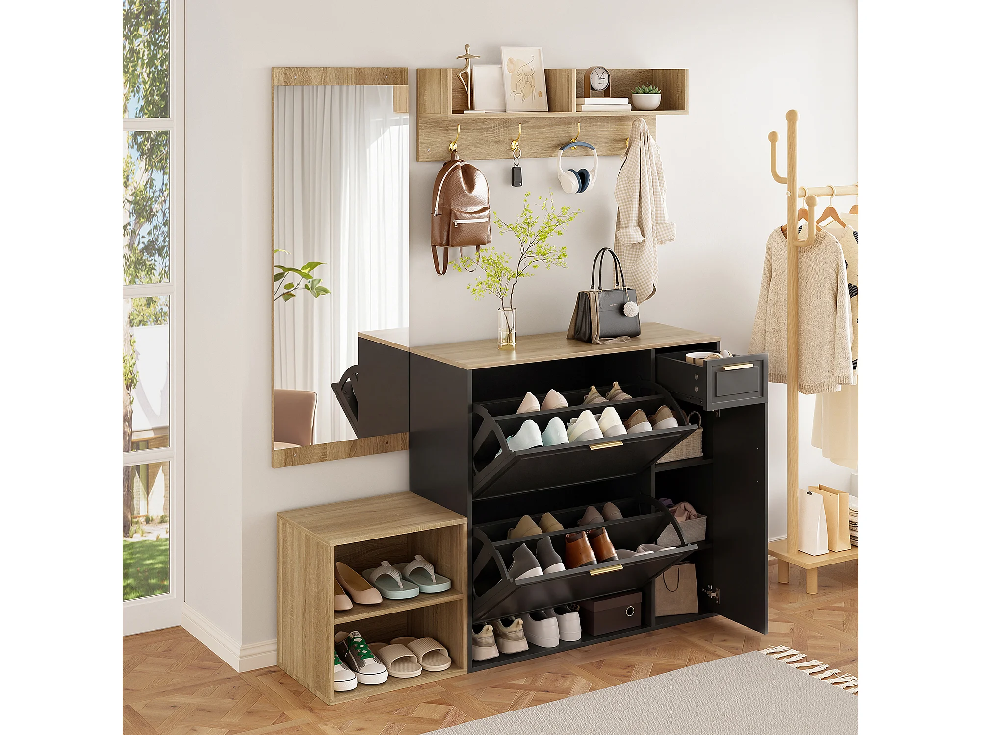 4-teilige Garderobengarnitur für den Eingangsbereich – mit Schuhschrank, Sitzbank, Wandgarderobe und Spiegel – Spanplatte – schwarz + natur