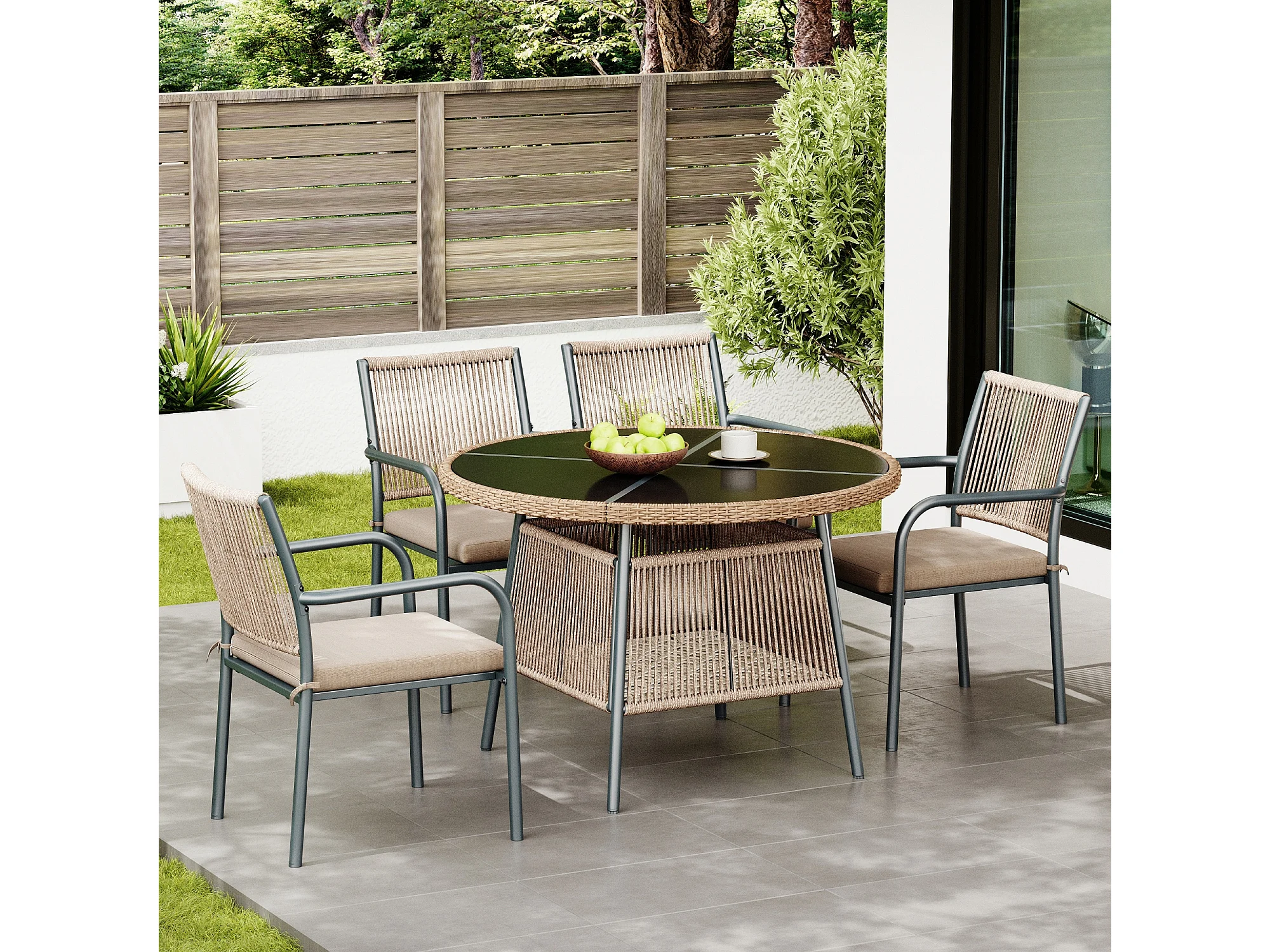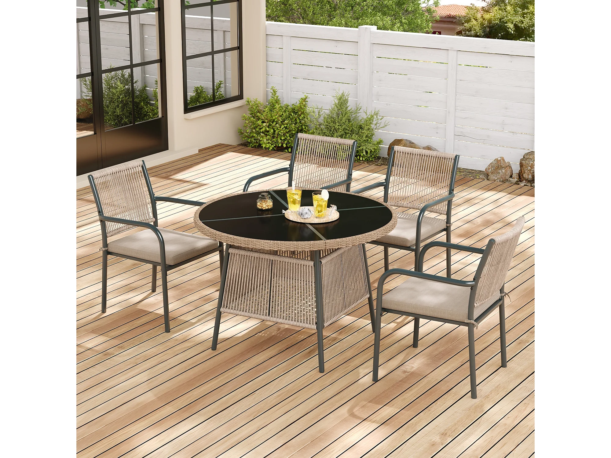5-teiliges Garten-Set aus Rattan – Runder Tisch aus gehärtetem Glas + 4 Sessel mit Armlehnen, Eisengestell, inklusive Kissen, für Terrasse und Balkon
