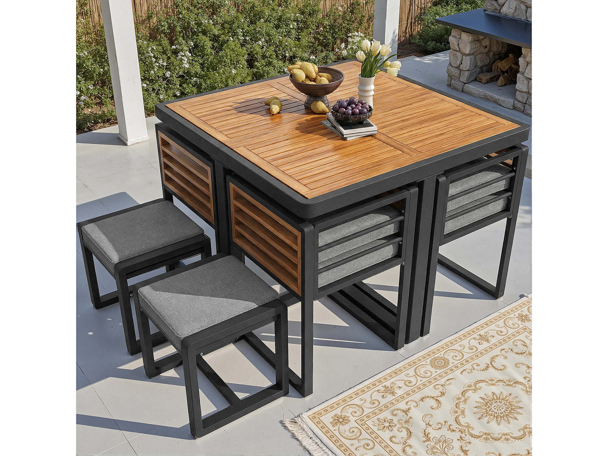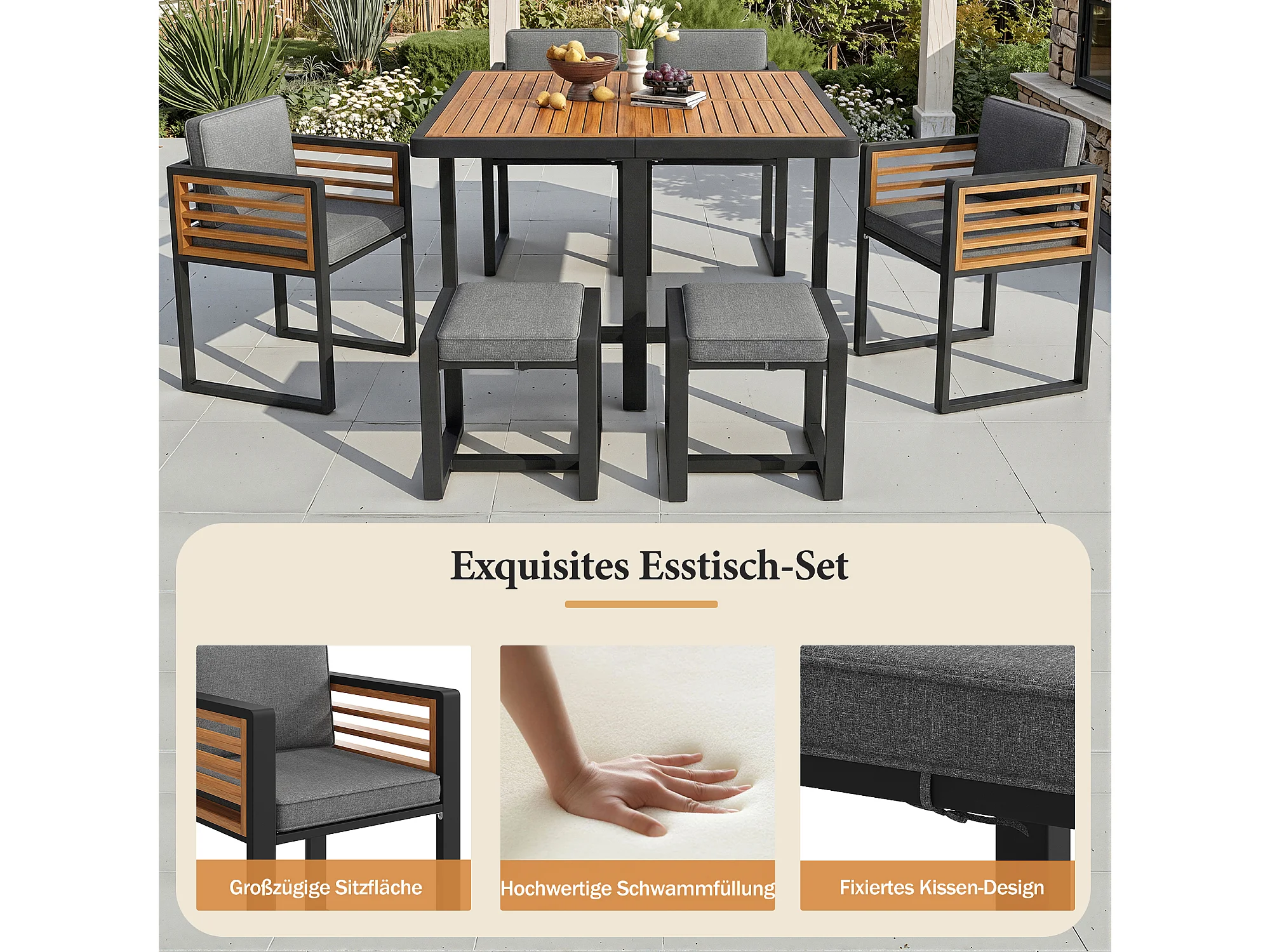 6-teiliges Gartenmöbelset – bestehend aus 4 Stühlen, 2 Hockern und einem Tisch – Tischplatte aus Massivholz – Holz und Metall – grau