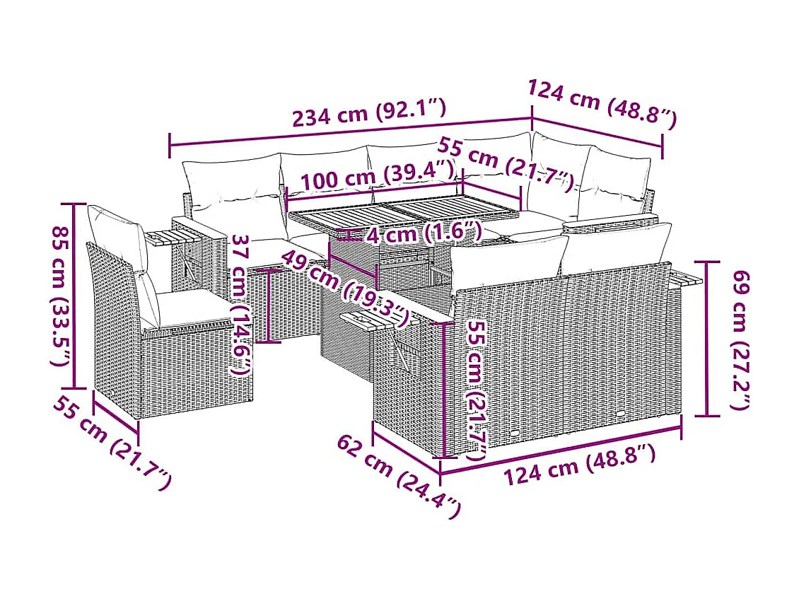 9-tlg. Garten-Sofagarnitur mit Kissen Schwarz Poly Rattan