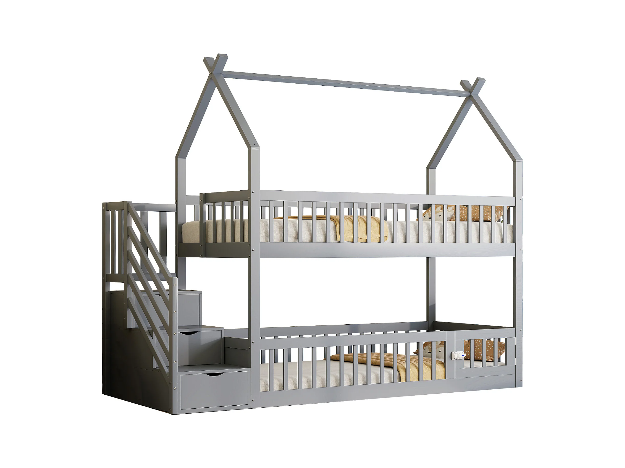 90x200 Kinder-Etagenbett Massivholzbett mit Dach, Sicherheitstreppe und Stauraumschubladen