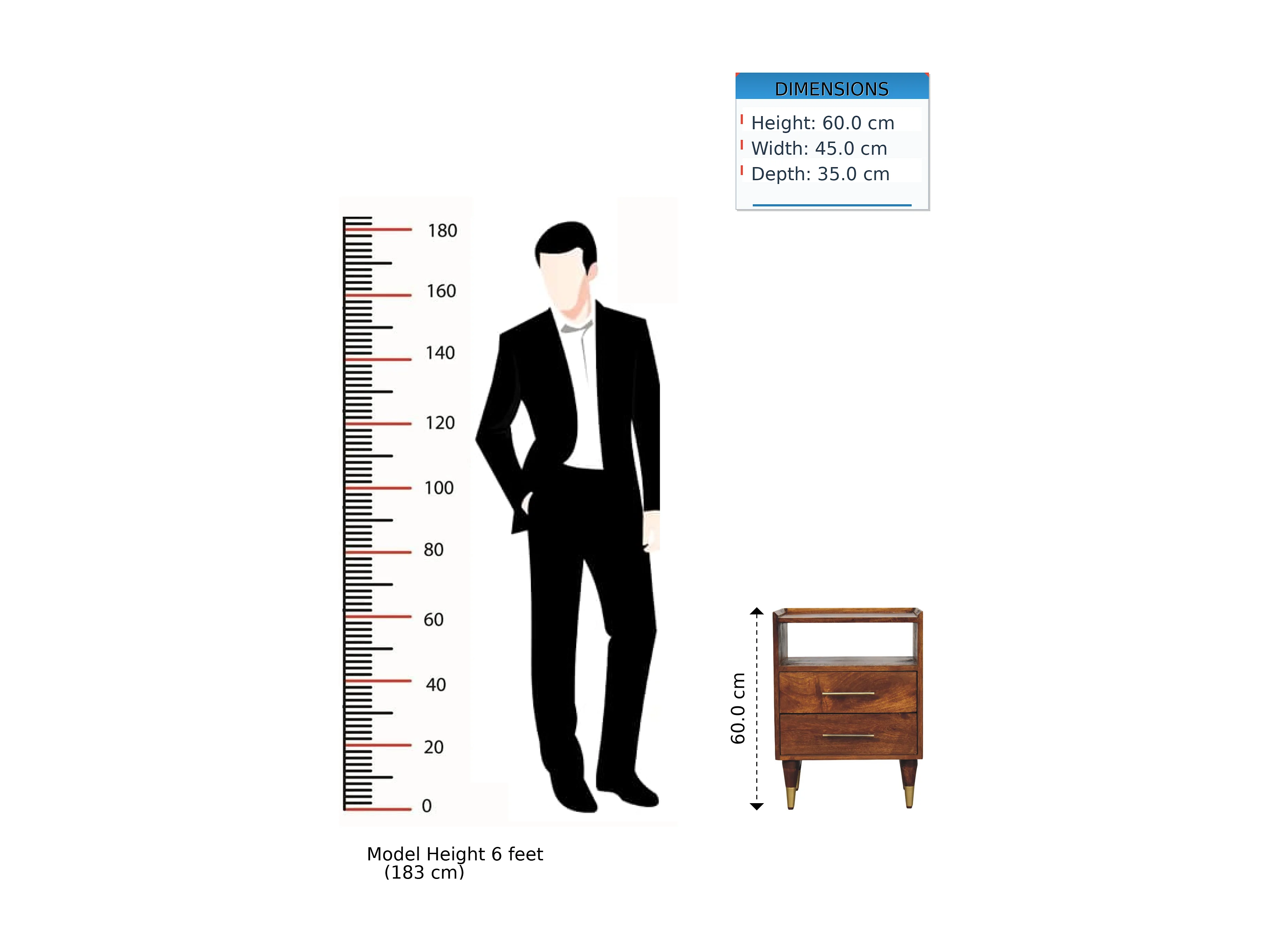 Artisan Furniture Nachttisch Valencia mit offenem Rahmen aus massivem Mangoholz, 2 Schubladen, 1 offenes Regal, braun