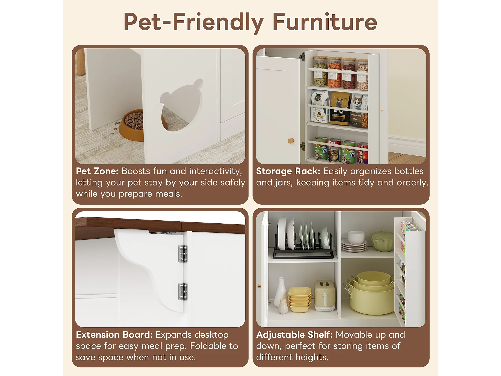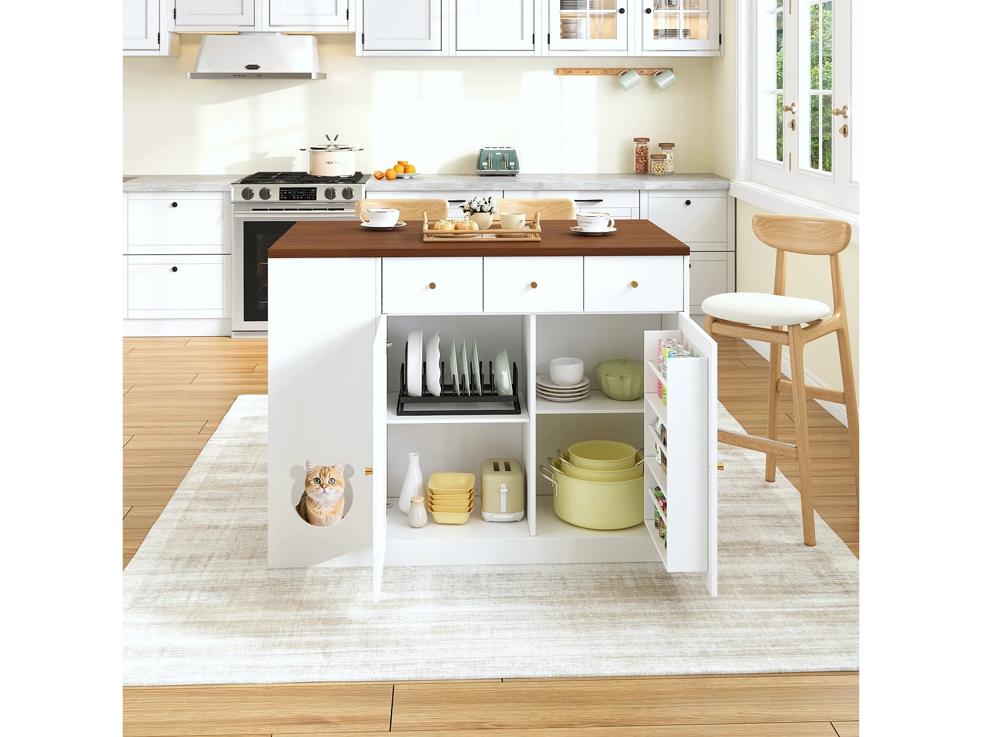 Ausziehbare Kücheninsel 120x70x90cm - mit Platz für Haustiere - 3 Schubladen und 2 Türen - weiß+natur