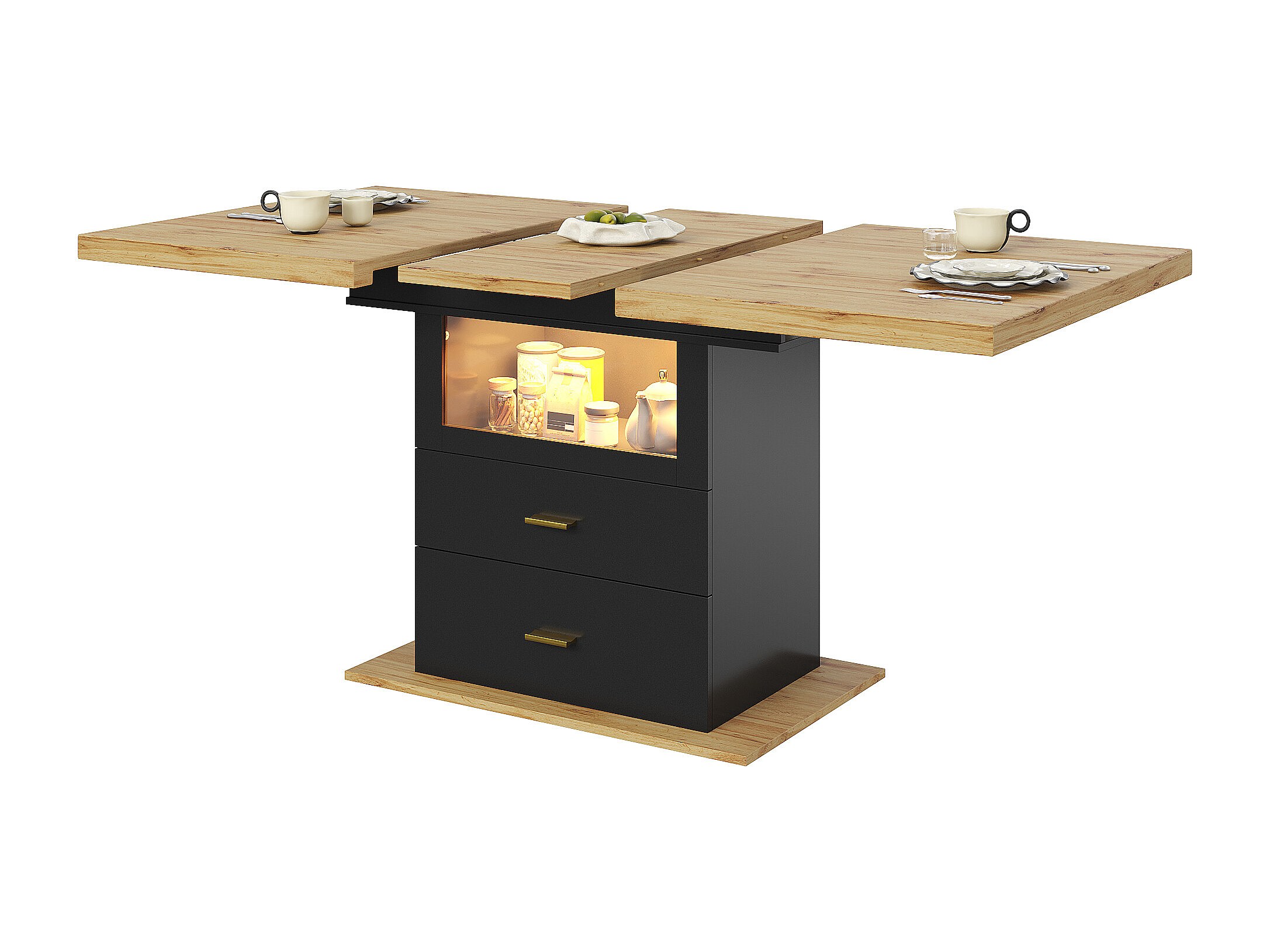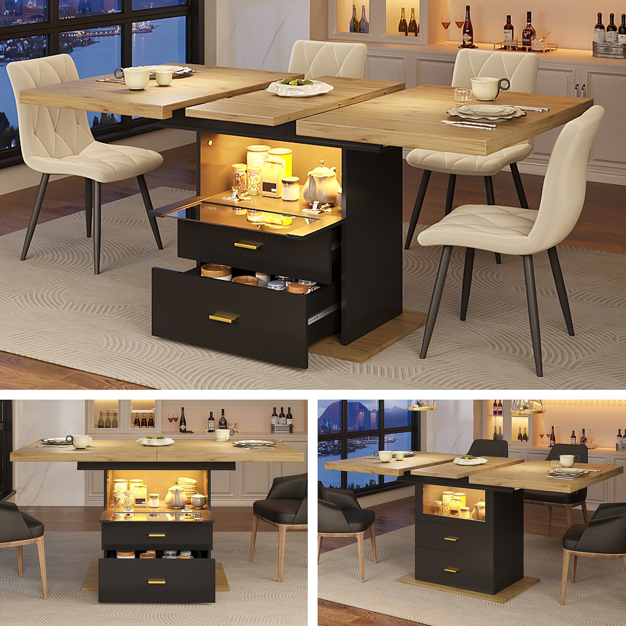 Ausziehbarer 6-Sitzer-Esstisch mit LEDs - 110/140 x 80 x 75 cm - für Esszimmer und Küche - MDF + Metall - Schwarz + Natur