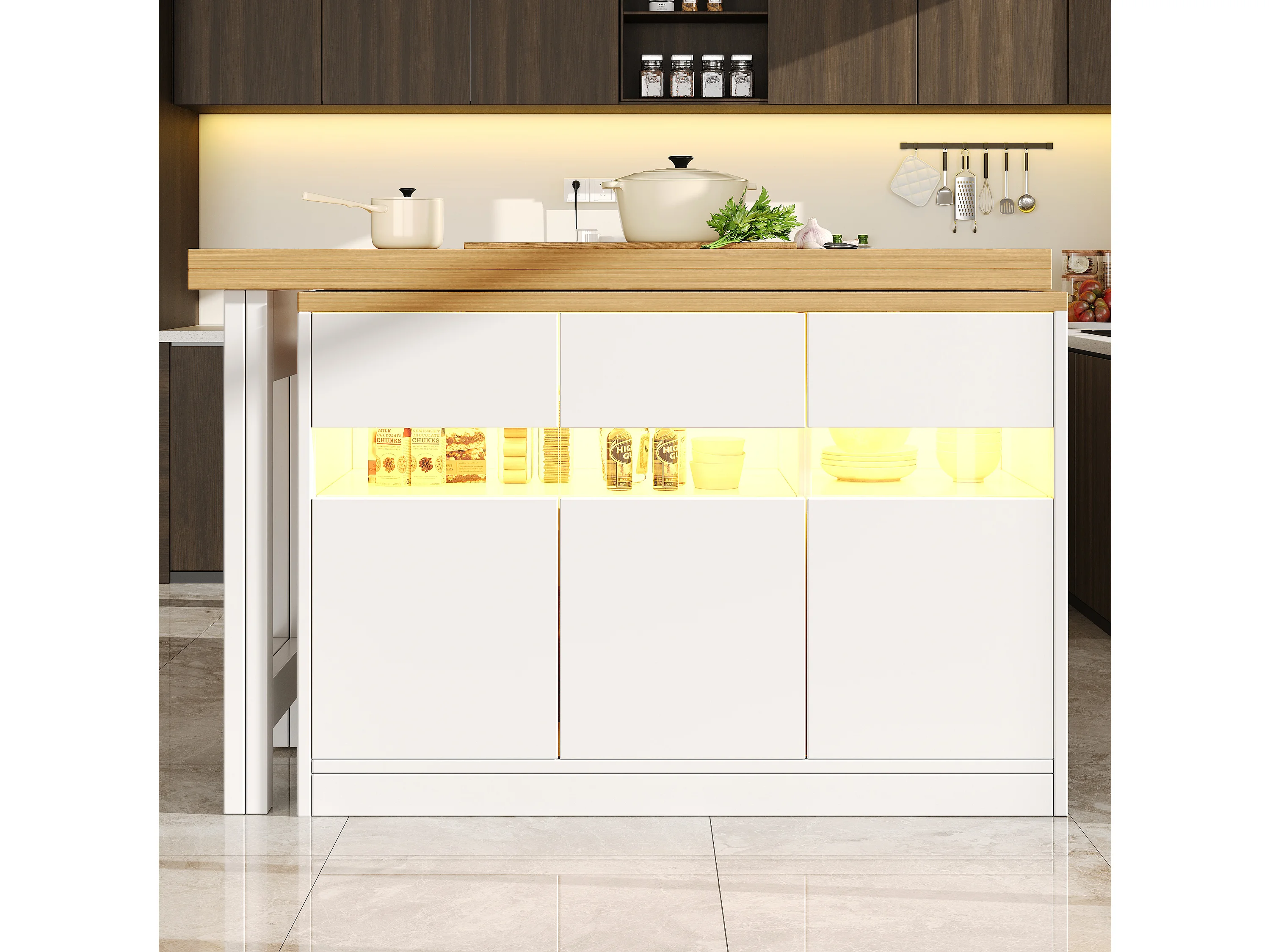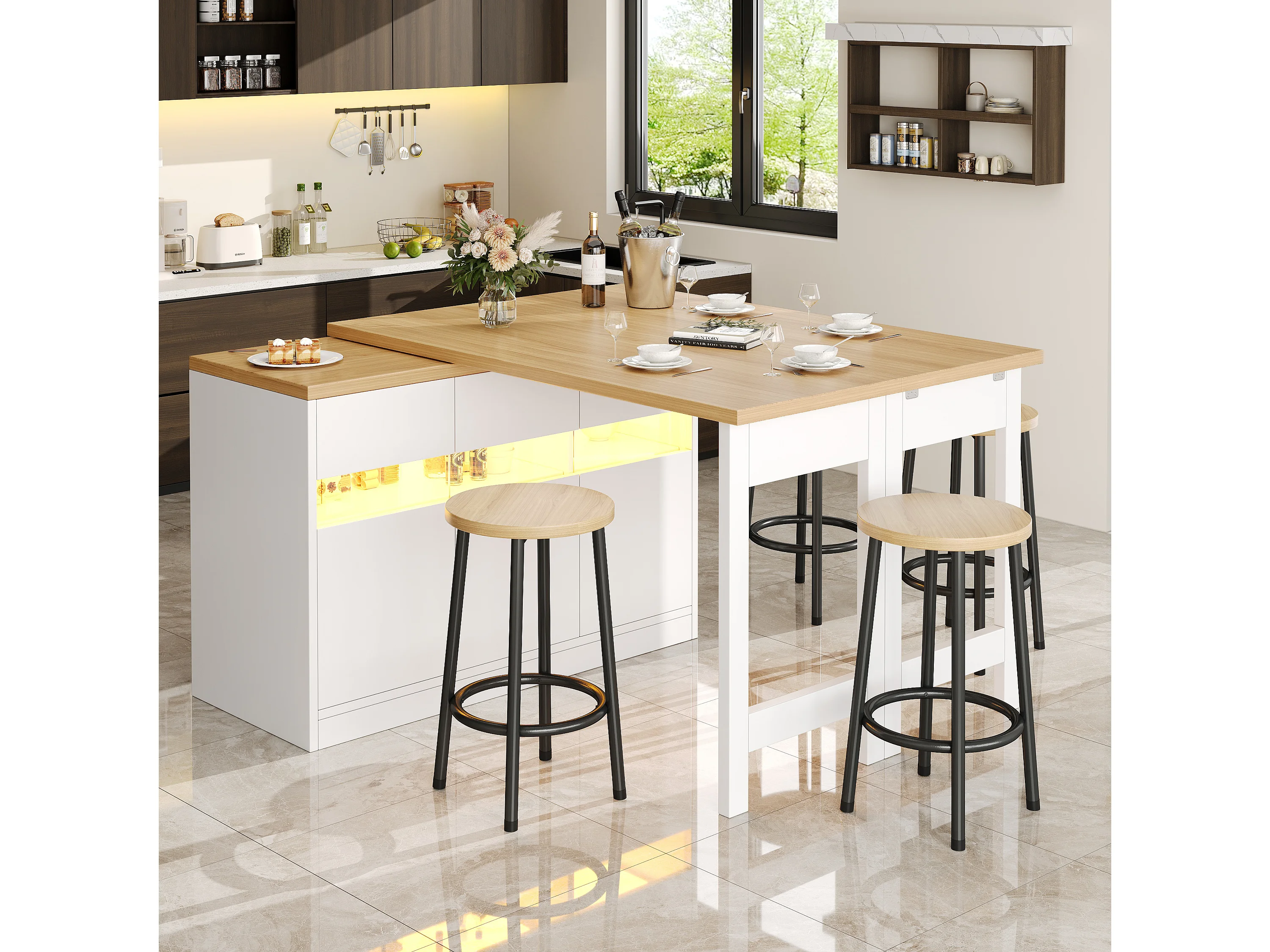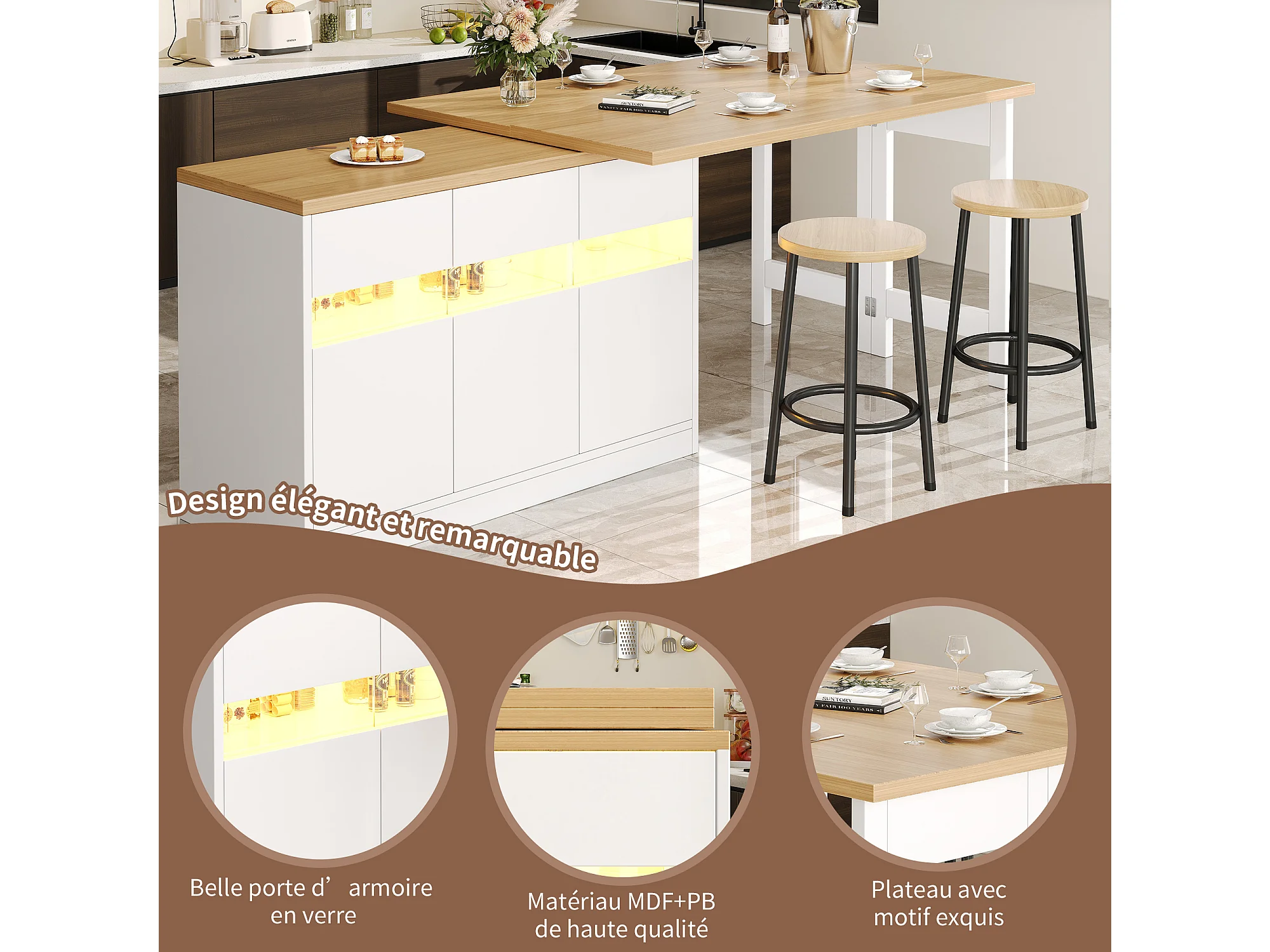 Ausziehbarer Bartisch – 120/180 x 75,8 cm – mit LEDs + 3 Türen – 360° drehbar – MDF – weiß + natur
