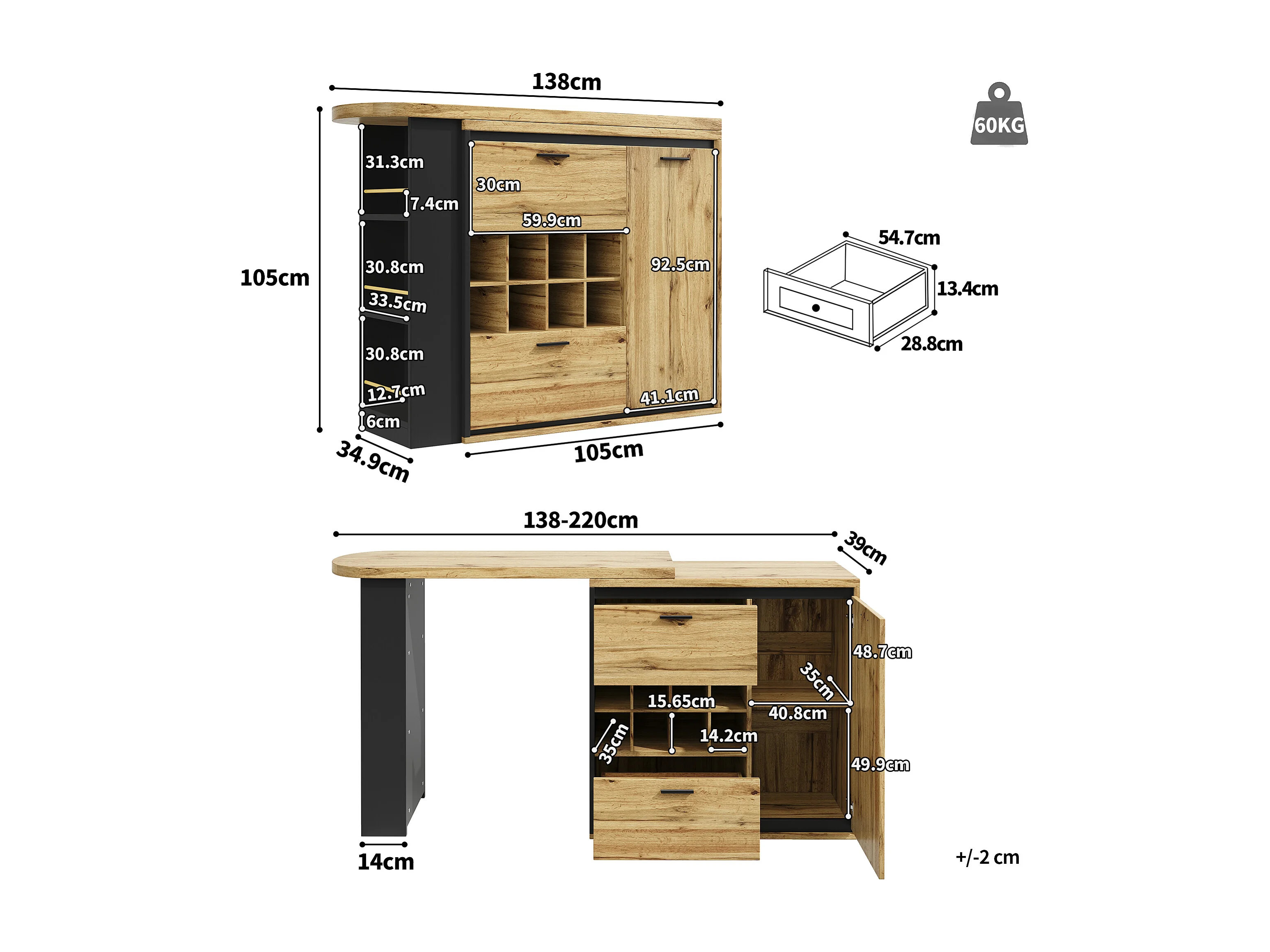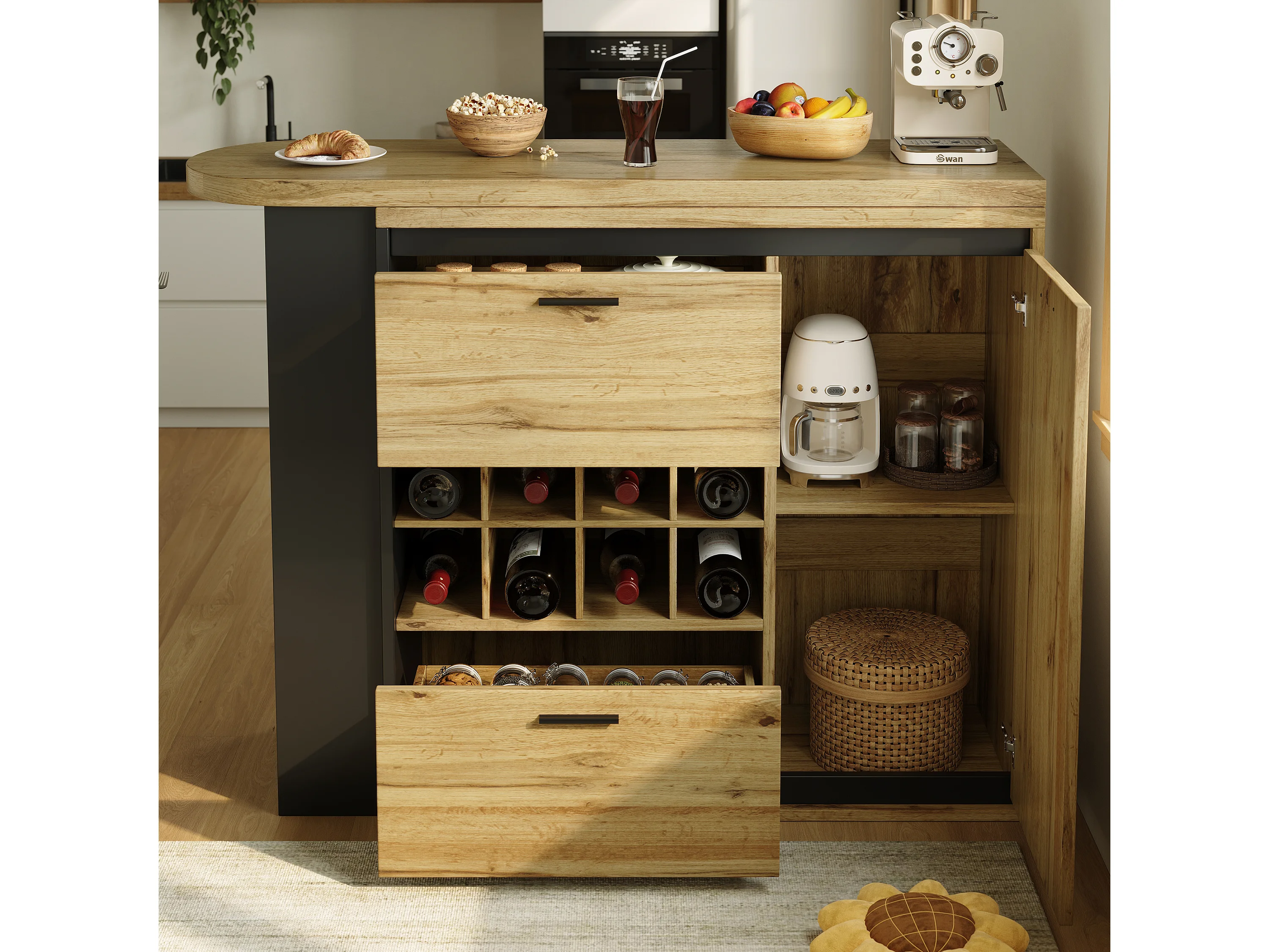 Ausziehbarer Küchen-Bar-Schrank - mit 360°-Drehung - 220x39x105cm - 1 Tür, 2 Schubladen - 6 Weinfächer - mit Seitengestellen - Natur