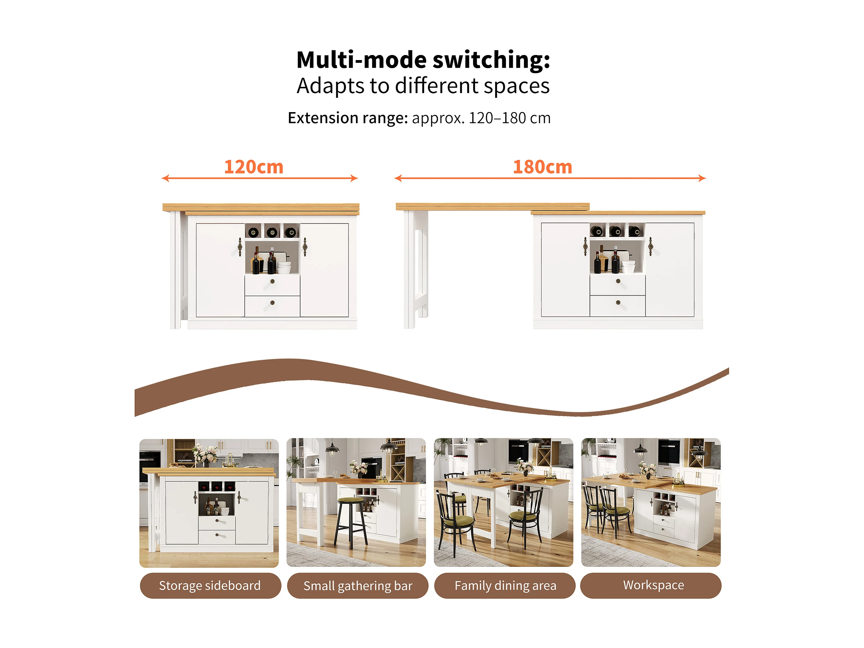 Ausziehbarer Küchen-Bar-Schrank - und 360° Drehung - großer Tisch - 180x79.5x71.5 cm - 2 Schubladen und 2 Türen - 3 Weinregale - Weiß