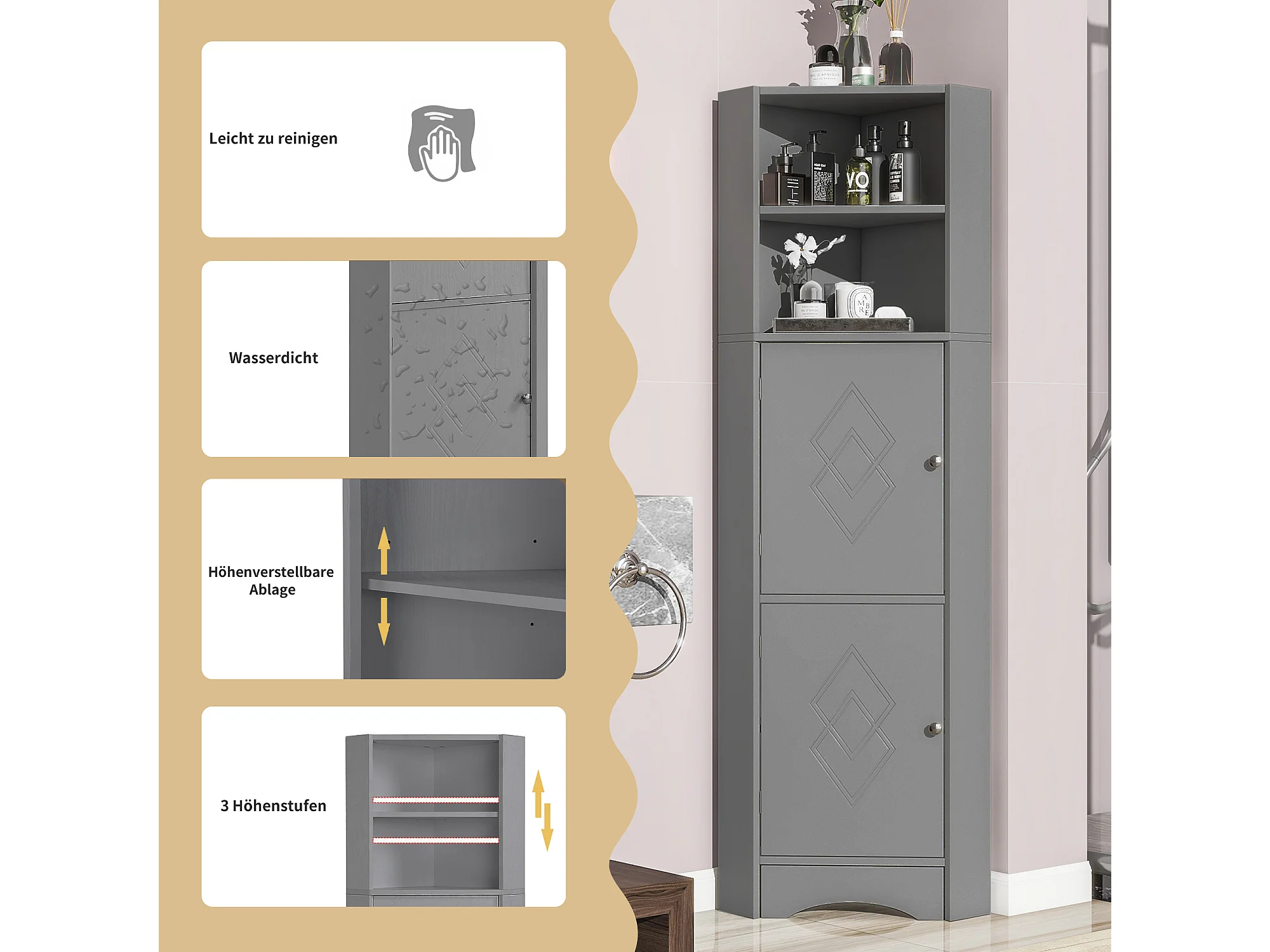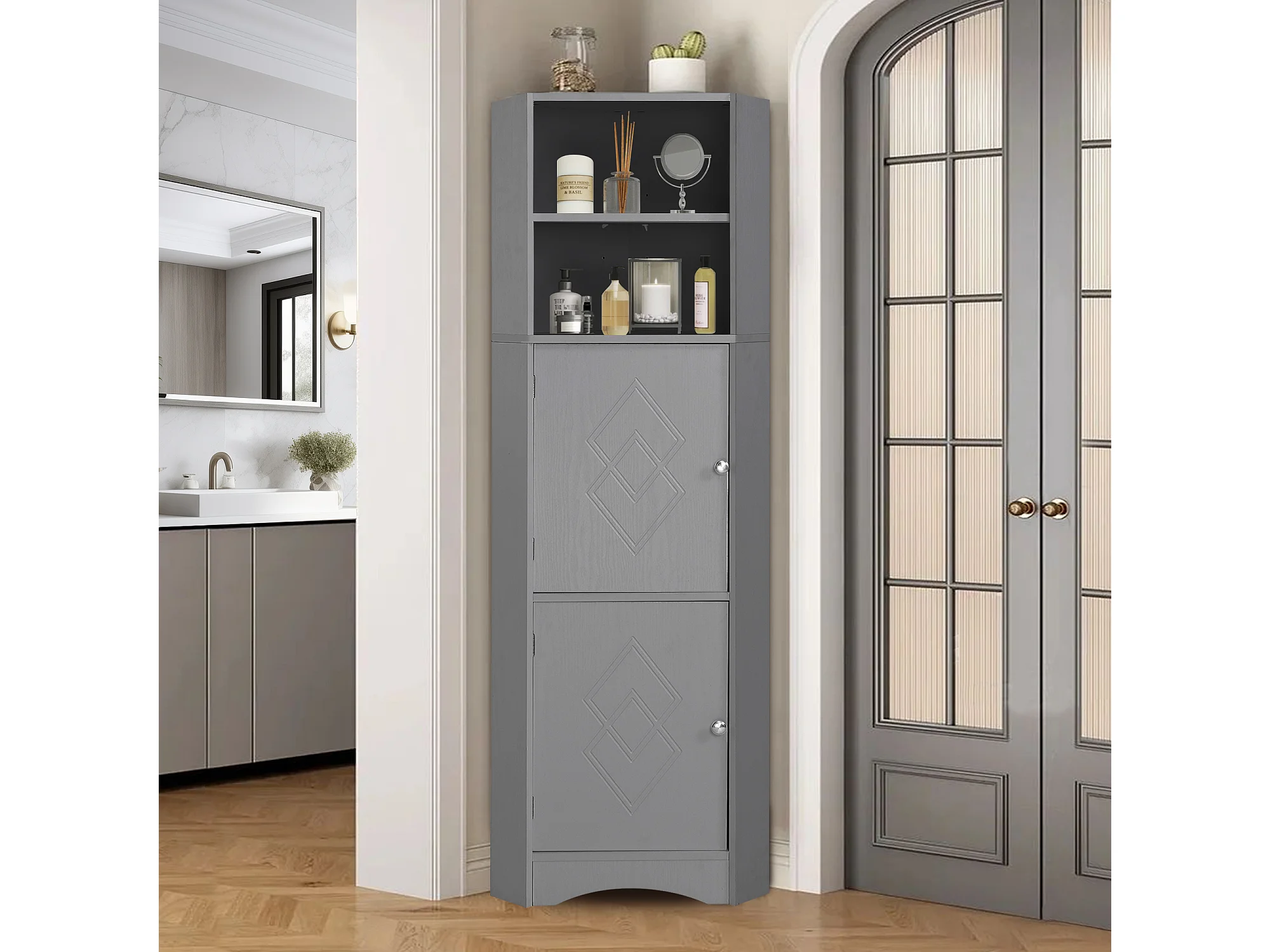 Badezimmer-Ecksäule – 2 Türen und 2 verstellbare Einlegeböden – Spanplatte – 36,5 x 36,5 x 155 cm – Hellgrau