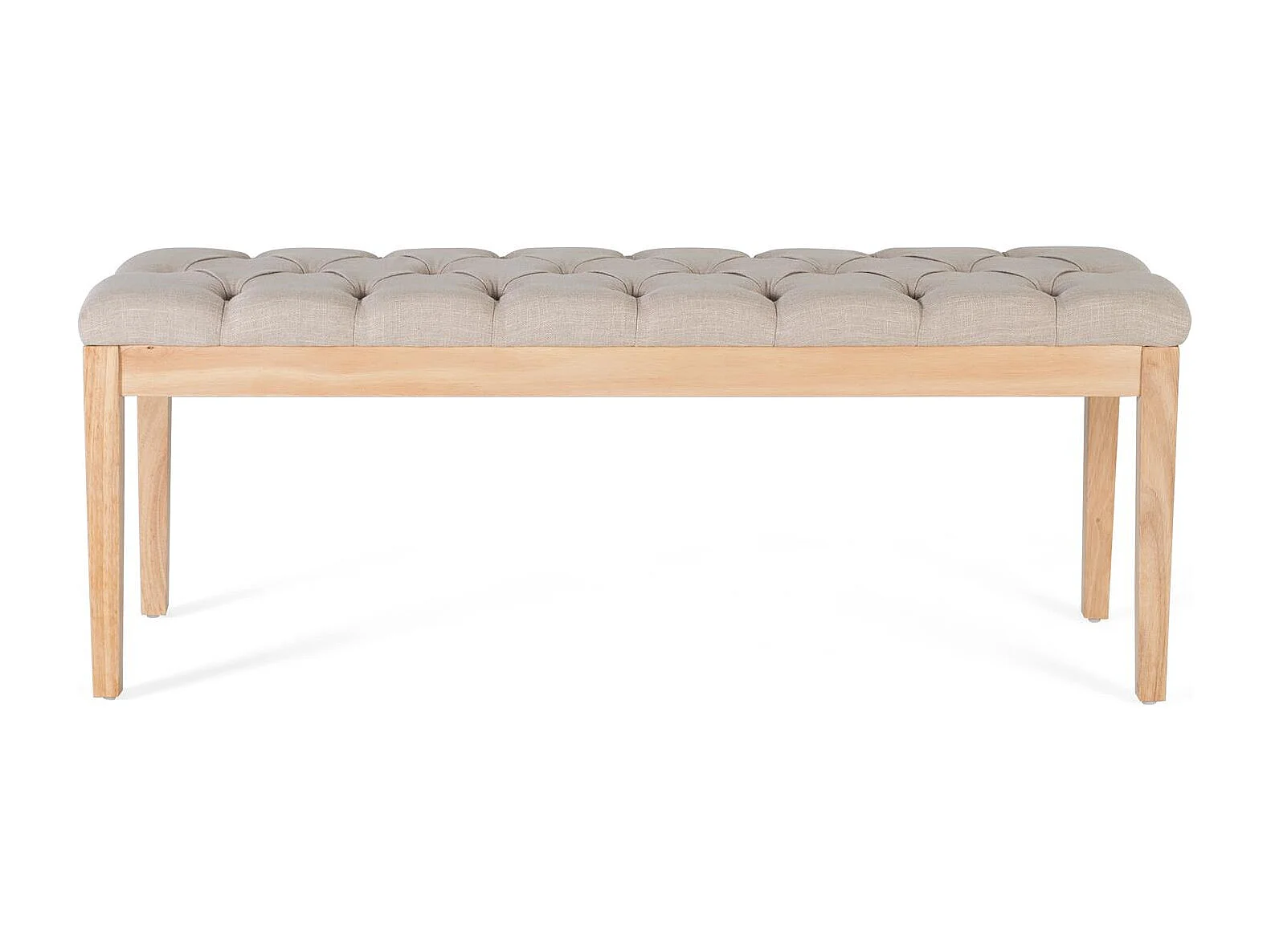 Bank aus natürlichem Kiefernholz und beigem Stoff