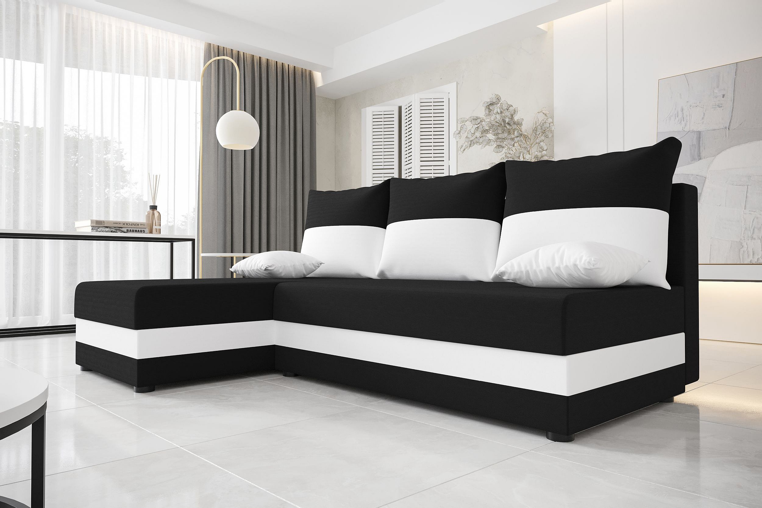 BEDANTE ECKSOFA HEWLET L Rainbow 15+31 Links Schwarz/Weiß mit Schlaffunktion L-Form Sofa mit Stauraum Bettkasten