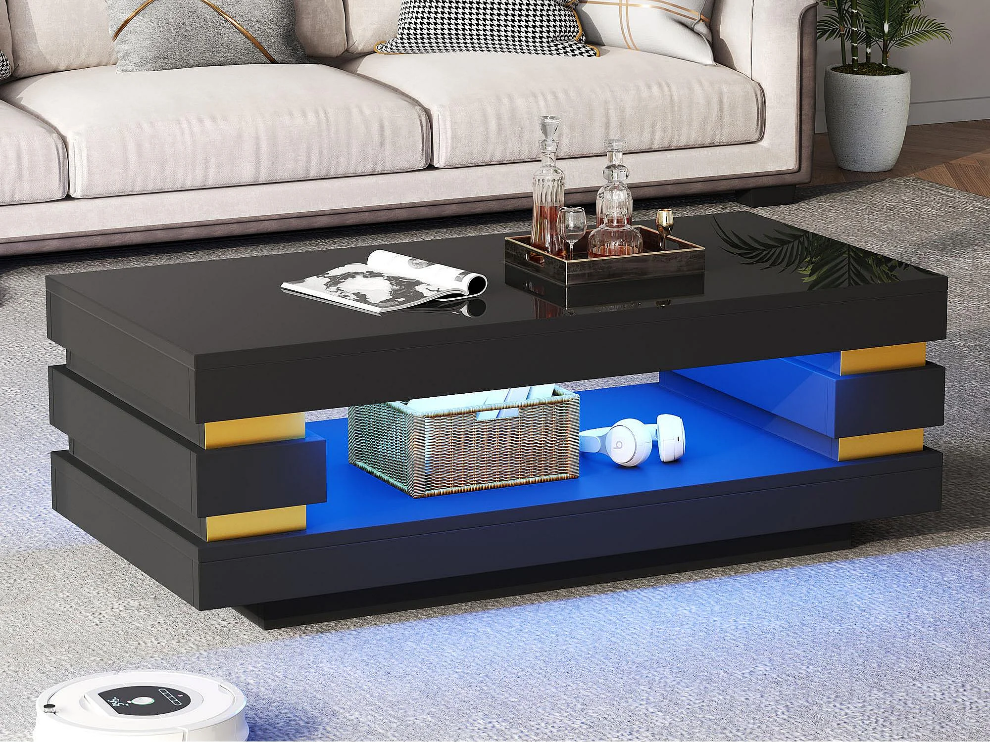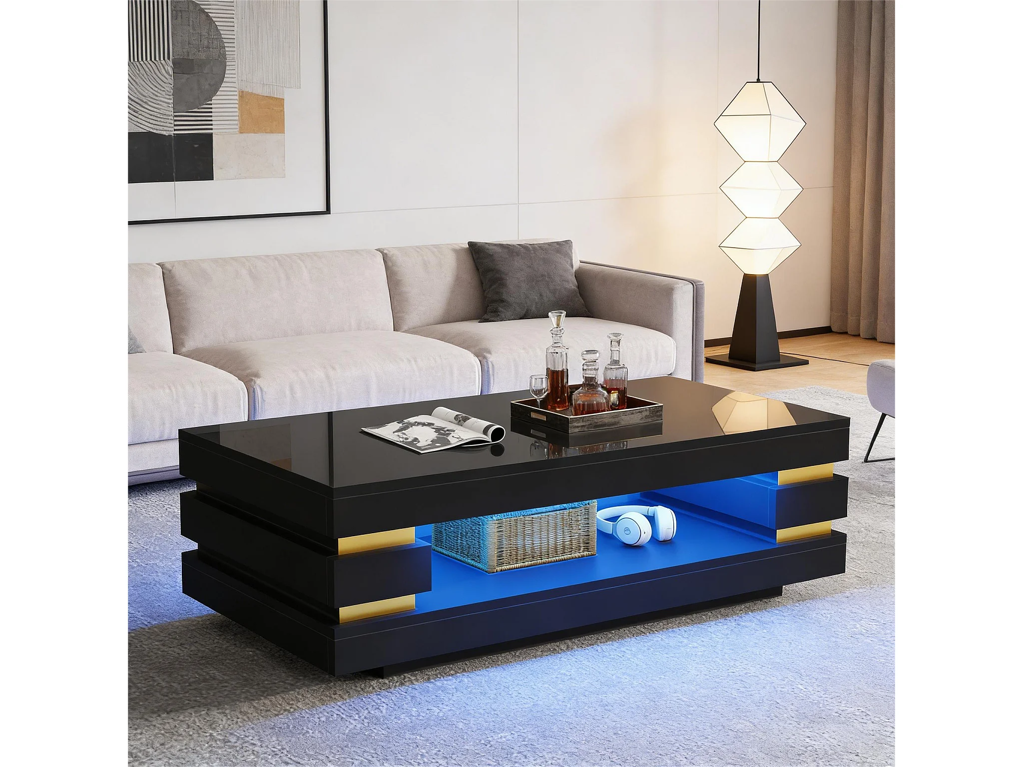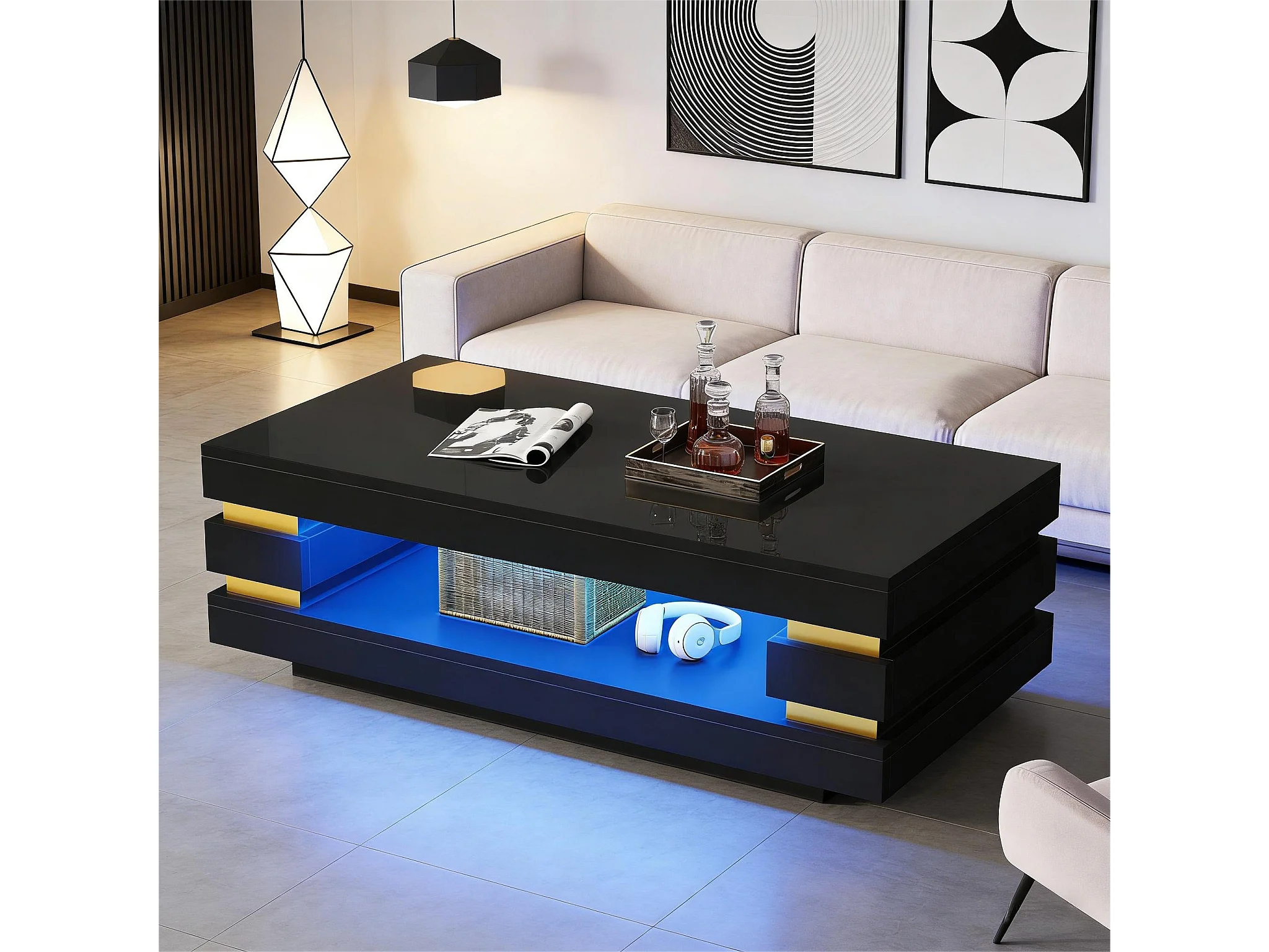 Beistelltisch 100x50x35 cm mit LED-Beleuchtung - Hochglanz-Finish - Durchbrochenes Design - Spanplatten - Schwarz