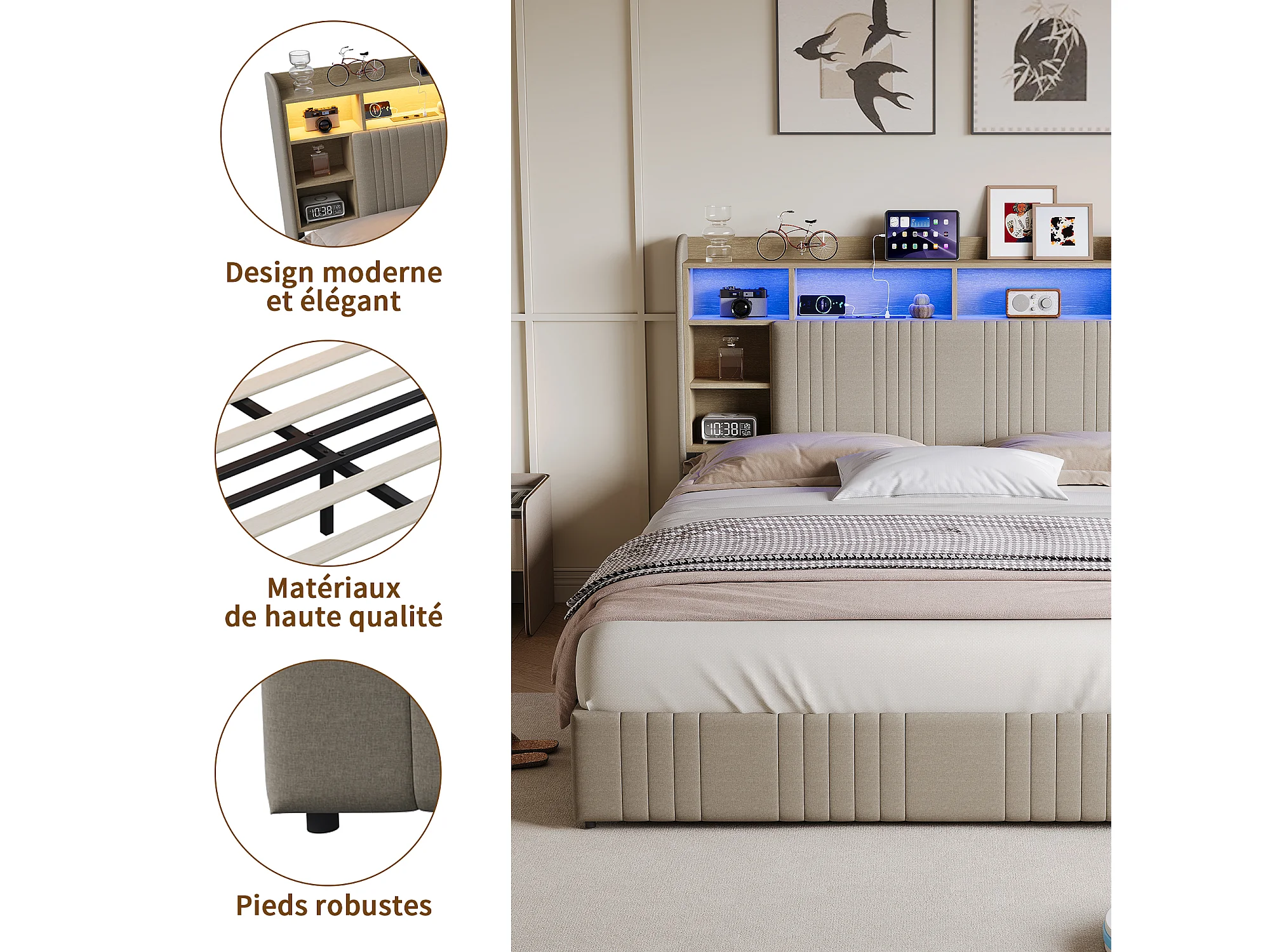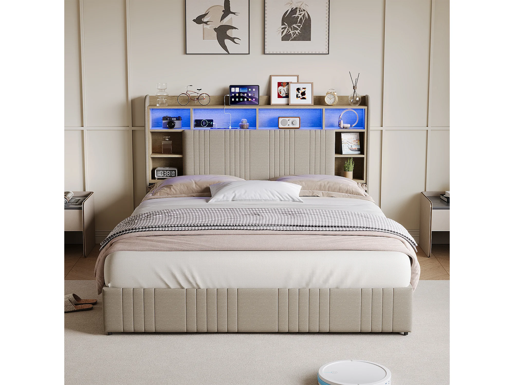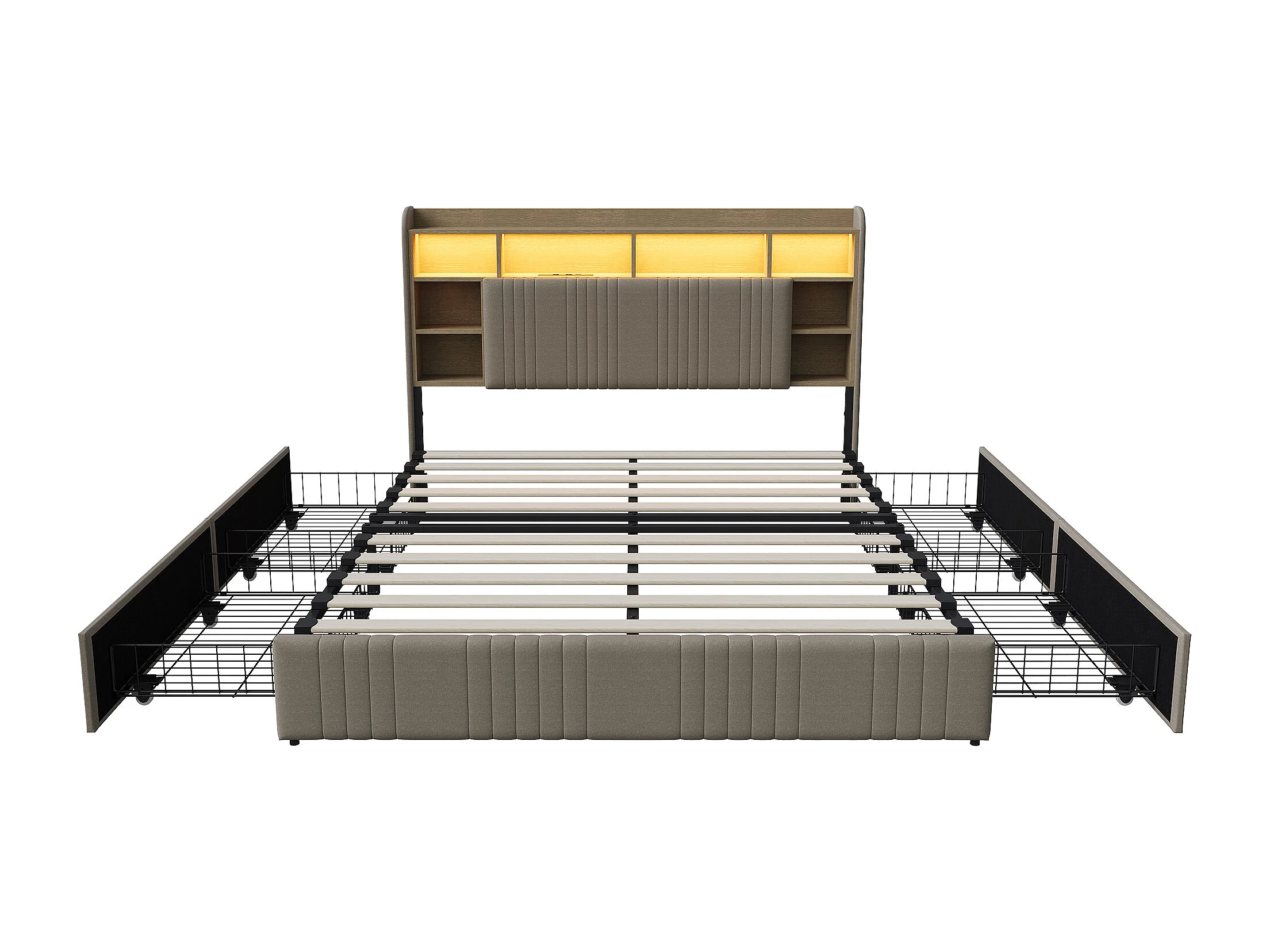 Bett (140 x 200 cm) mit 4 Schubladen, LED-Beleuchtung, USB-C-Anschluss, Nachttischen mit Stauraum, offenen Fächern und Lattenrost – Beige
