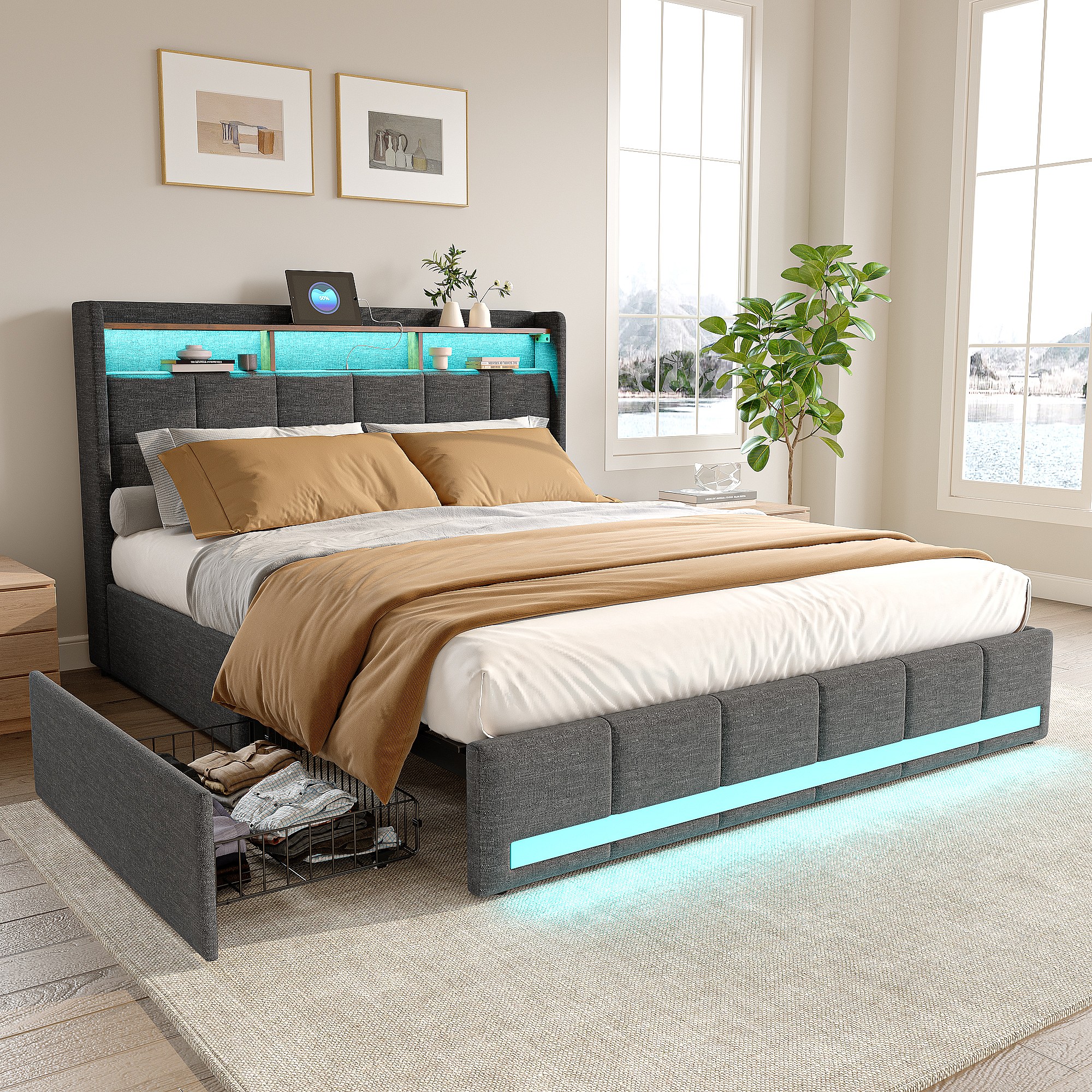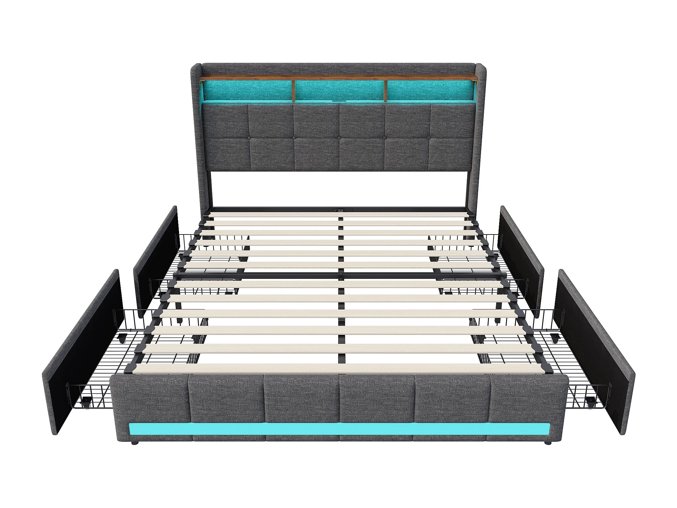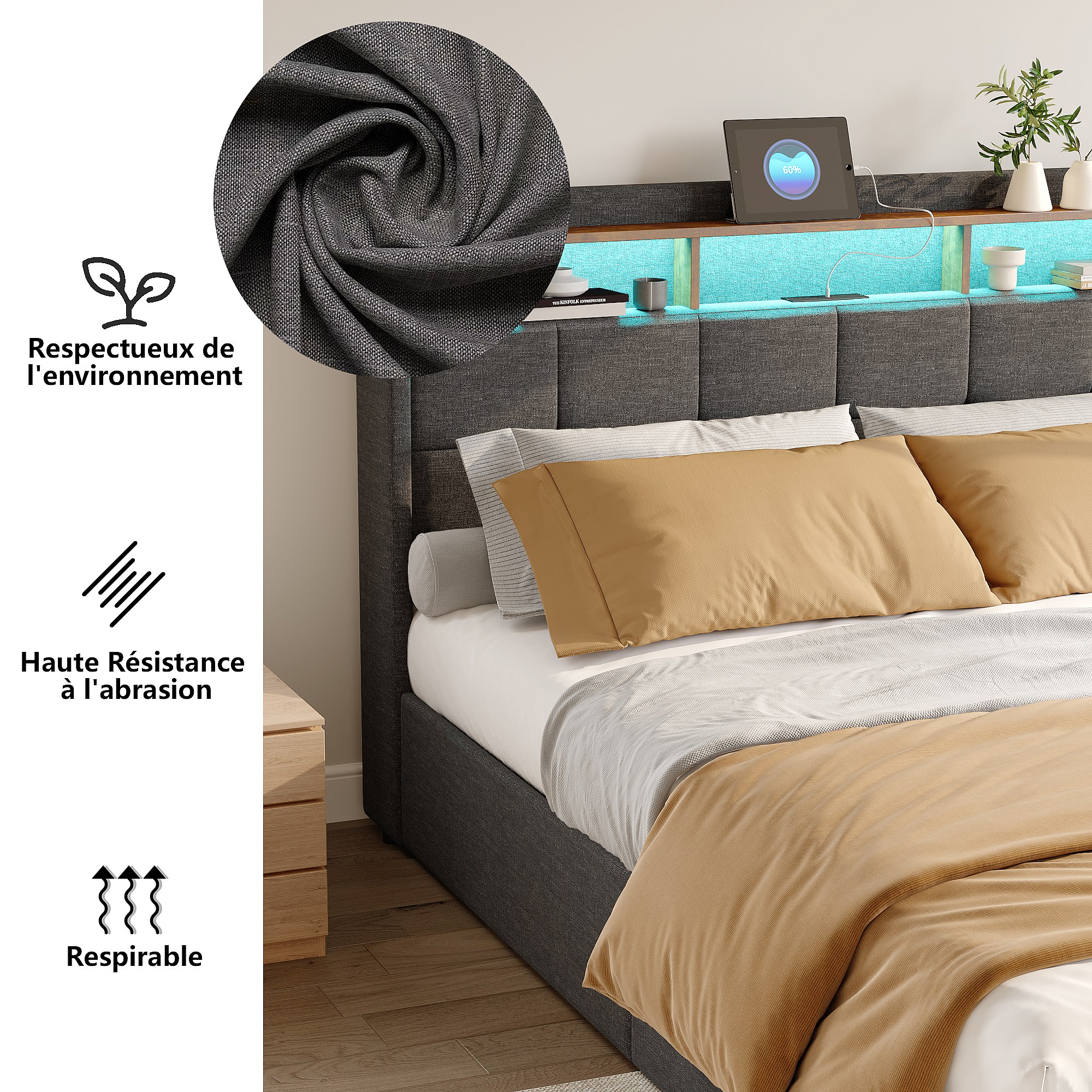 Bett 140x190 cm mit LED-Beleuchtung und USB, 4 Schubladen und Stauraum am Kopfteil, Leinen, Grau