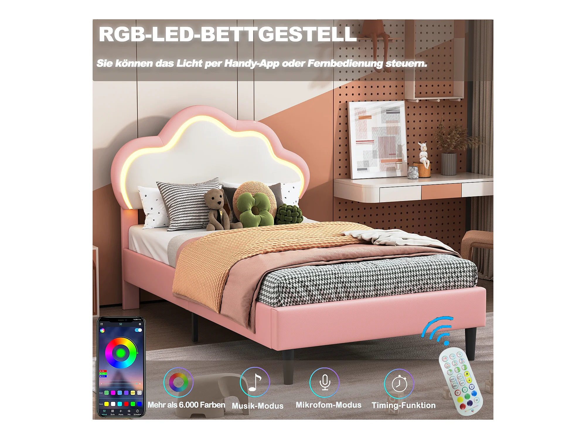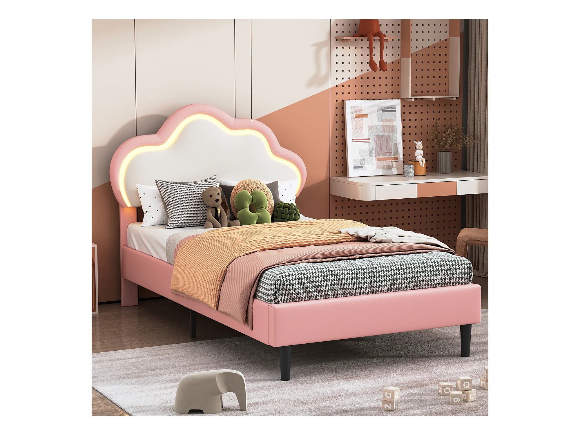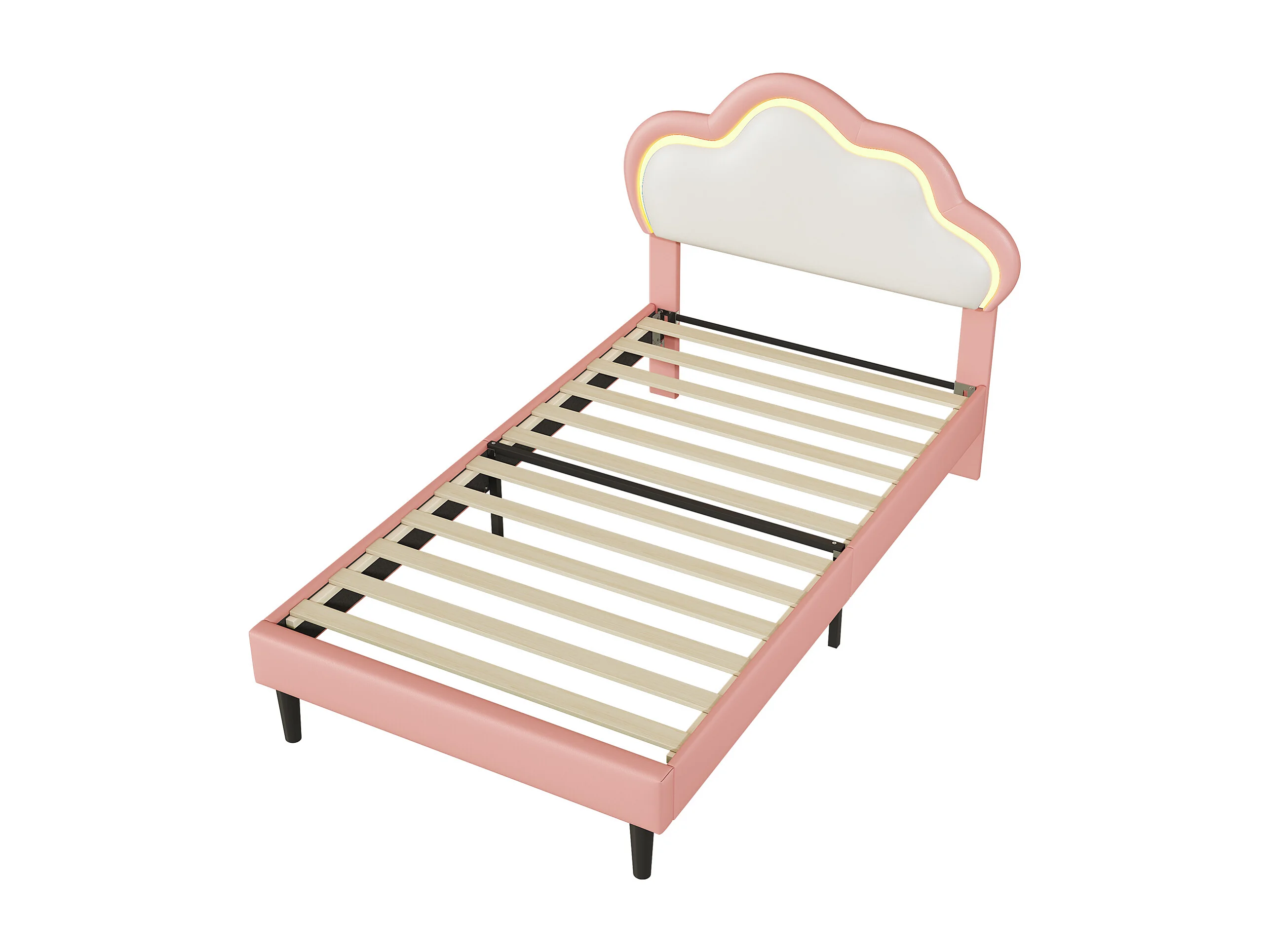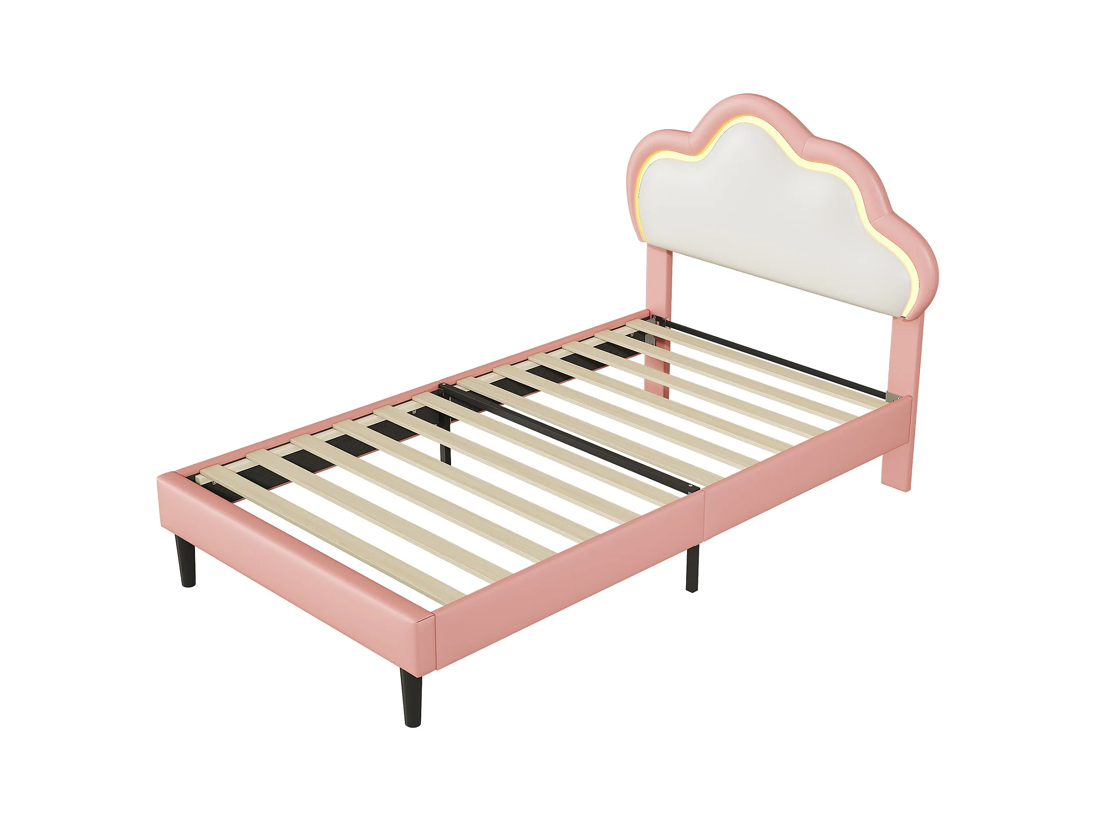 Bett 90x200 cm - Kinderbett mit Kopfteil - LED-Licht - PU - Rosa