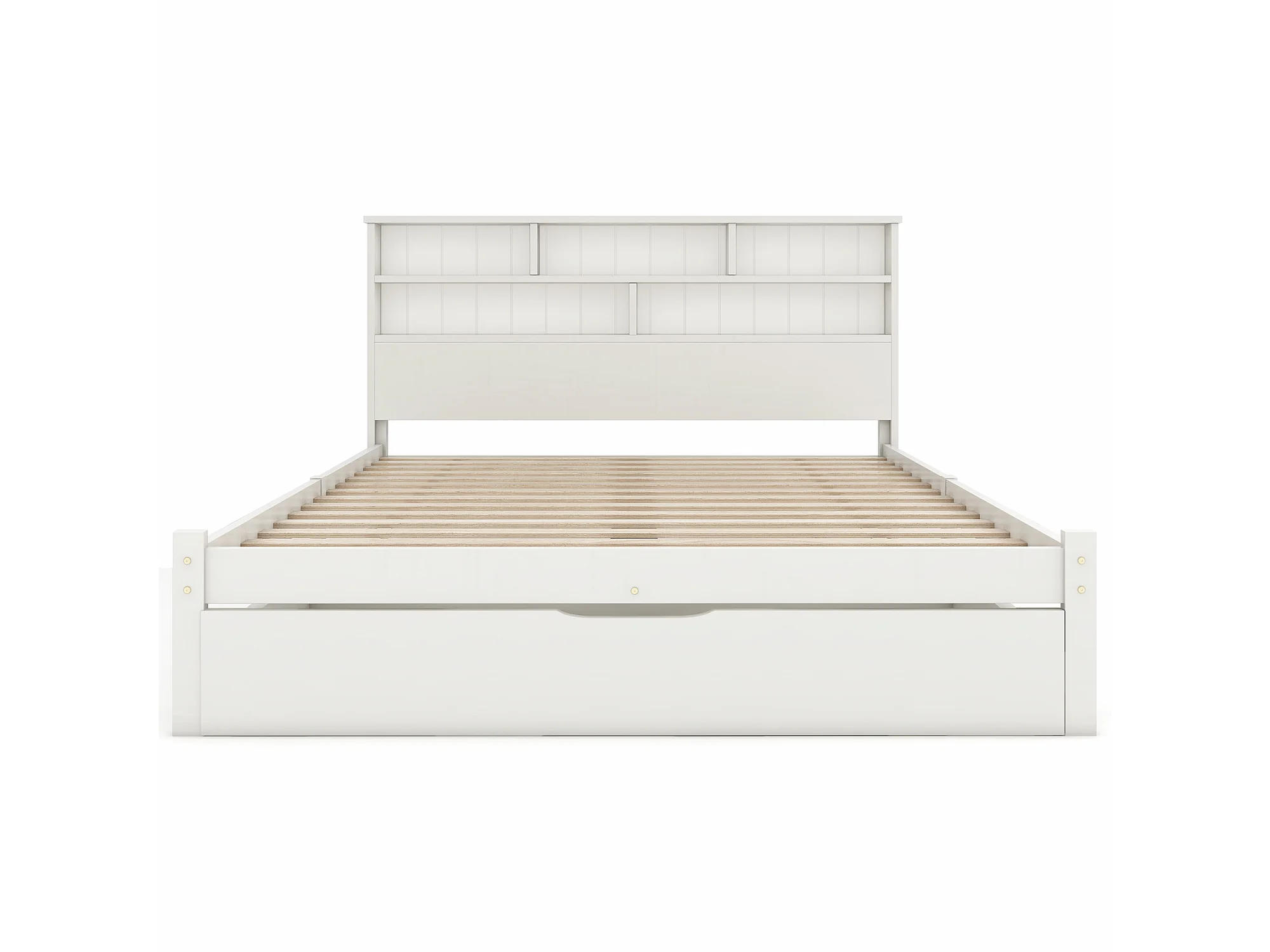 Bett für Erwachsene mit Stauraum-Kopfteil + Schublade + Lattenrost – 140 x 200 cm – Massivholz – Weiß