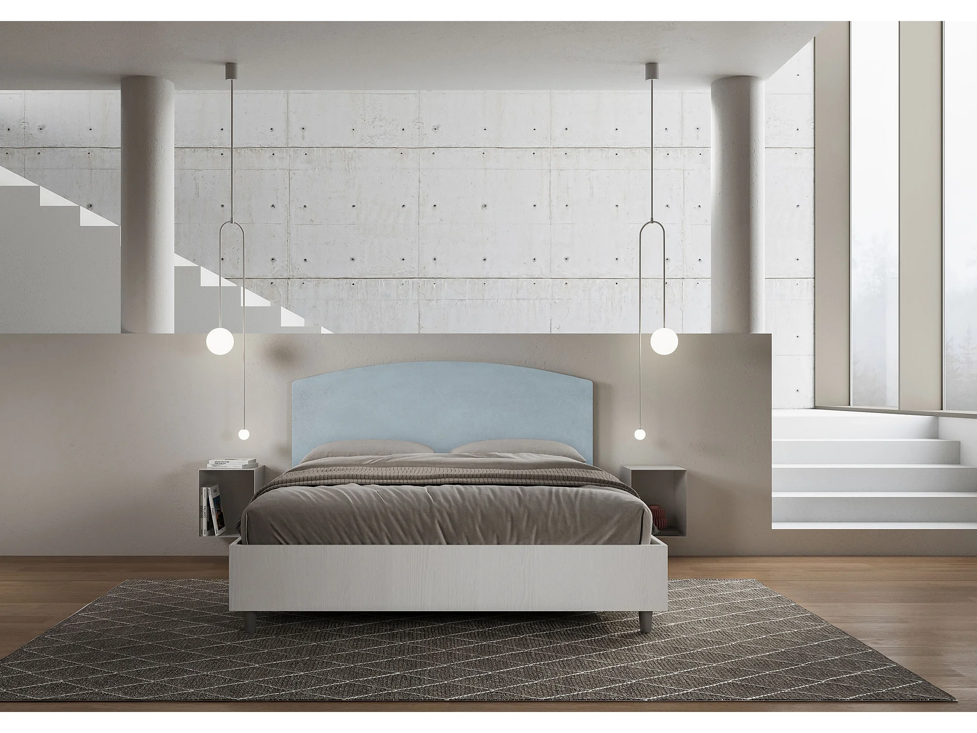 Bett mit Bettkasten 160x200 Bettgestell Esche weiß Bett-Kopfteil mit Mikrofaserbezug Himmelblau Antilia