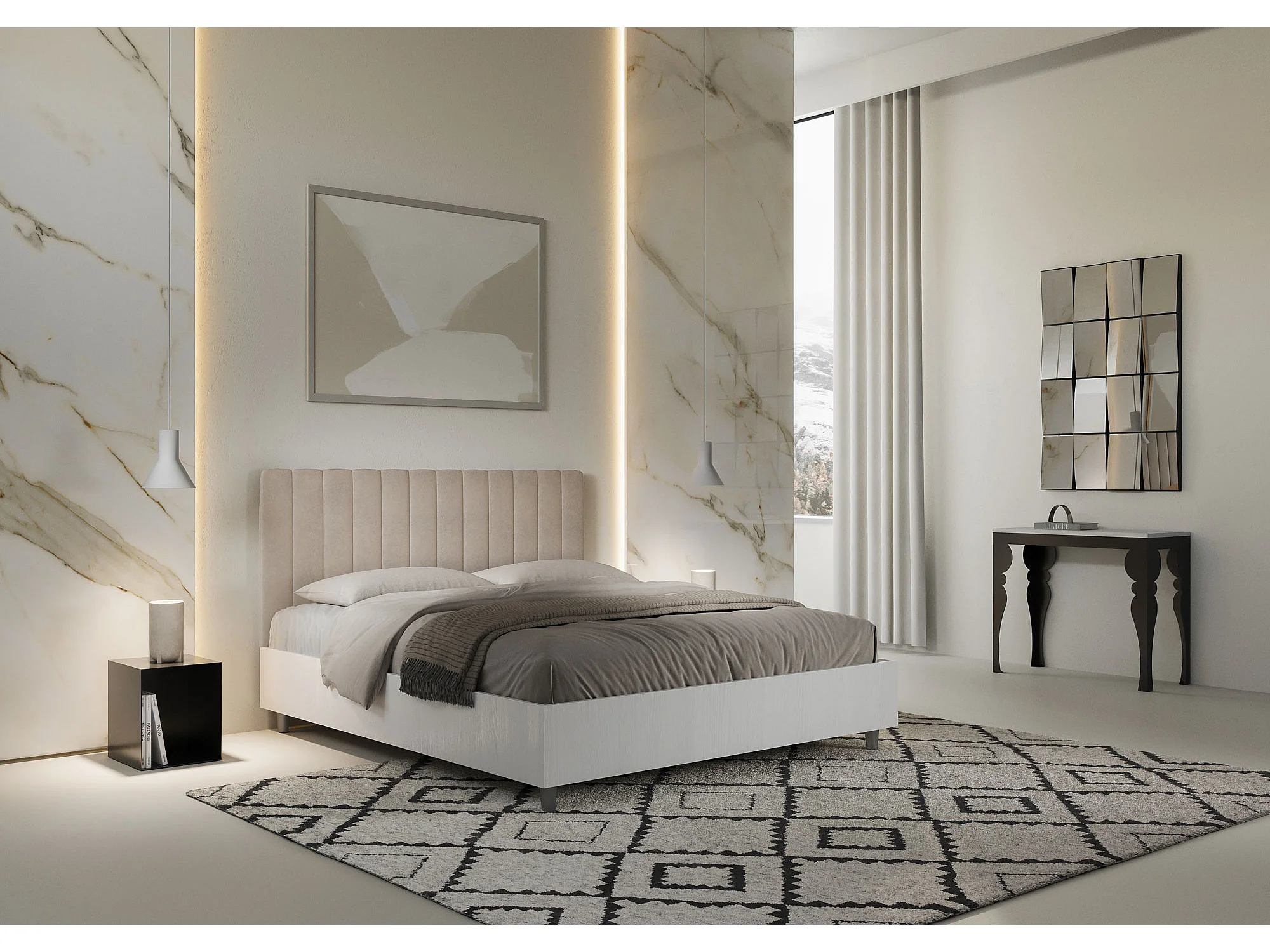 Bett mit Bettkasten 160x200 Bettgestell Esche weiß Bett-Kopfteil mit Mikrofaserbezug Sandfarbe Kaia