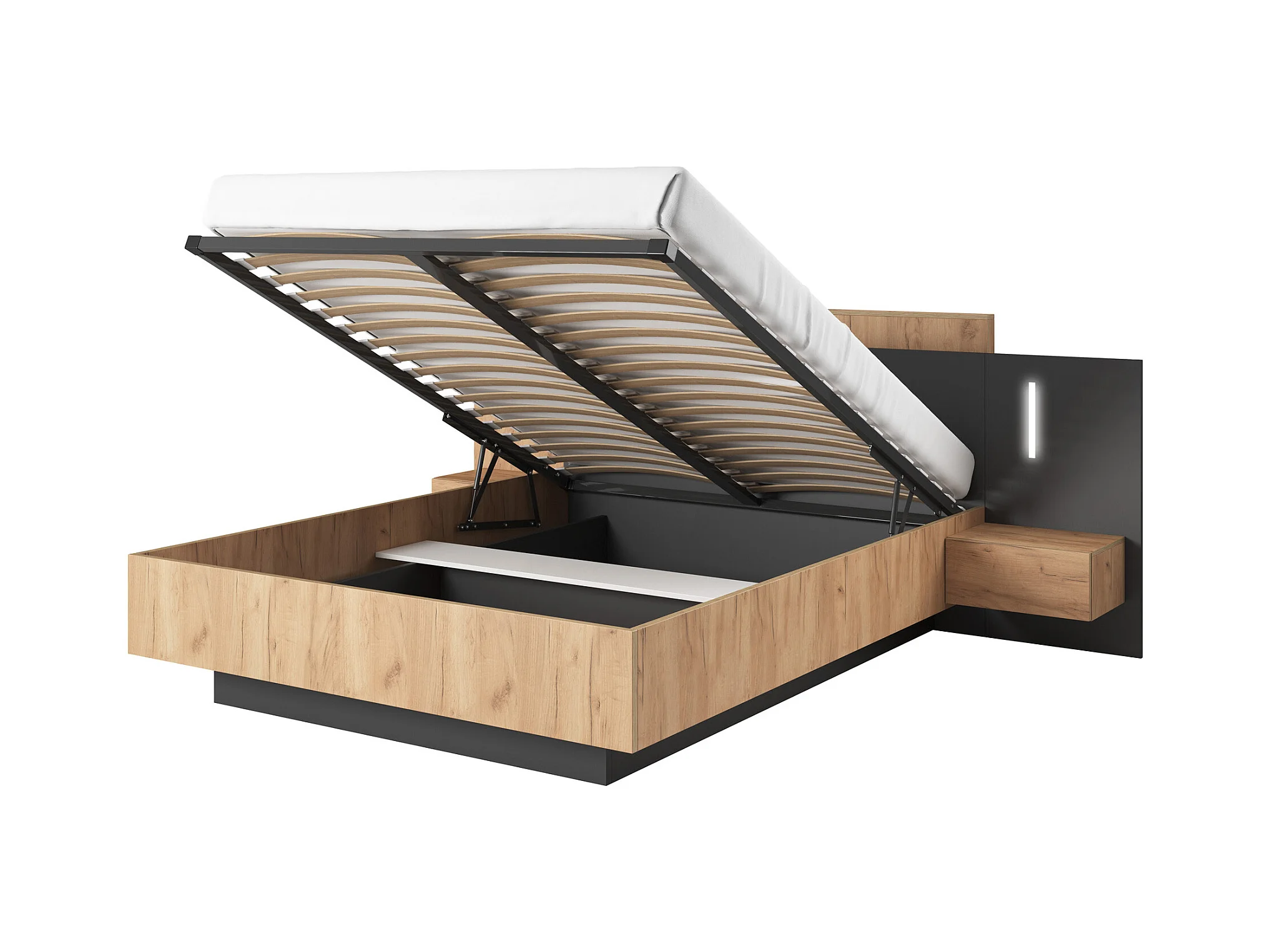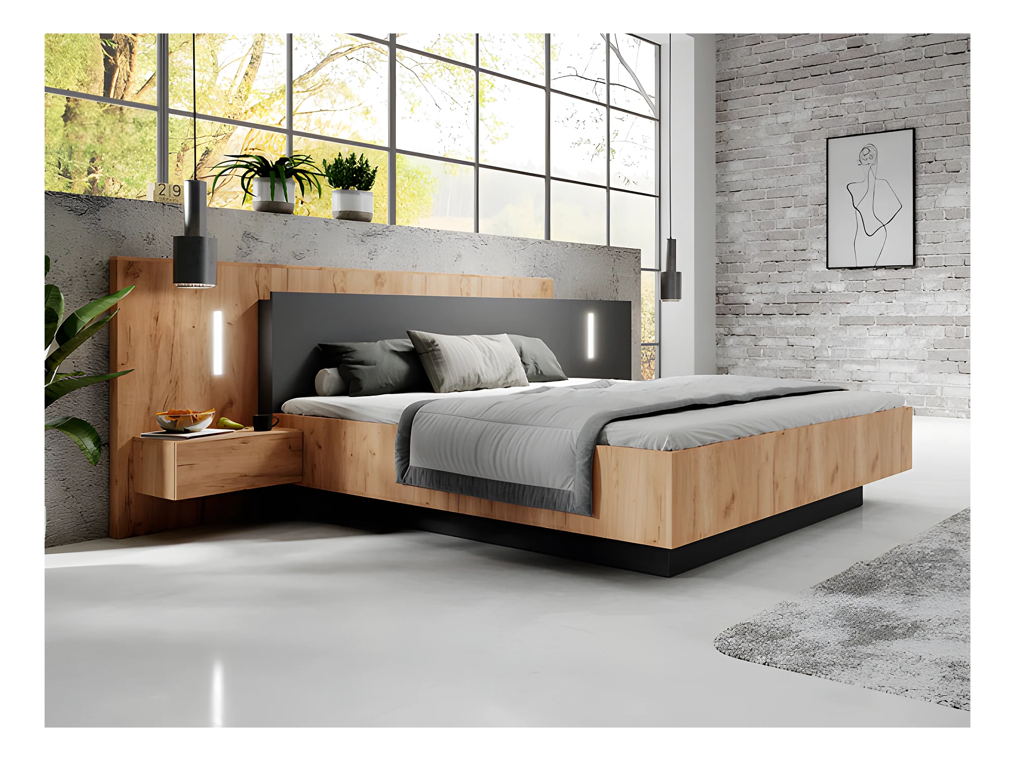 Bett mit Bettkasten mit Nachttischen - 140 x 190 cm - 2 Schubladen - Mit LED-Beleuchtung - Holzfarben & Anthrazit - FRANCOLI