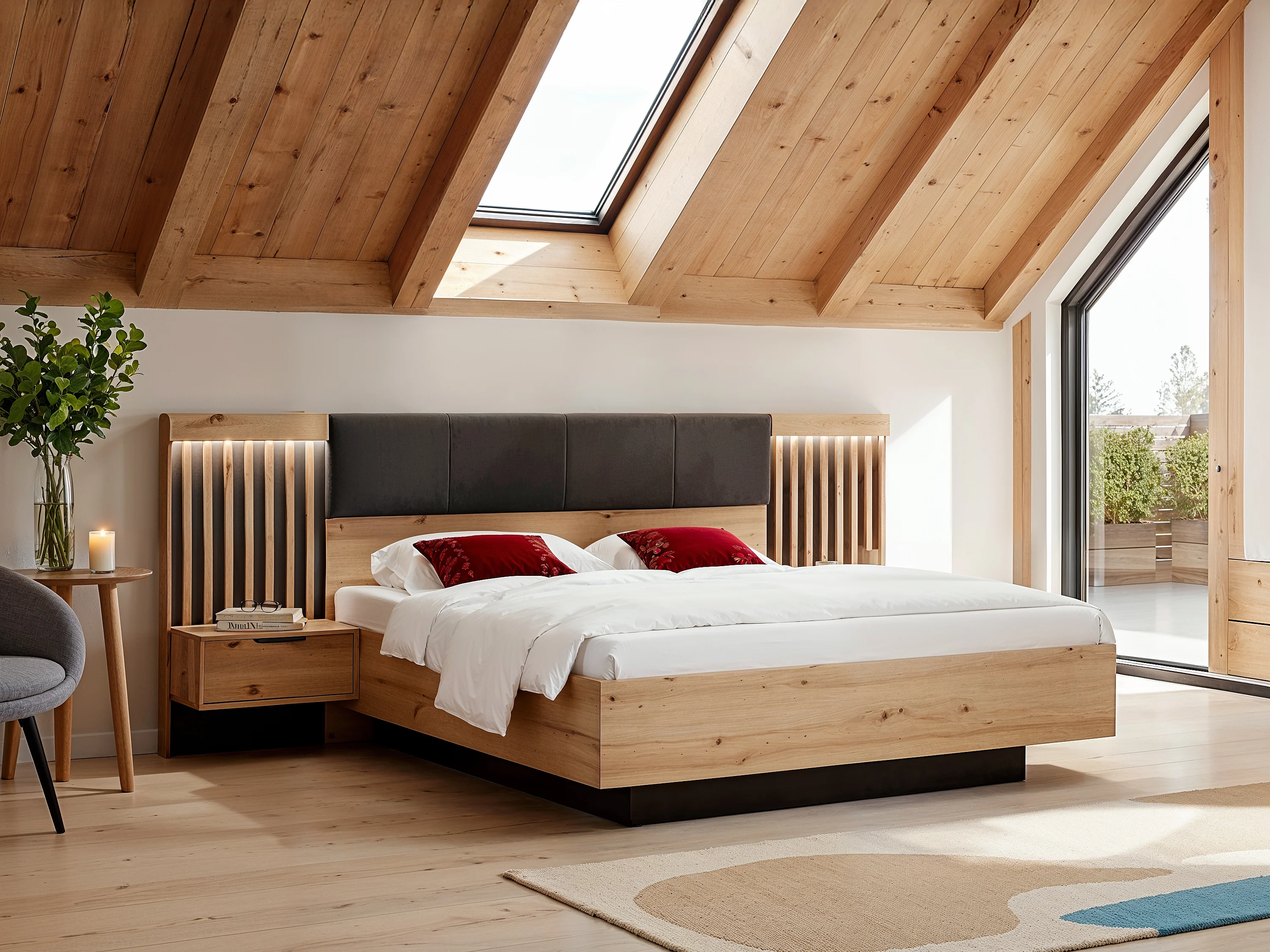 Bett mit Bettkasten - mit Nachttischen & LED-Beleuchtung + Matratze - 160 x 200 cm - Holzfarben & Schwarz - ARIADA