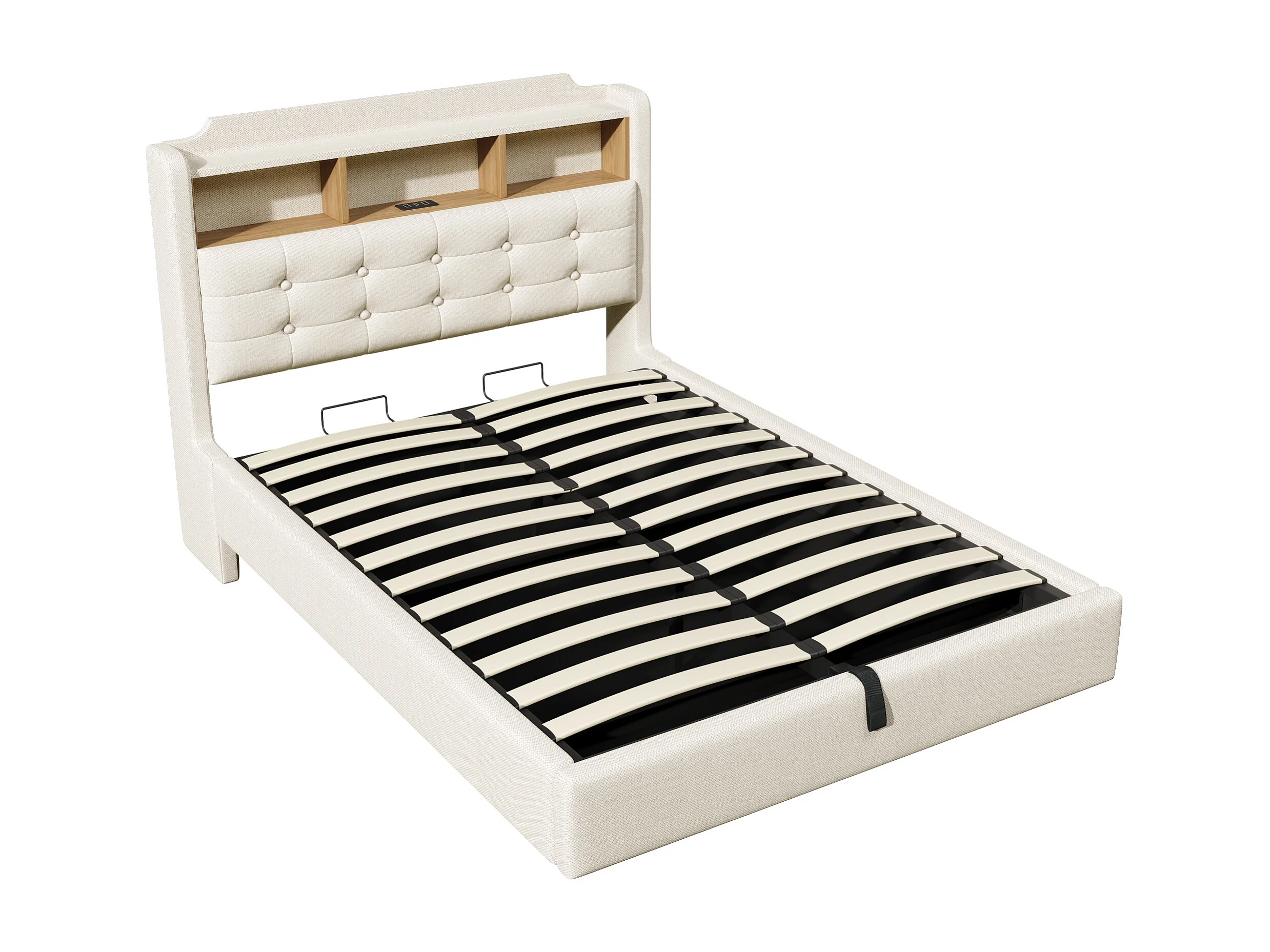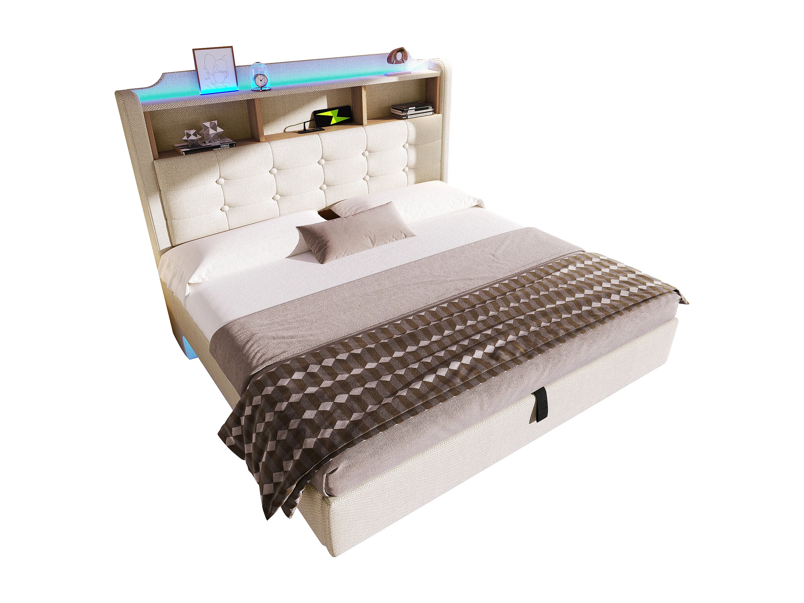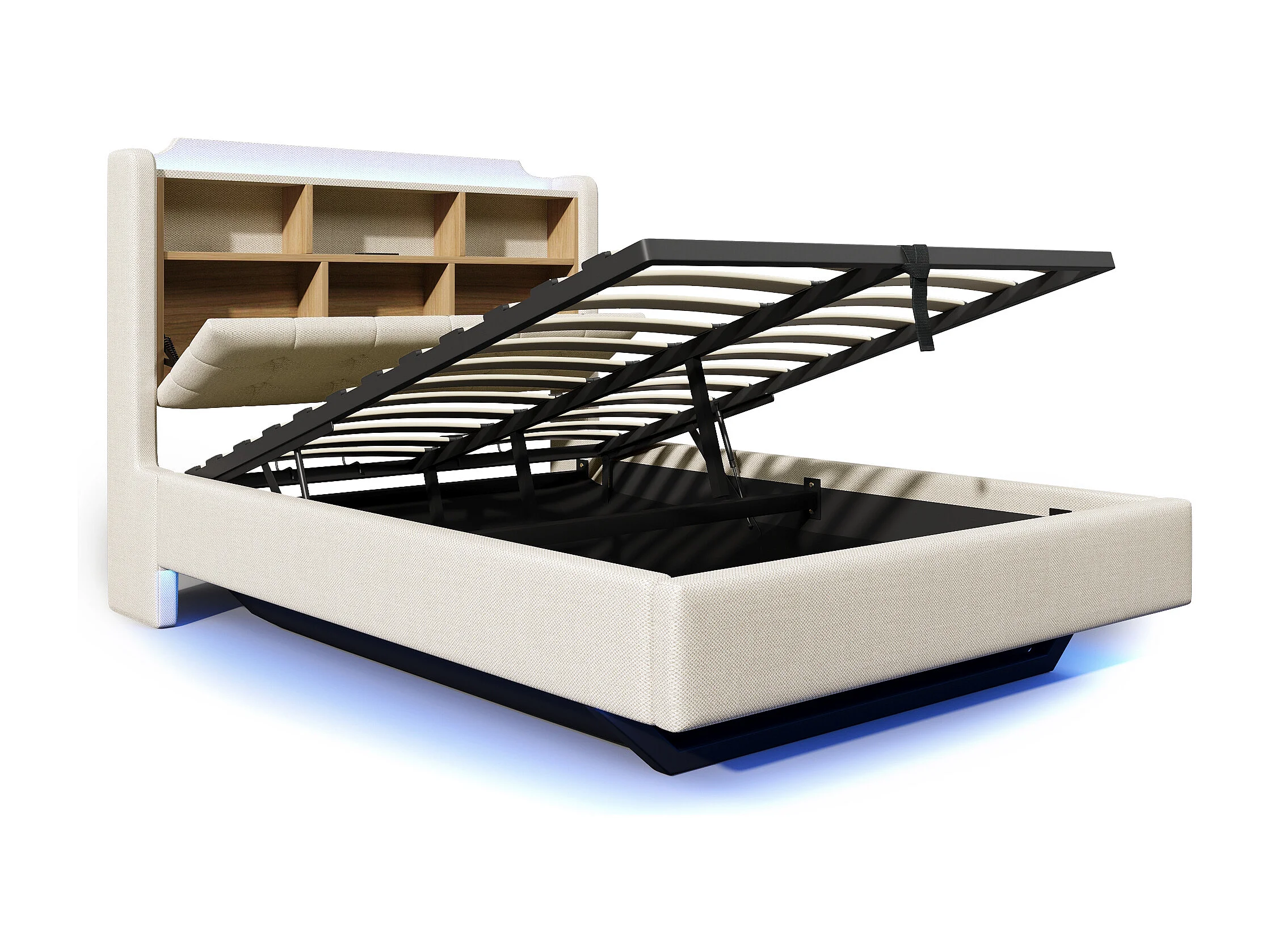 Bett mit Stauraum 140 x 200 cm – mit Kopfteil mit Stauraum und LED-Beleuchtung – beige – Matratze nicht enthalten