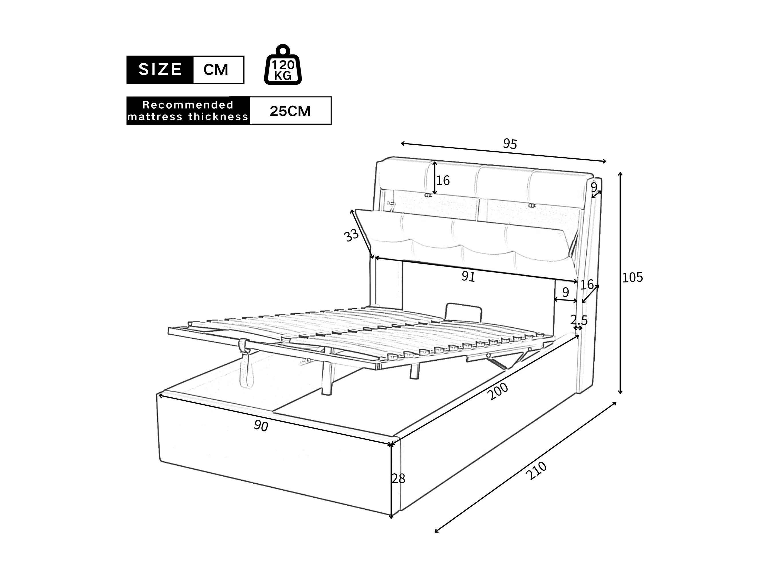 Bett mit Stauraum 90x200 cm - aus Kunstleder - Kopfteil mit Stauraum - Schwarz