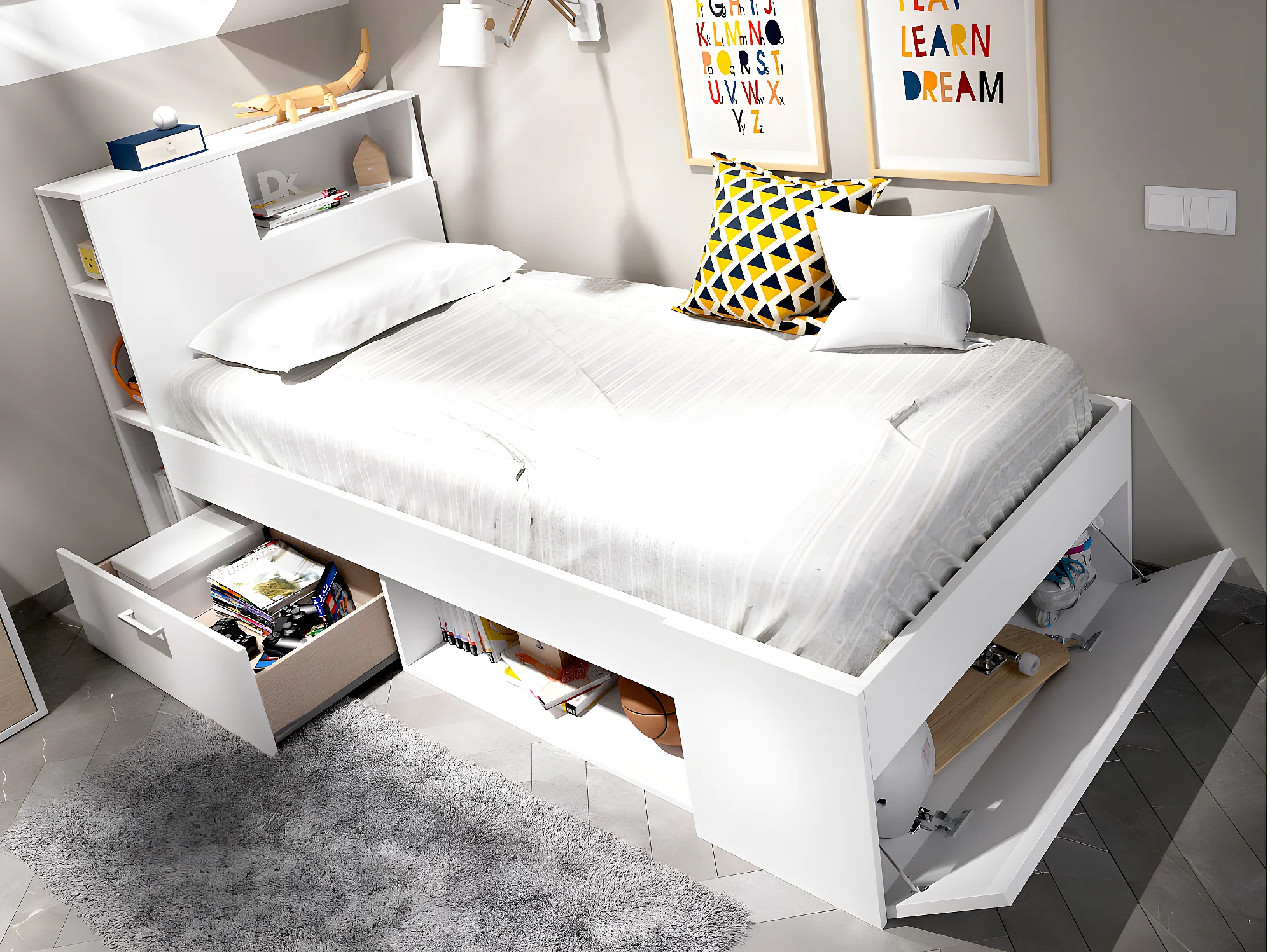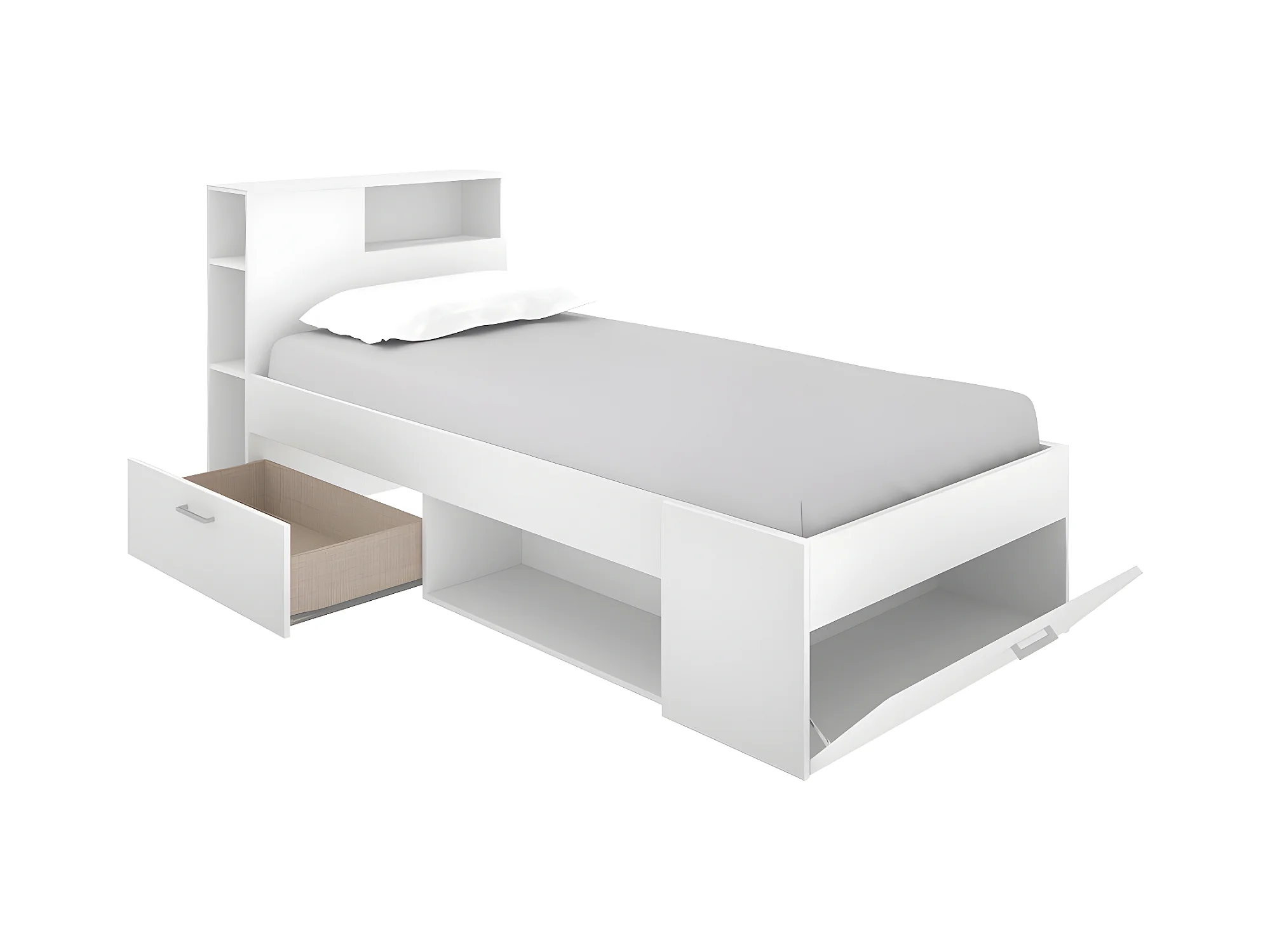 Bett mit Kopfteil, Stauraum & Schublade - 90 x 190 cm - Weiß - LEANDRE