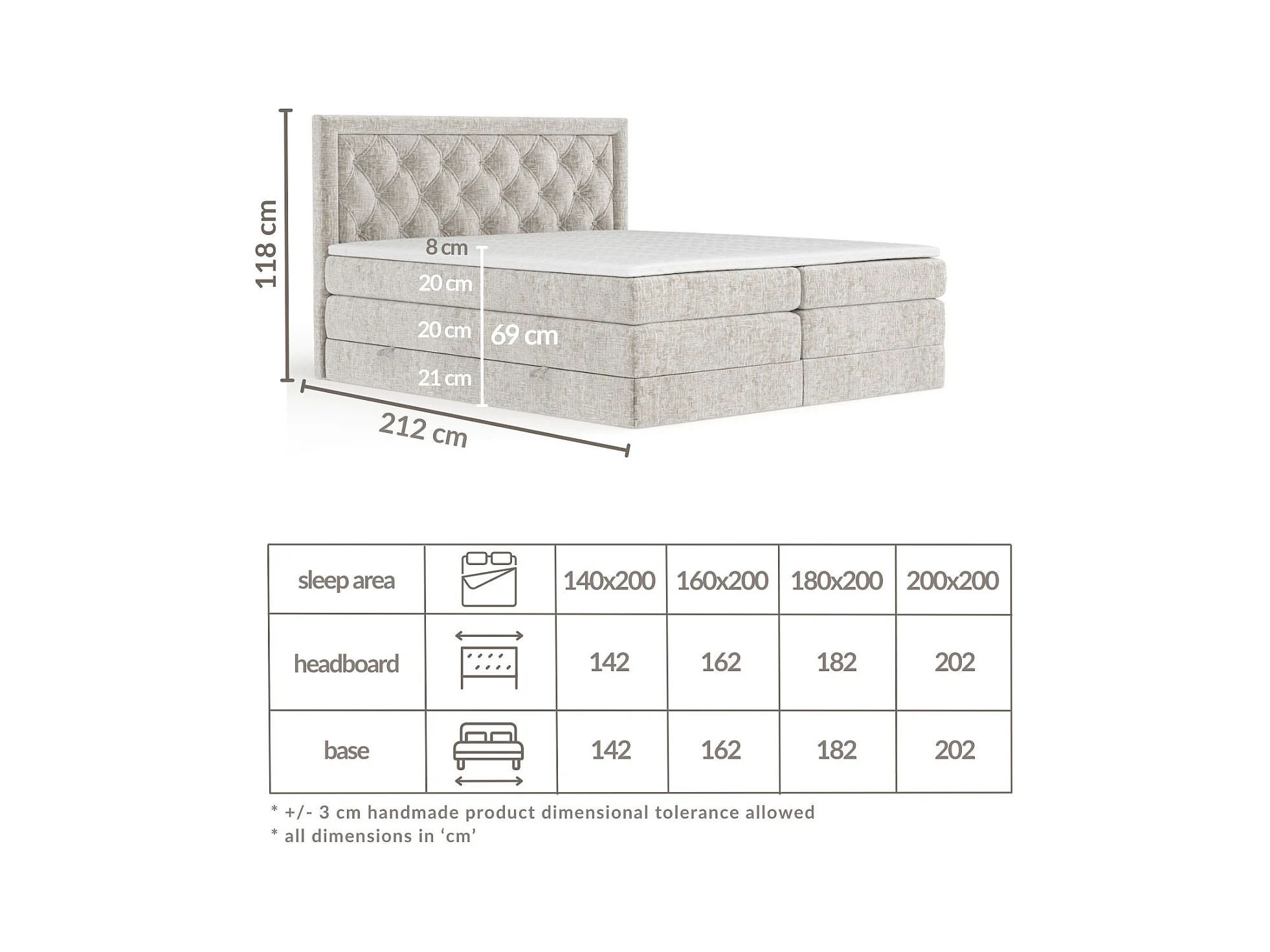 Boxspringbett aus Webstoff Ava - Matratze - Toppermatratze - 200x200 cm - beige