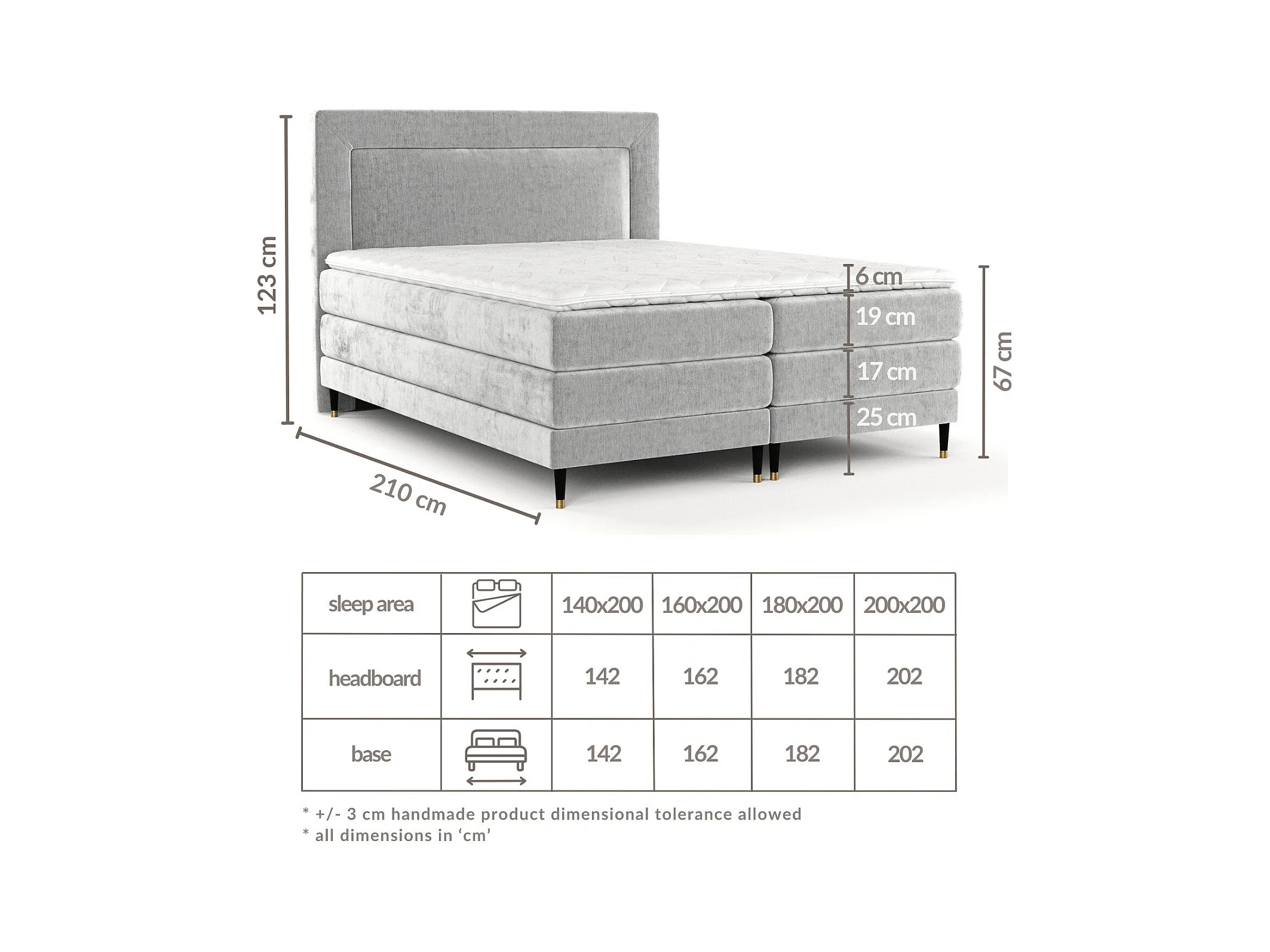 Boxspringbett aus Webstoff Sub - Matratze - Toppermatratze - 180x200 cm - grau