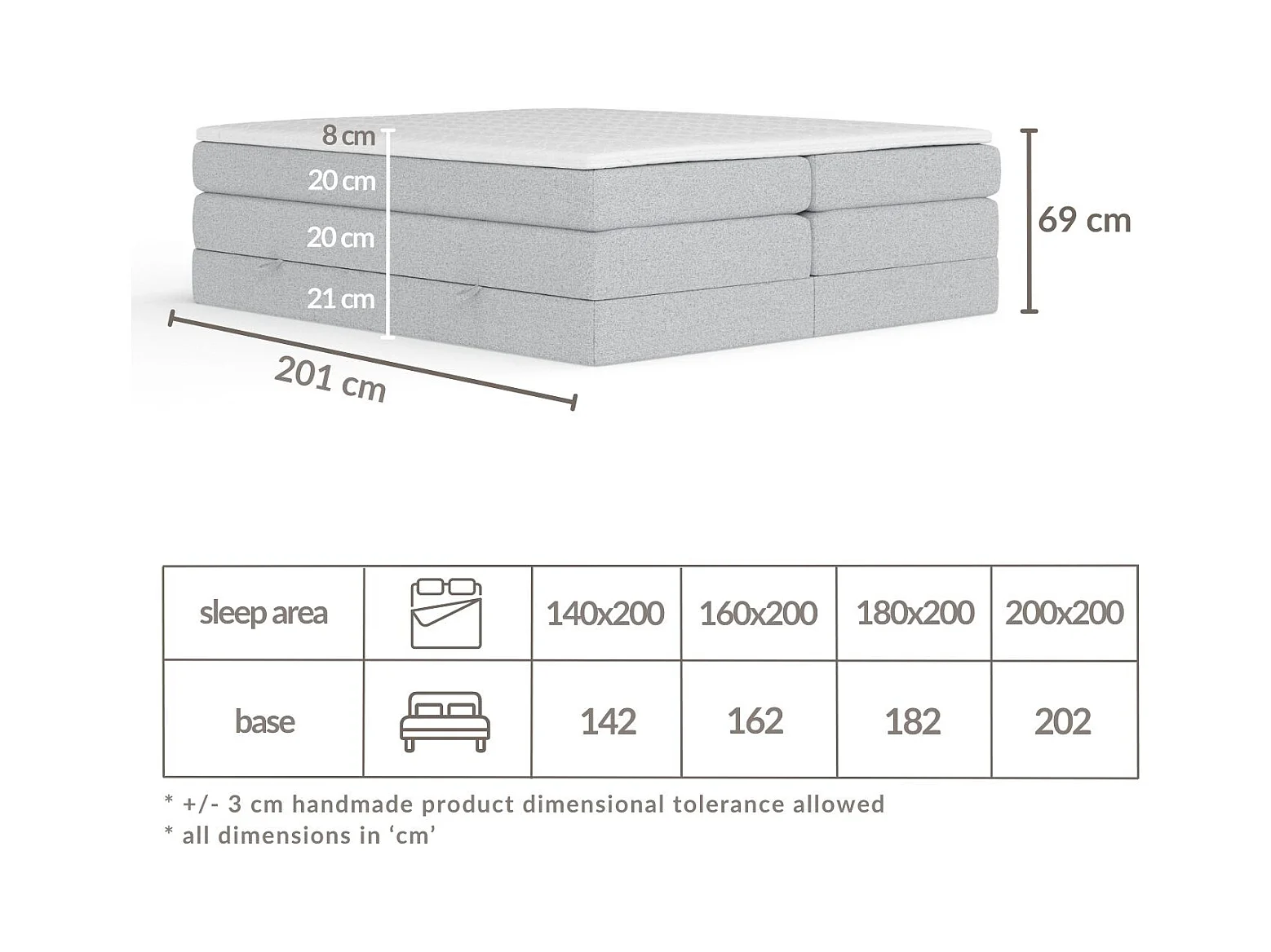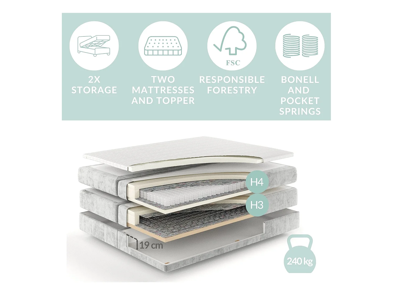 Boxspringbett aus Webstoff Ava - Matratze - Toppermatratze - 200x200 cm - grau