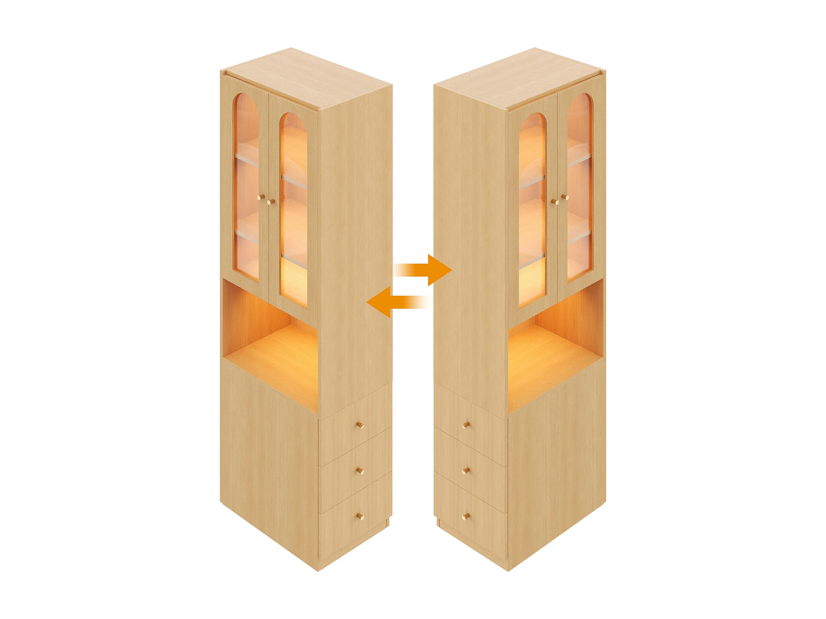 Bücherregal/Vitrine - 60×40×200 cm - 3 Seitenschubladen und 2 Glastüren - LED - Links/rechts umkehrbare Seiten - Natur
