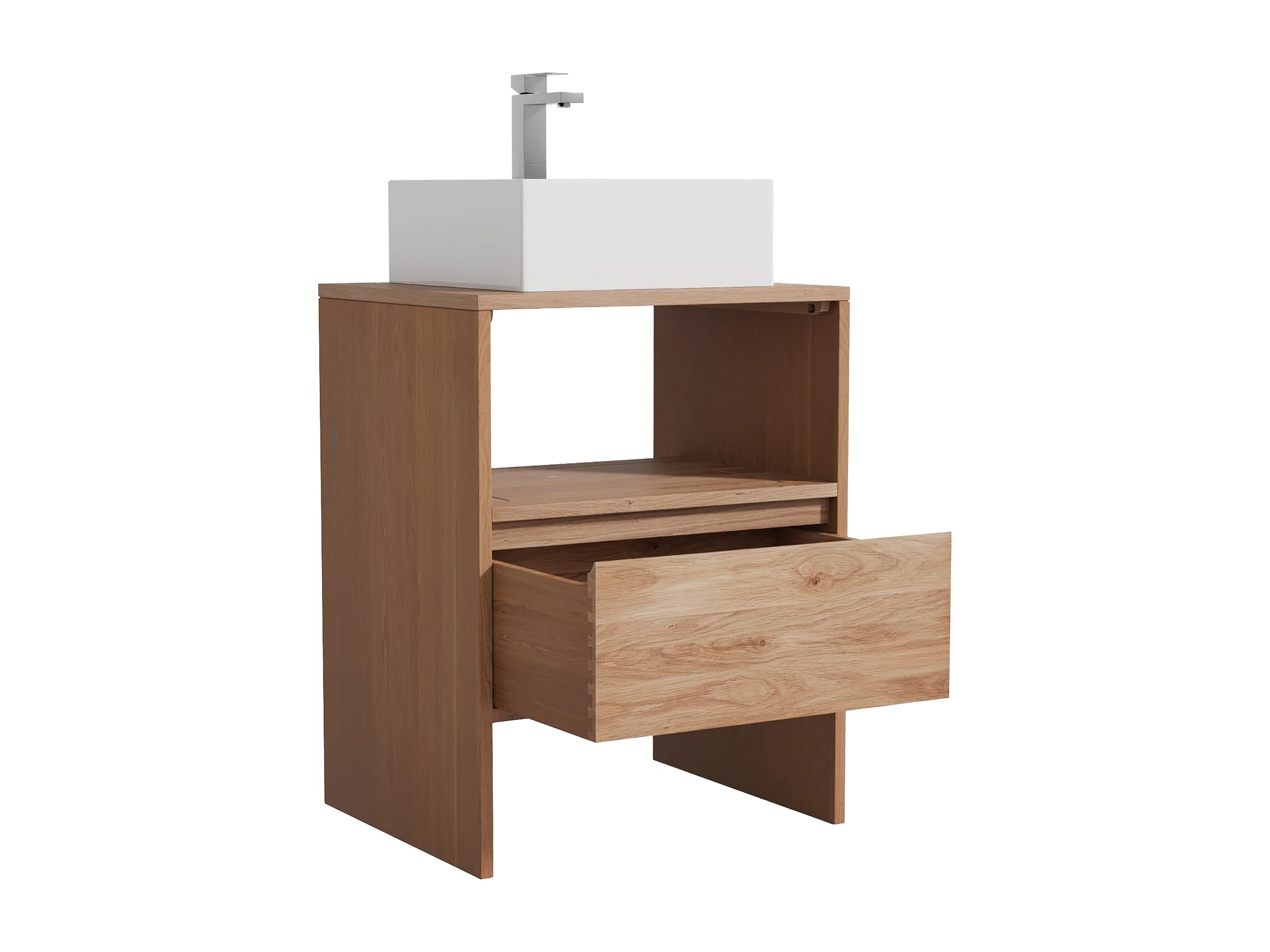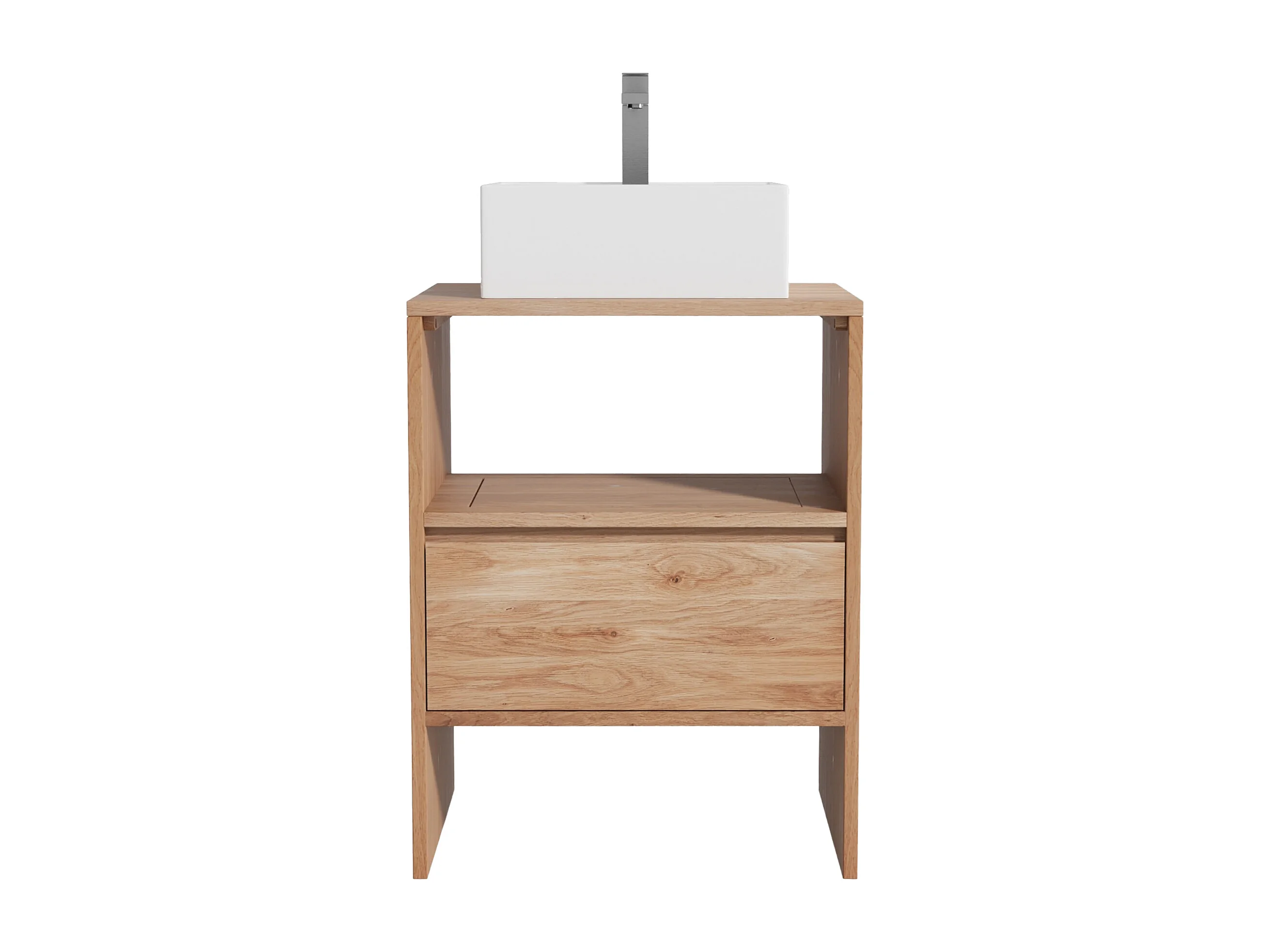 Unterschrank aus Massivholz Eiche mit quadratischem Aufsatzbecken und Armatur - Hell Natur - 60 cm - CAVIZO