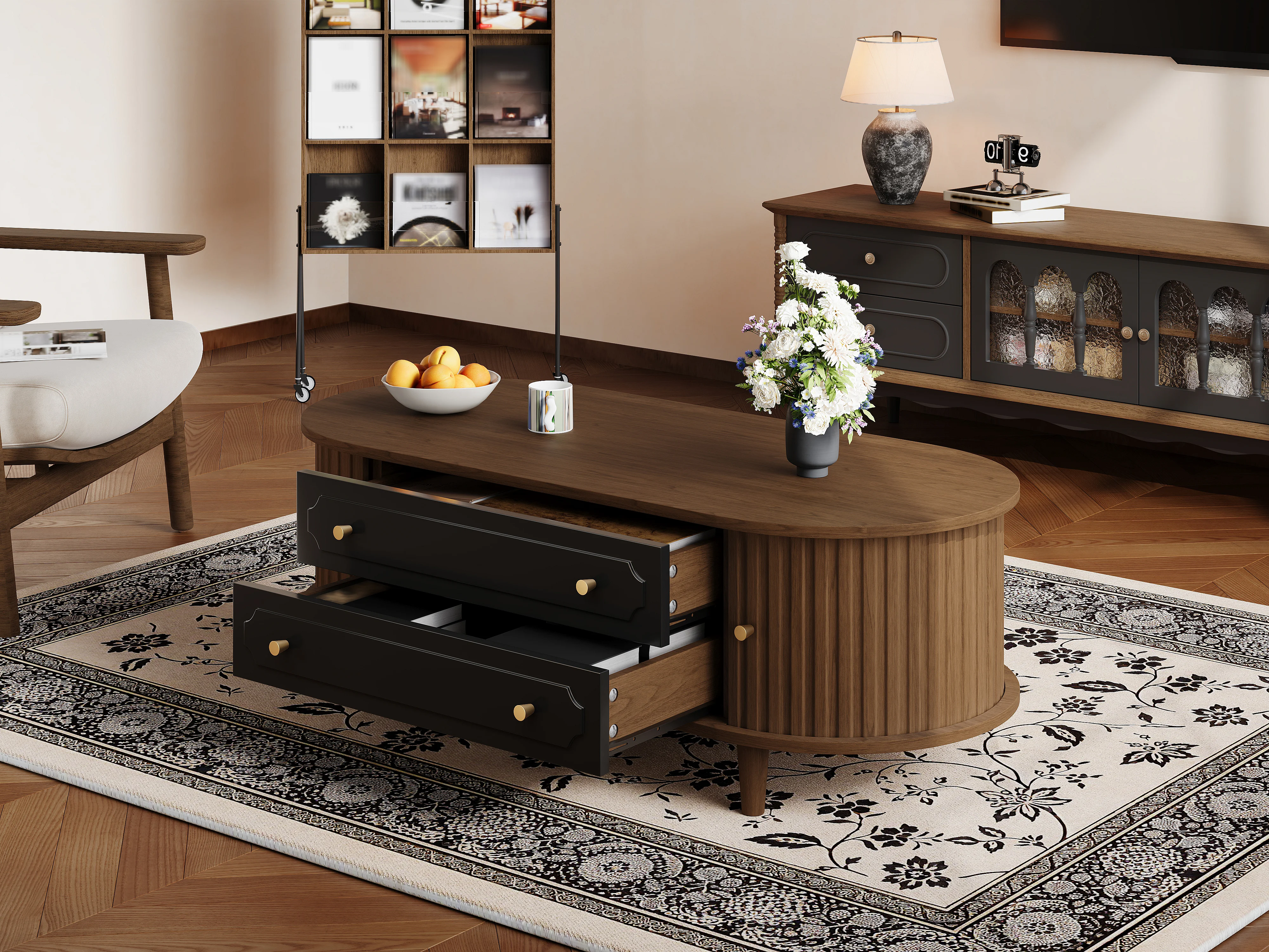 Couchtisch in Walnussoptik – 100 x 50 x 36 cm – mit 2 Schubladen und Rolltür – Spanplatte – braun