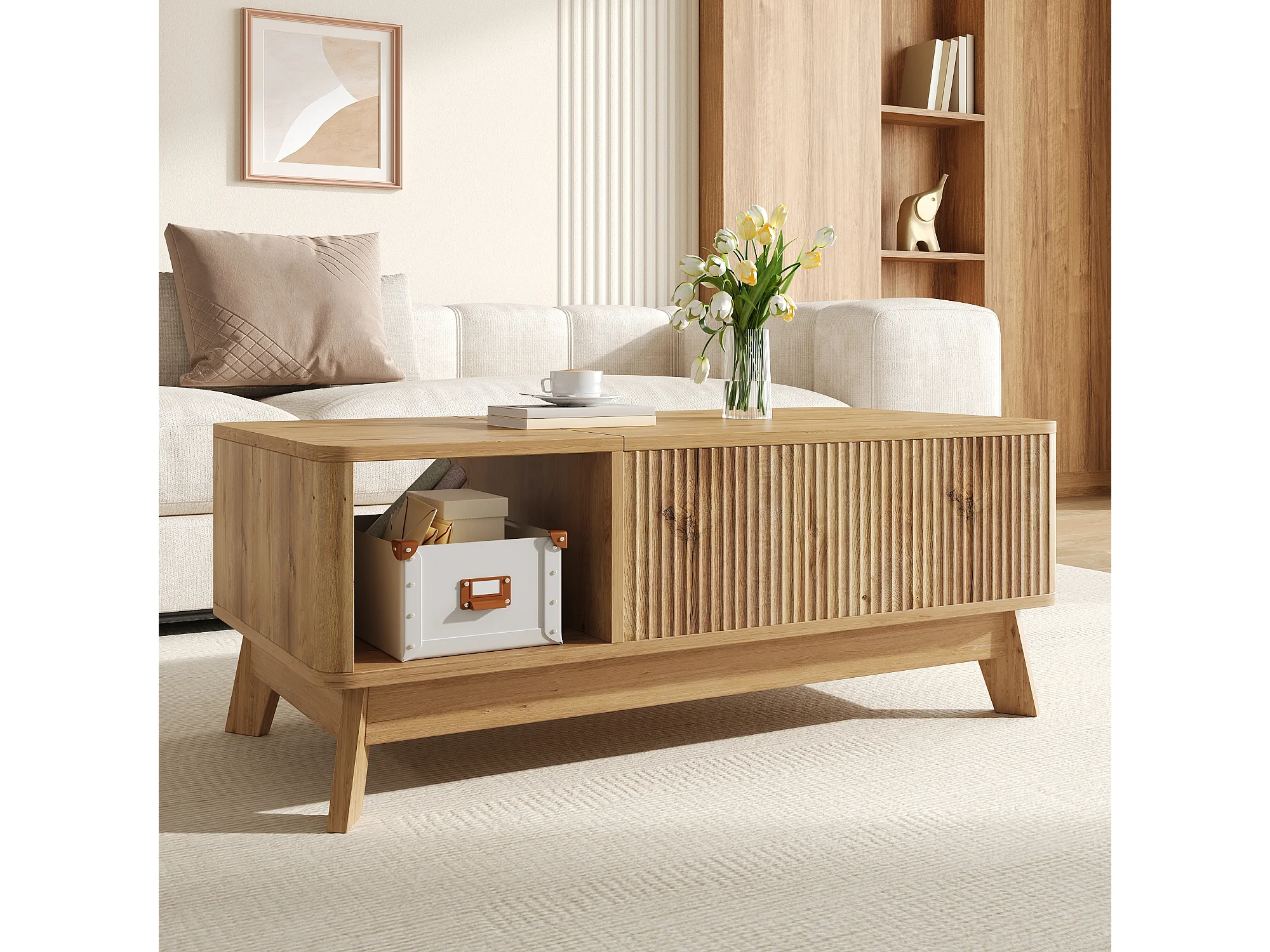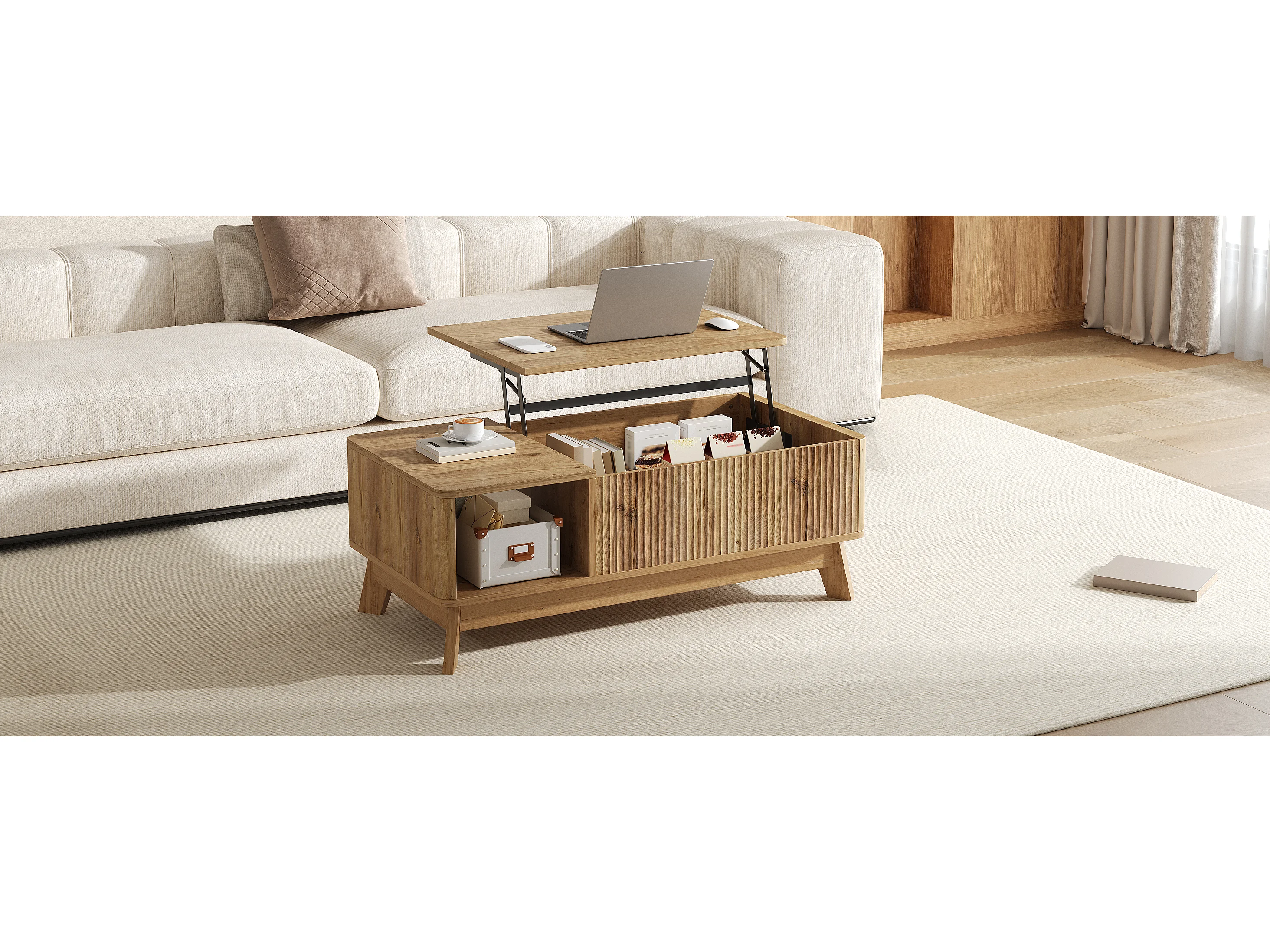 Couchtisch mit Hubfunktion fürs Wohnzimmer – 95 x 48 x 50 cm – Wellenförmiges Design – mit offenem Seitenstauraum – MDF – Natur