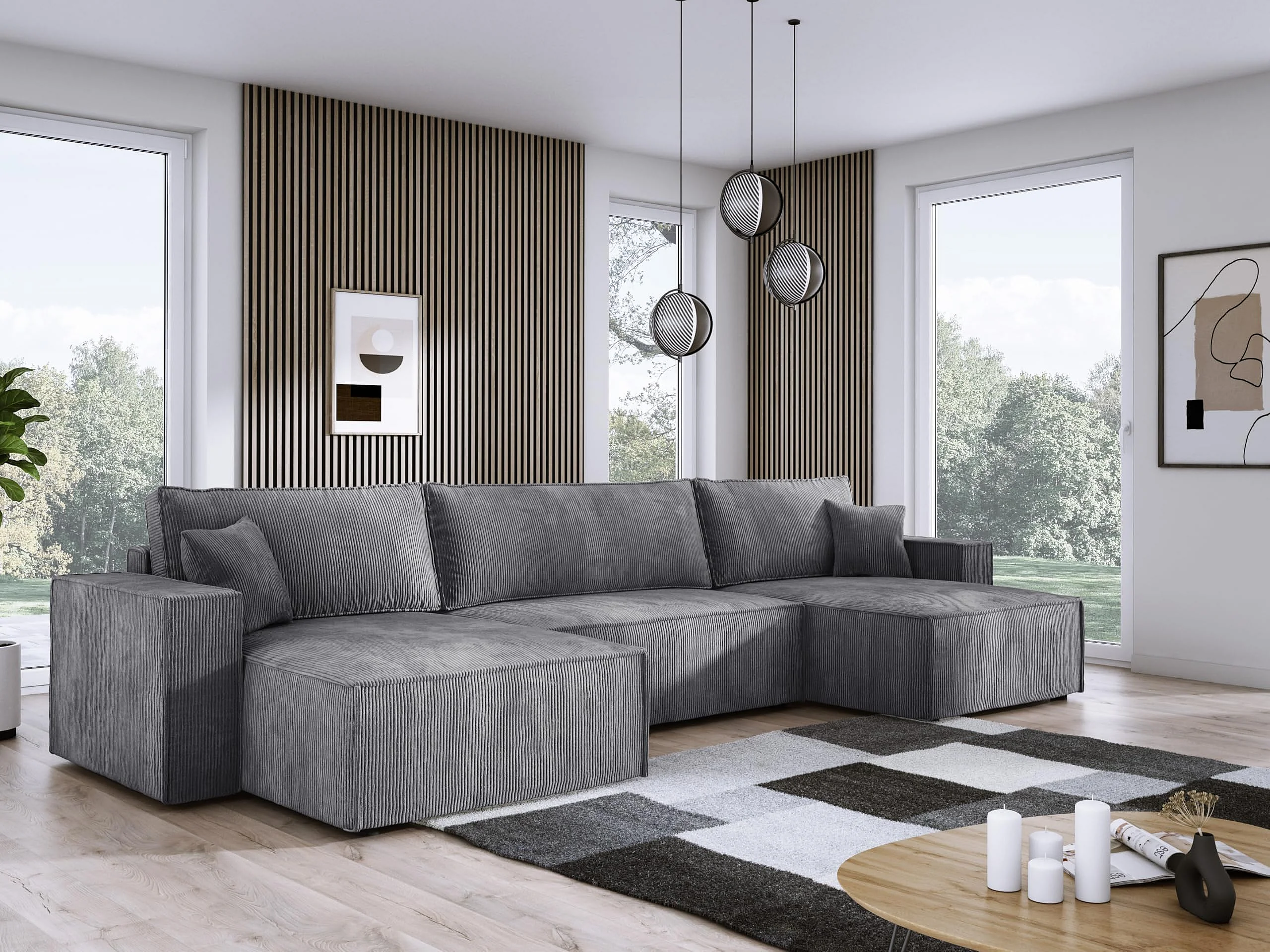 Plaza Ecksofa U-Form - Rechte Seite, Schlaffunktion, Verstellbare Kopfstützen, Wellenfedersystem, Hochelastischer Schaum, 385x216 cm, Grau