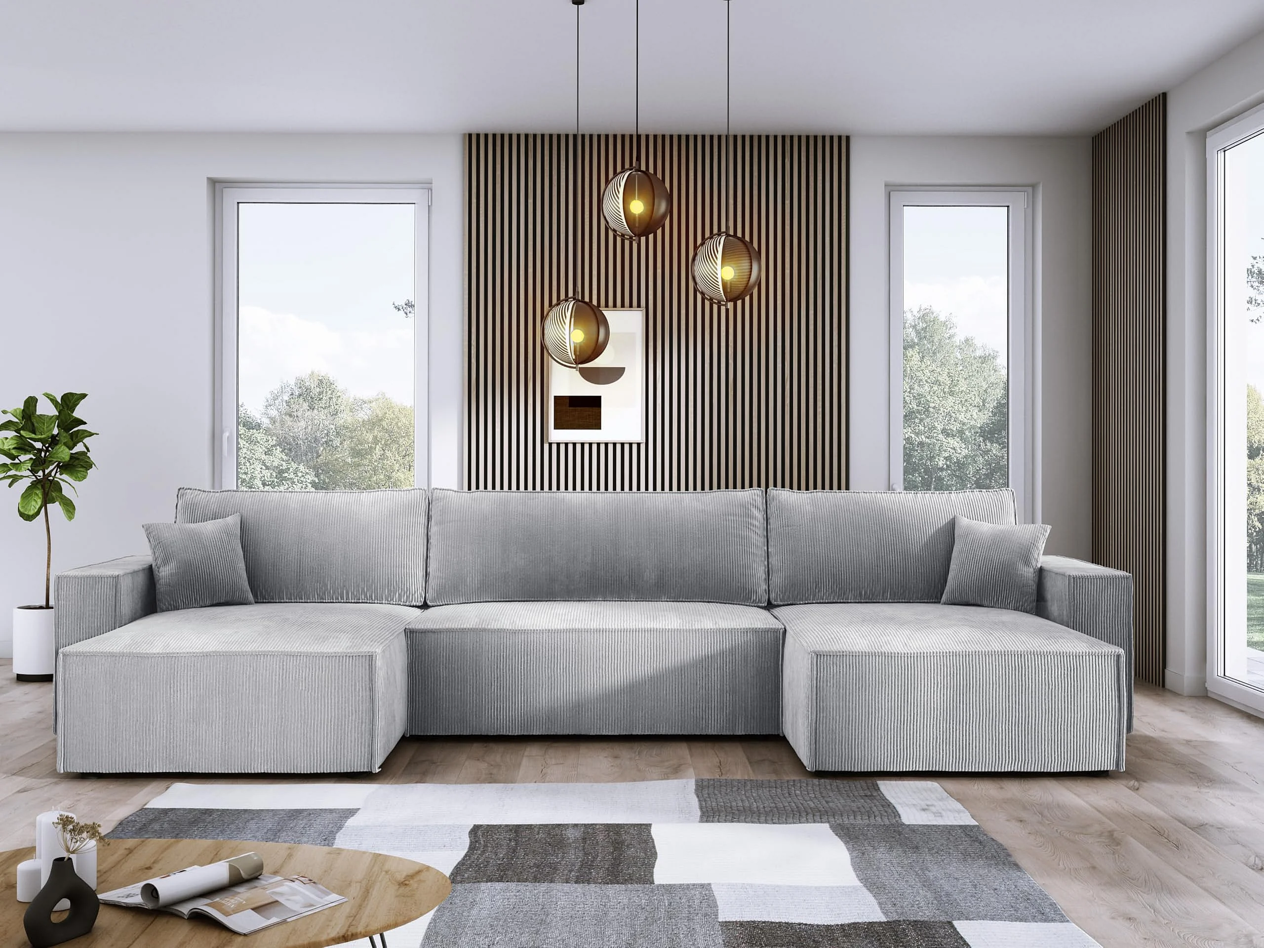 Plaza Ecksofa U-Form - Rechte Seite, Schlaffunktion, Verstellbare Kopfstützen, Wellenfedersystem, Hochelastischer Schaum, 385x216 cm, Esche