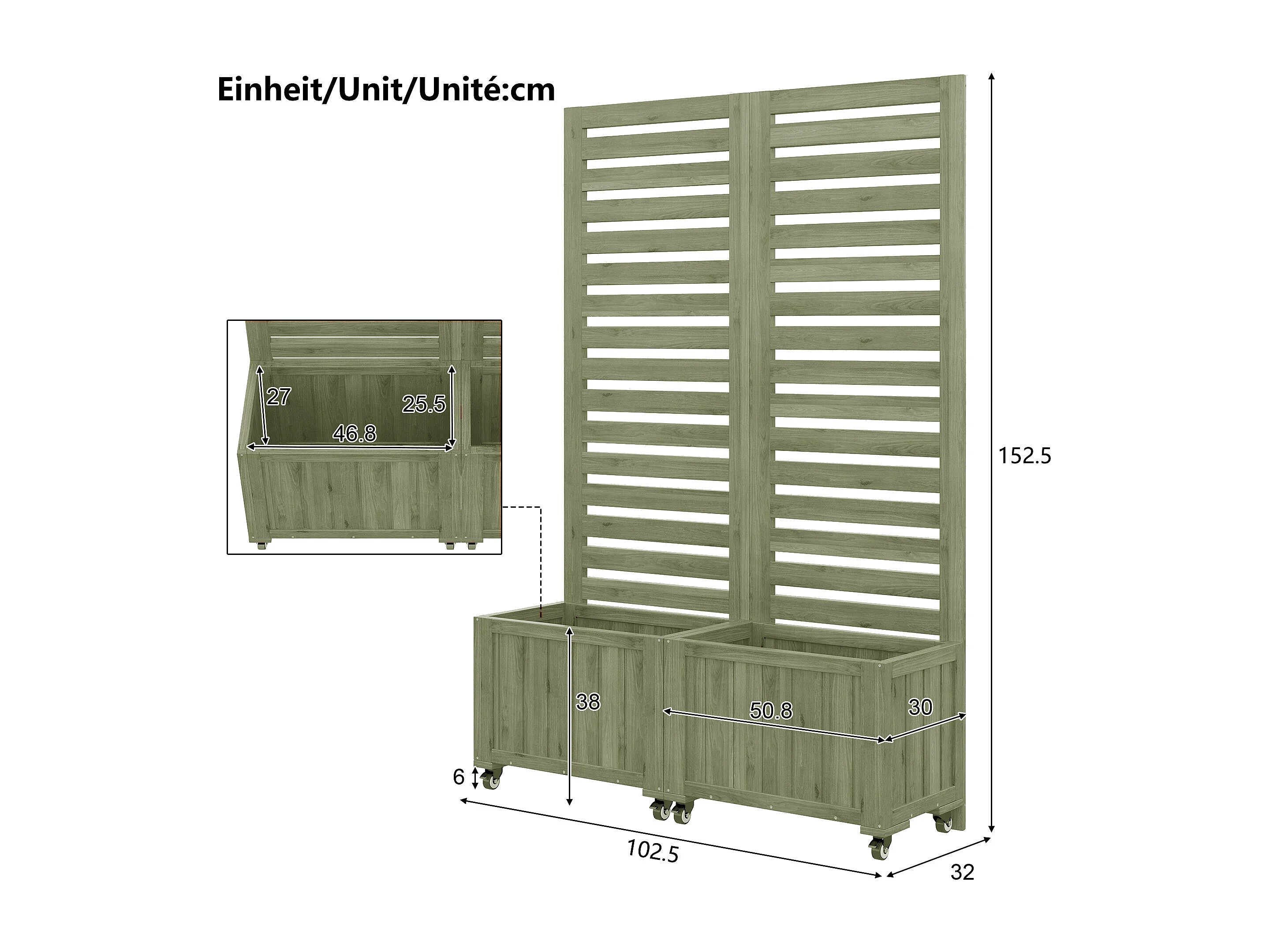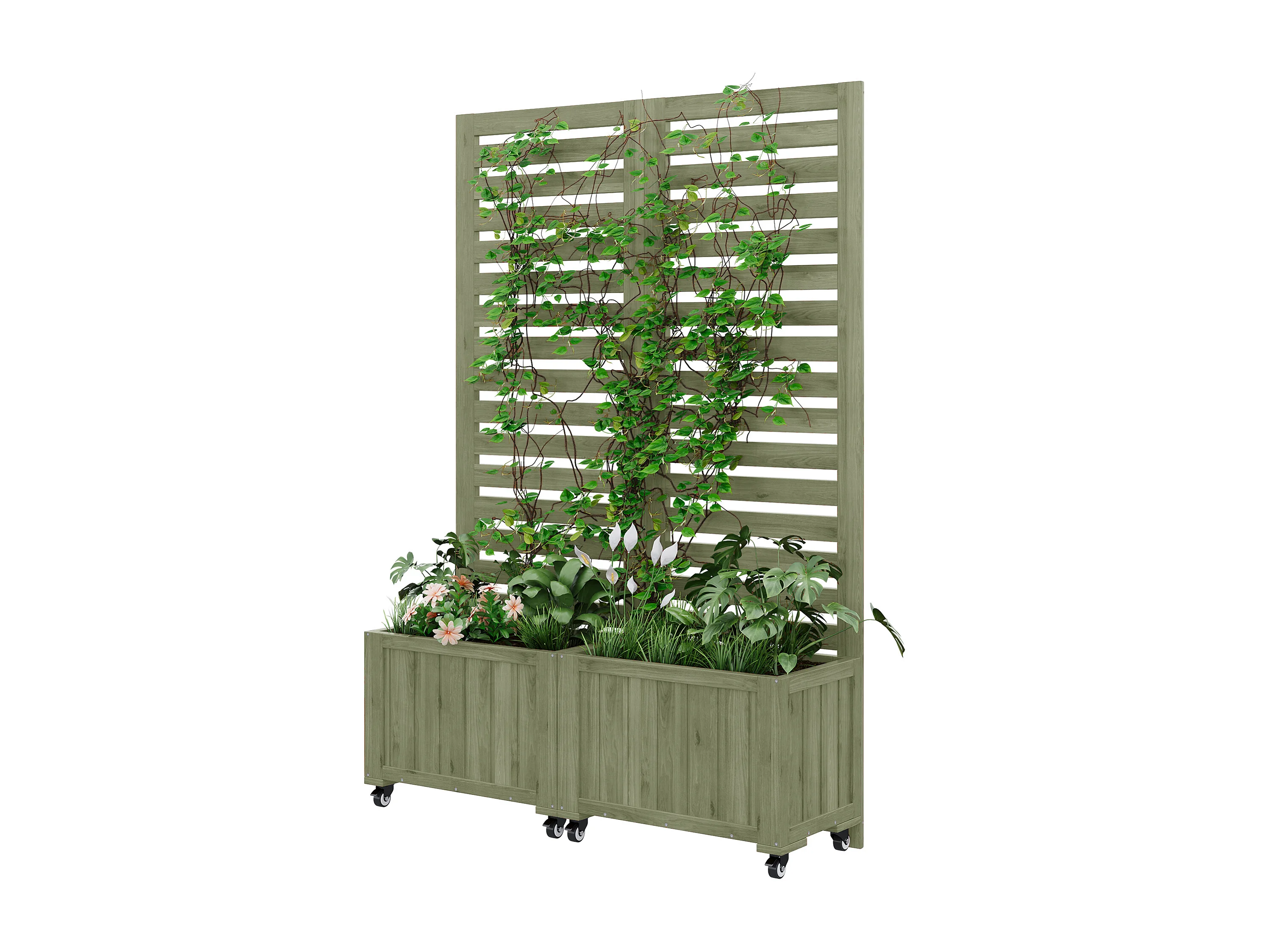 Doppelte Pflanzkiste mit Rankgitter aus Massivkiefer - Mobiler Sichtschutz auf Rollen - 102 x 32 x 152 cm - Salbeigrün