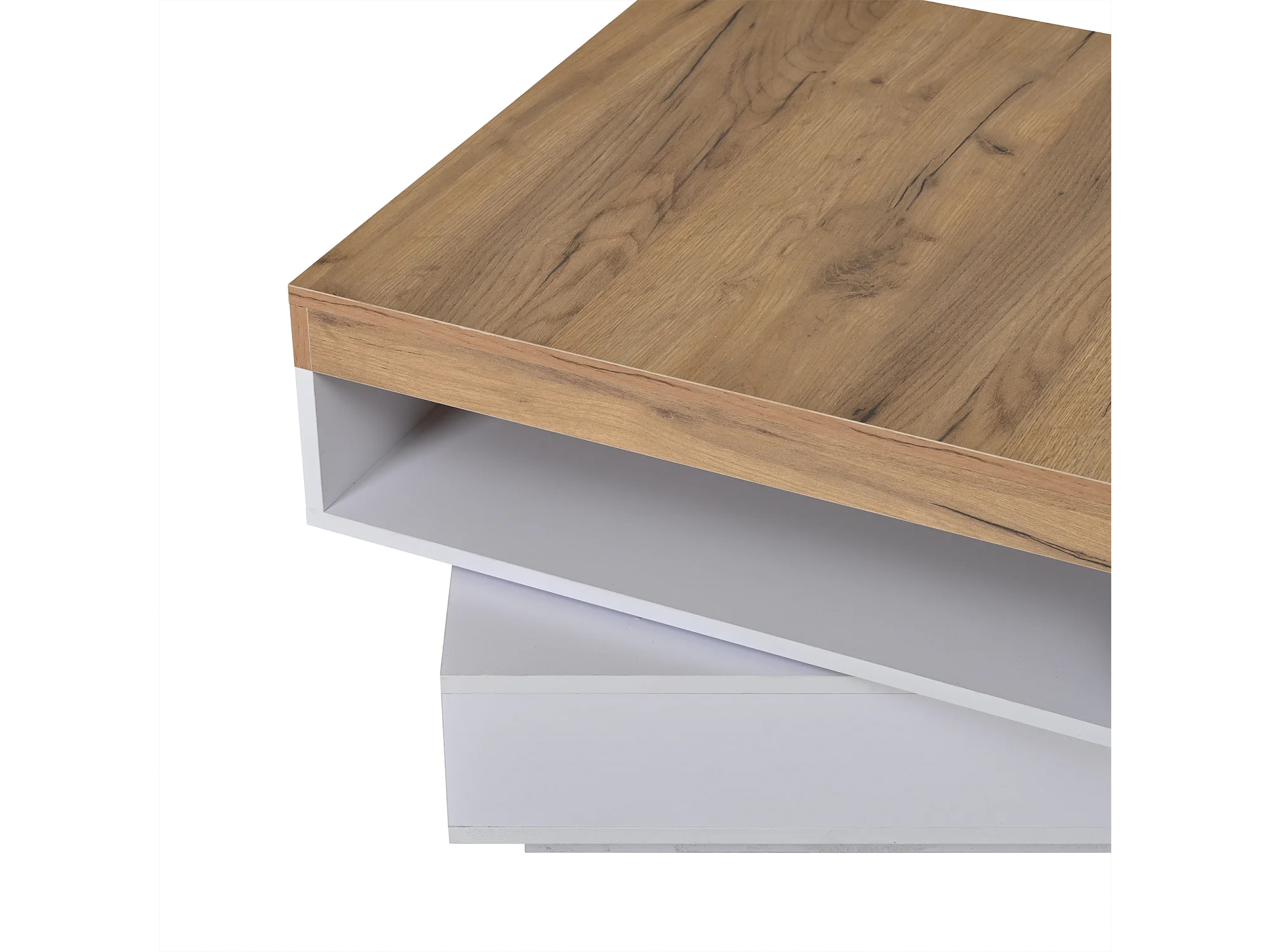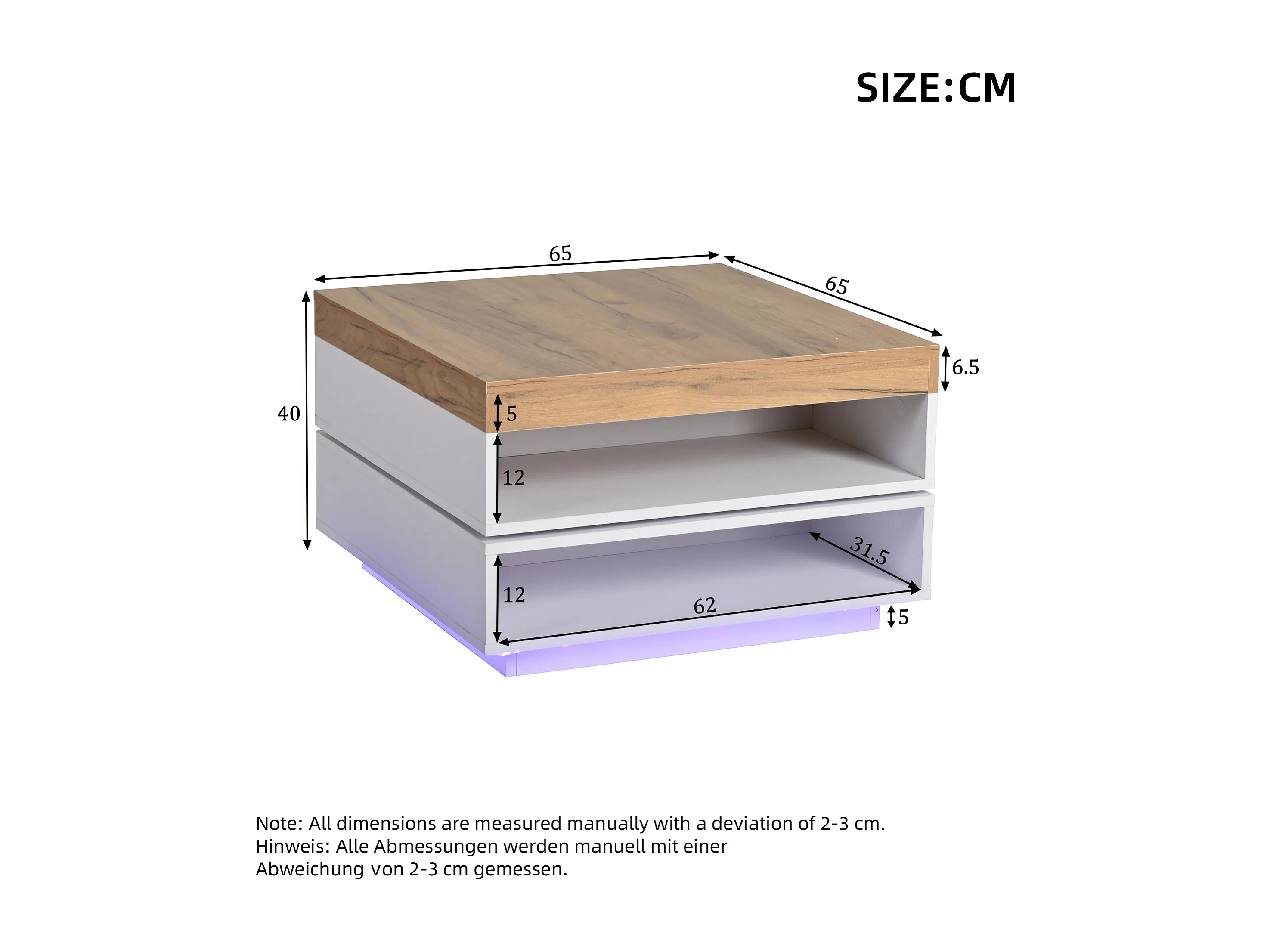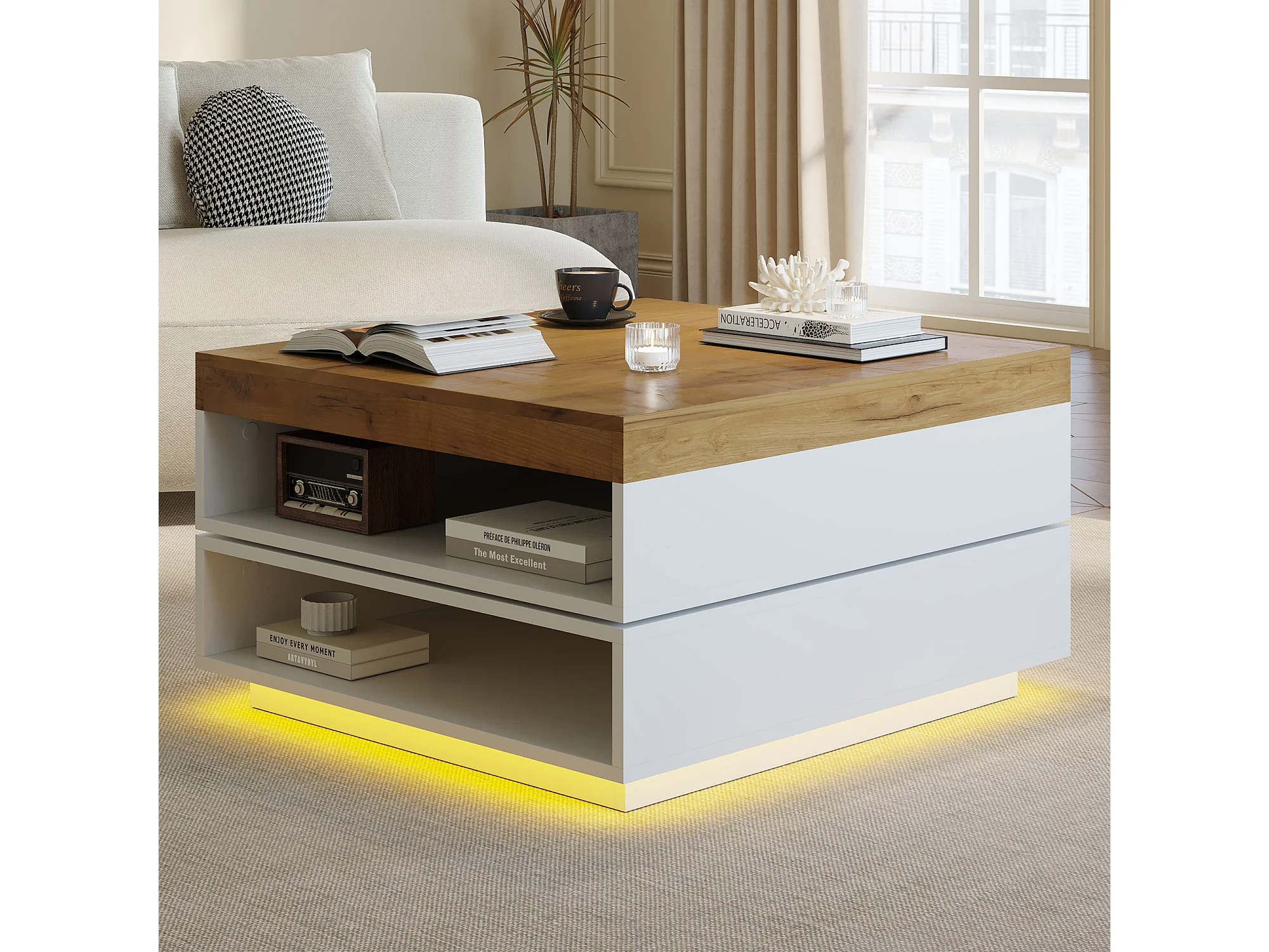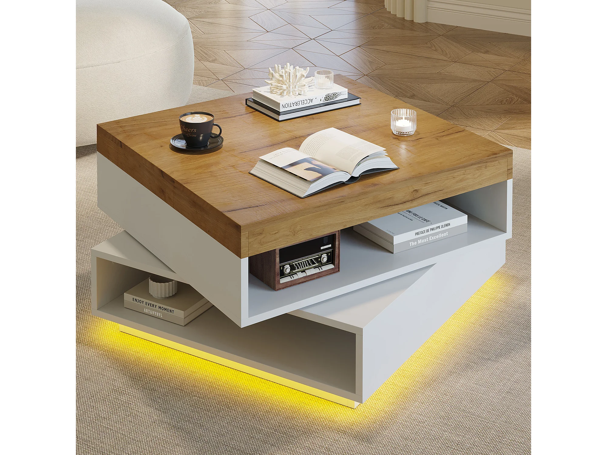 Drehbarer quadratischer Beistelltisch 65x65x40 cm - 360° drehbarer Tischplatte - LED-Beleuchtung und Stauraum - MDF - Weiß + Natur